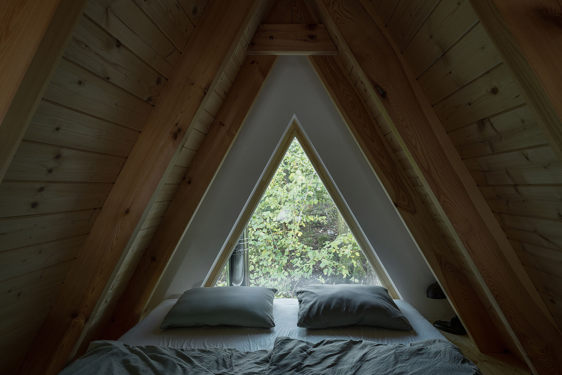 Interiér je v polovině rozdělený příčkou na kuchyňský prostor a koupelnu. Nad kuchyňkou černé barvy je umístěna kovová konstrukce k zavěšení náčiní. Nachází se zde i kamna na dřevo značky Moravia. Koupelna nabízí sprchový kout, toaletu a umyvadlo, vše v bílé barvě. Snídani u dřevěného stolu s bílými židlemi provází uklidňující výhled ven. V horní části chaty se nachází otevřená ložnice pro dvě osoby, cesta k ní vede přes dřevěný žebřík. „Je to pro mě splněný sen, do kterého jsem vložil spoustu úsilí, a pojí mně k němu silné citové pouto. Vše to ale stálo za to. Toto místo jsem vybudoval hlavně pro svoji rodinu, ale budu velmi rád, když sem přijedou sdílet stejné hodnoty i jiní hosté,“ uzavírá majitel.