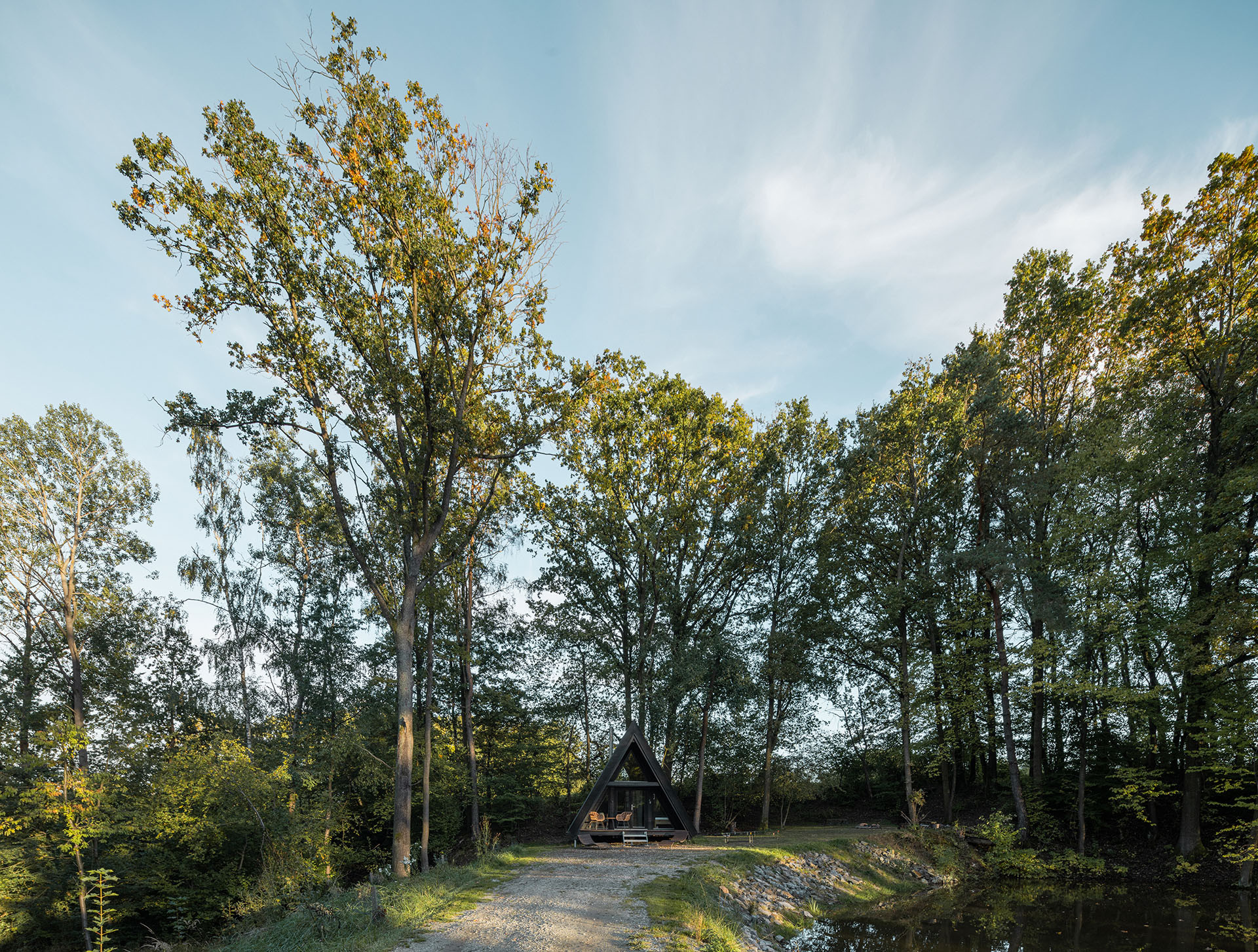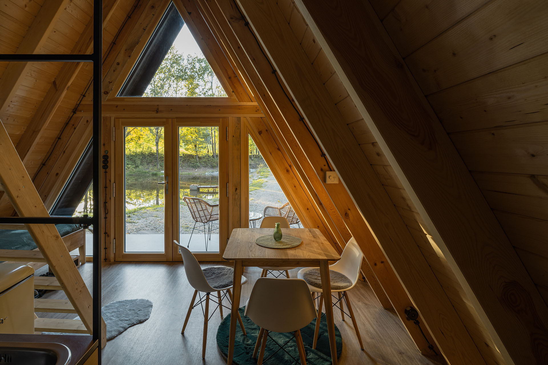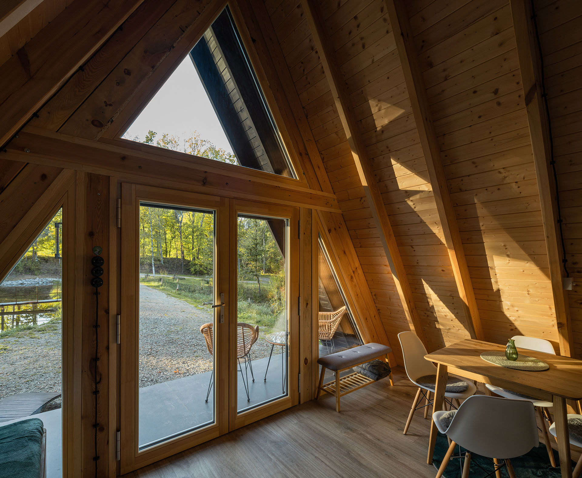 Dominantním prvkem stavby se stala trojúhelníková sestava oken a vchodových dveří černé barvy, která vytváří prosklený štít z čelní strany objektu. Ten poskytuje interiéru dostatek světla a opticky jej propojuje s okolní přírodou. Vnější tmavý odstín odpovídá barevnému tónu exteriéru chatky. Z vnitřní strany je dřevo opatřeno transparentní lazurou, která nechá vyniknout jeho přirozené kráse. „V tomto případě byly vybrány dřevěné prvky z řady VEKRA NATURA. Vyznačují se výbornou tvarovou stabilitou a poskytují více možností atypických tvarů. Vícestupňová povrchová úprava je z vnitřní strany posílená o speciální membránový nástřik, takže jsou výborně chráněná před vlhkostí, což se zde nabízelo, vzhledem k blízkosti rybníka,“ vysvětluje Ing. Milena Tomčíková, ředitelka vývoje a produktů společnosti VEKRA, největšího českého dodavatele oken a stínění na klíč.