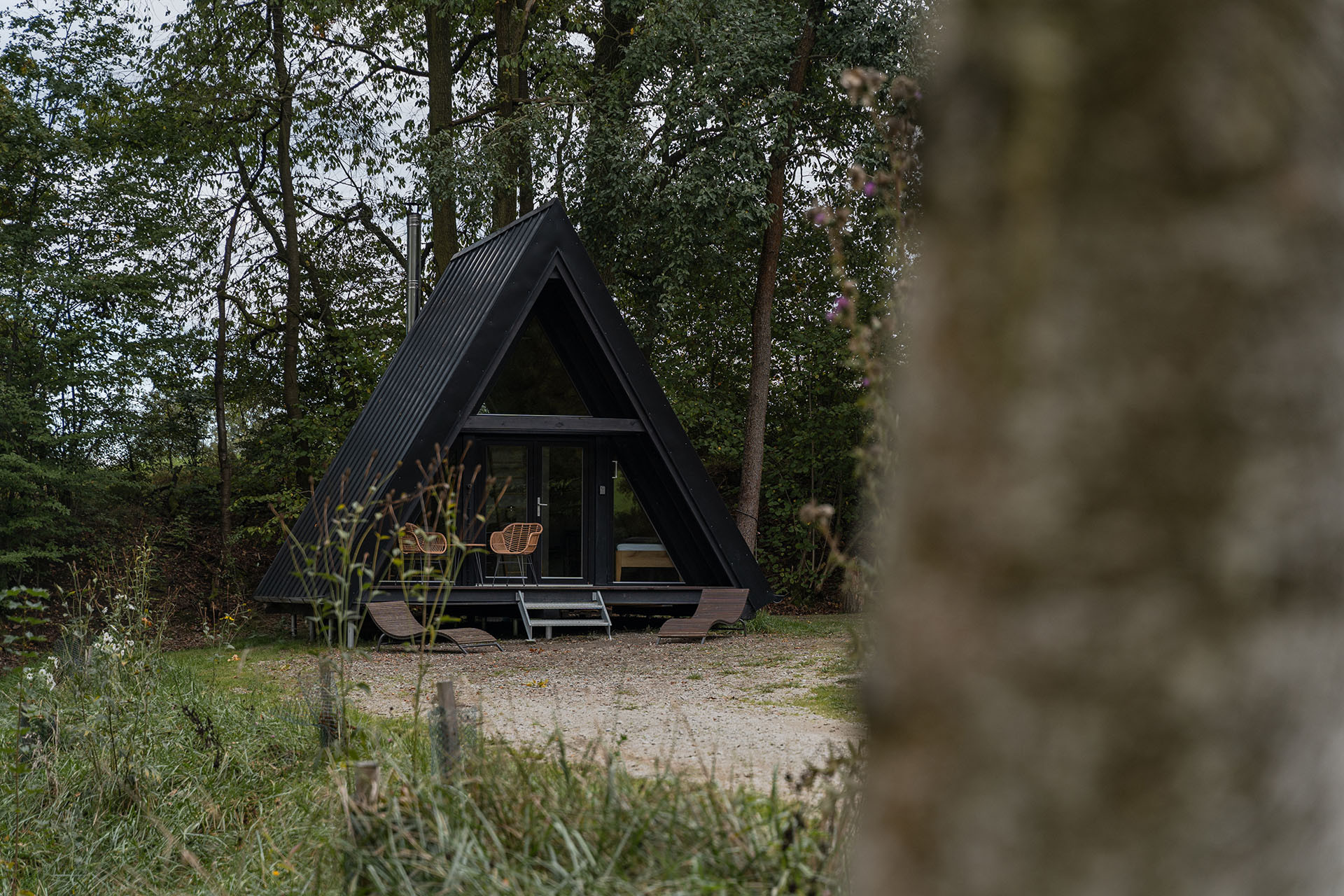 Chatku si sám navrhl a postavil způsobem suché stavby. Díky tomu se celý proces výrazně zrychlil. „Velice si zakládáme na přírodních materiálech, což ani zde nebylo výjimkou. Pro celkový vzhled exteriéru chatičky jsme zvolili černou barvu. Chtěli jsme tím docílit minimalistického a vůči okolní přírodě nerušivého vzhledu,“ popisuje majitel. Hlavním materiálem pro stavbu se stalo borovicové dřevo z jeho vlastních zdrojů. K hrubé stavbě přizval na výpomoc firmu Teklepo. Boční strany chaty, jenž zároveň slouží jako střecha, jsou z falcovaného plechu černé barvy.