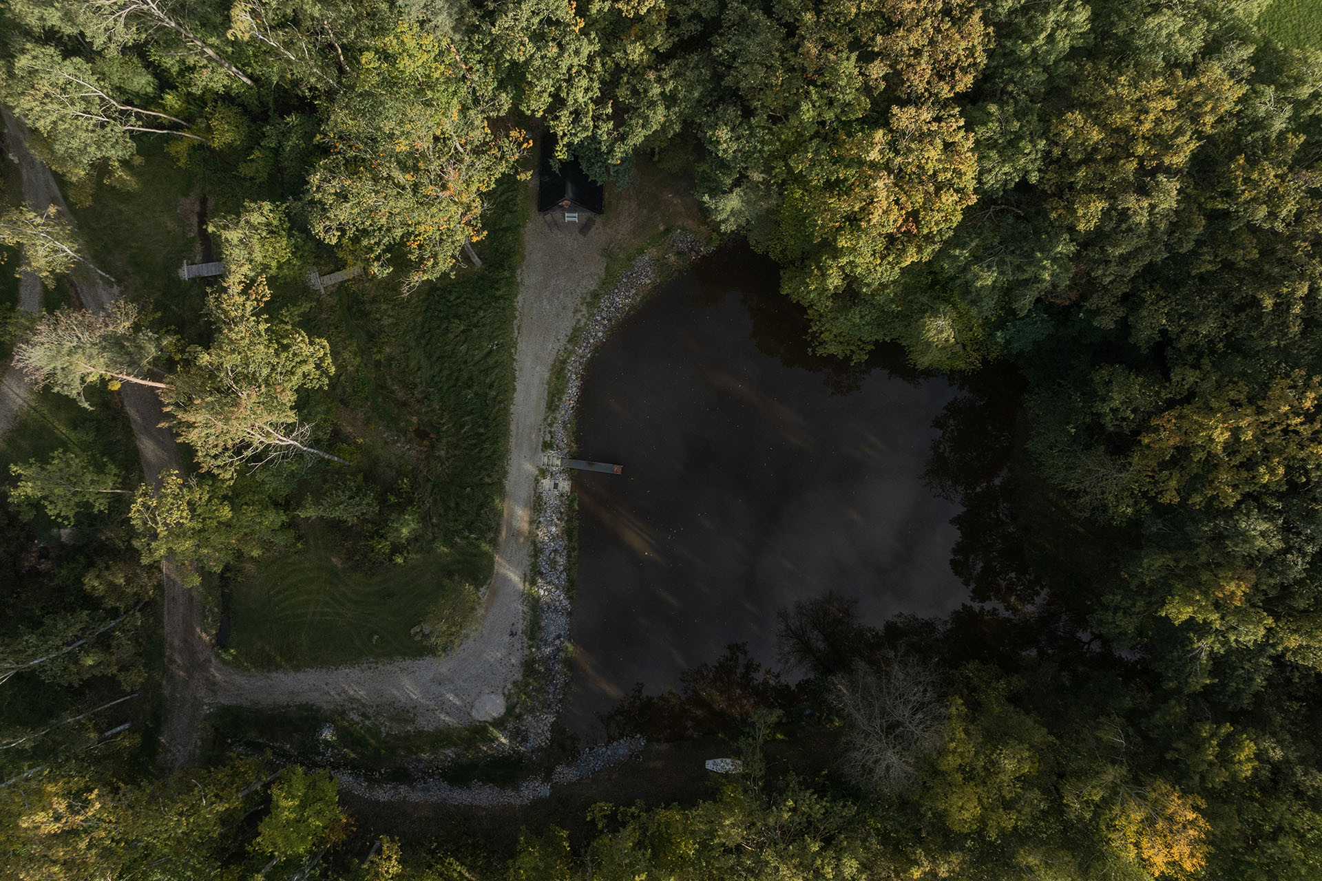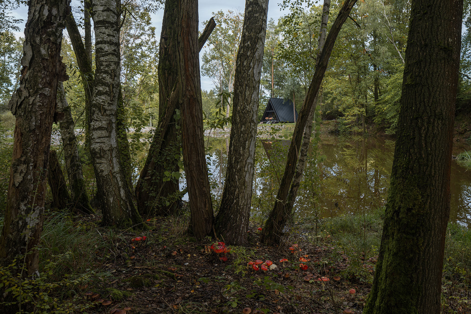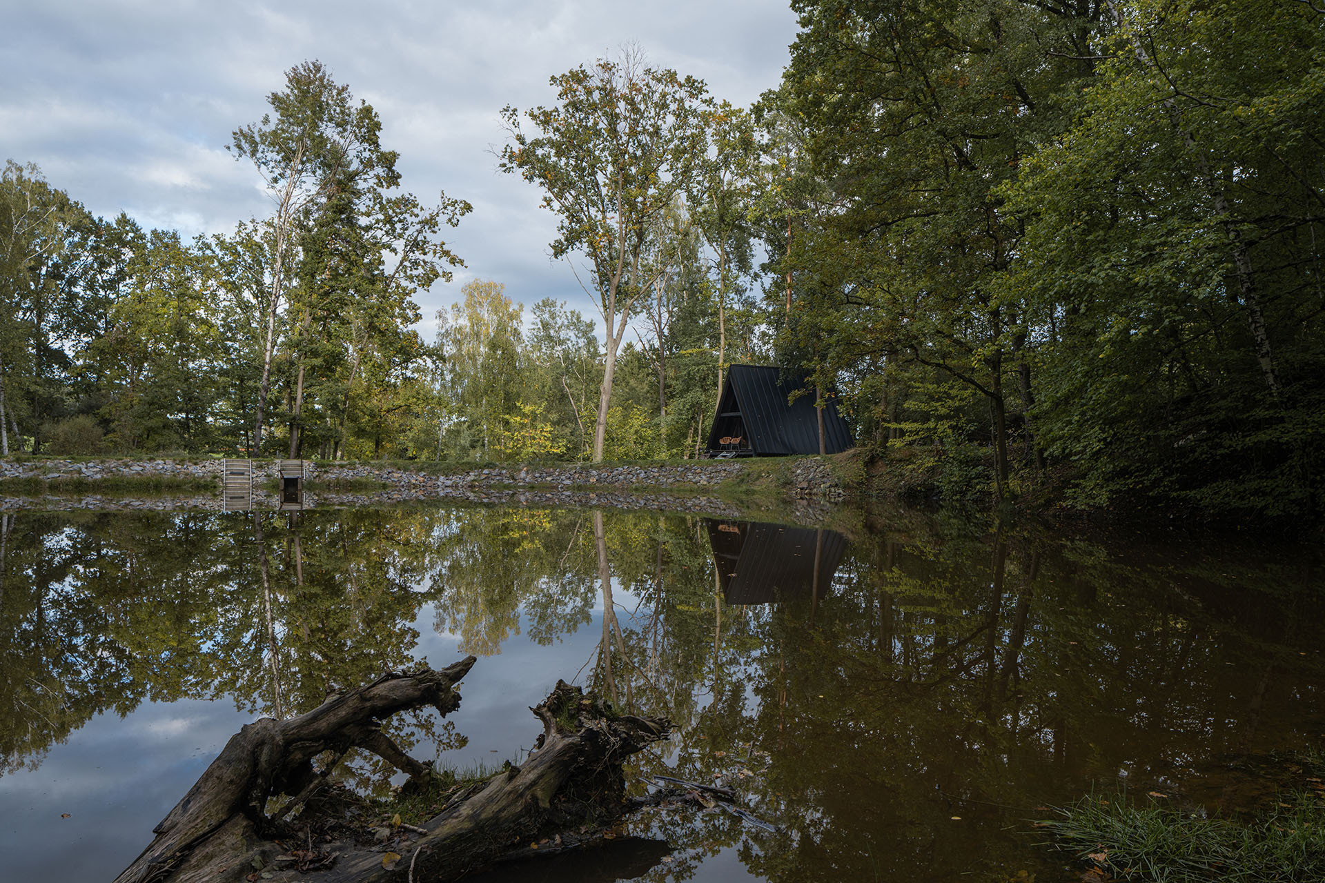 Na břehu rybníka v jižních Čechách vyrostlo místo určené k odpočinku a chytání ryb chráněné hradbou stromů. Dřevo, ze kterého je chata postavena, vysázel majitelův dědeček.