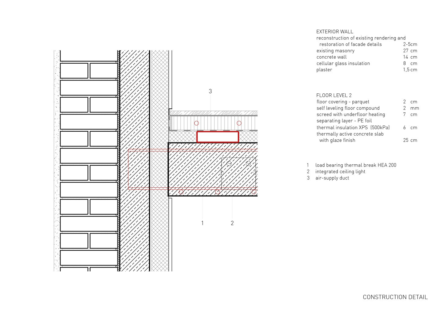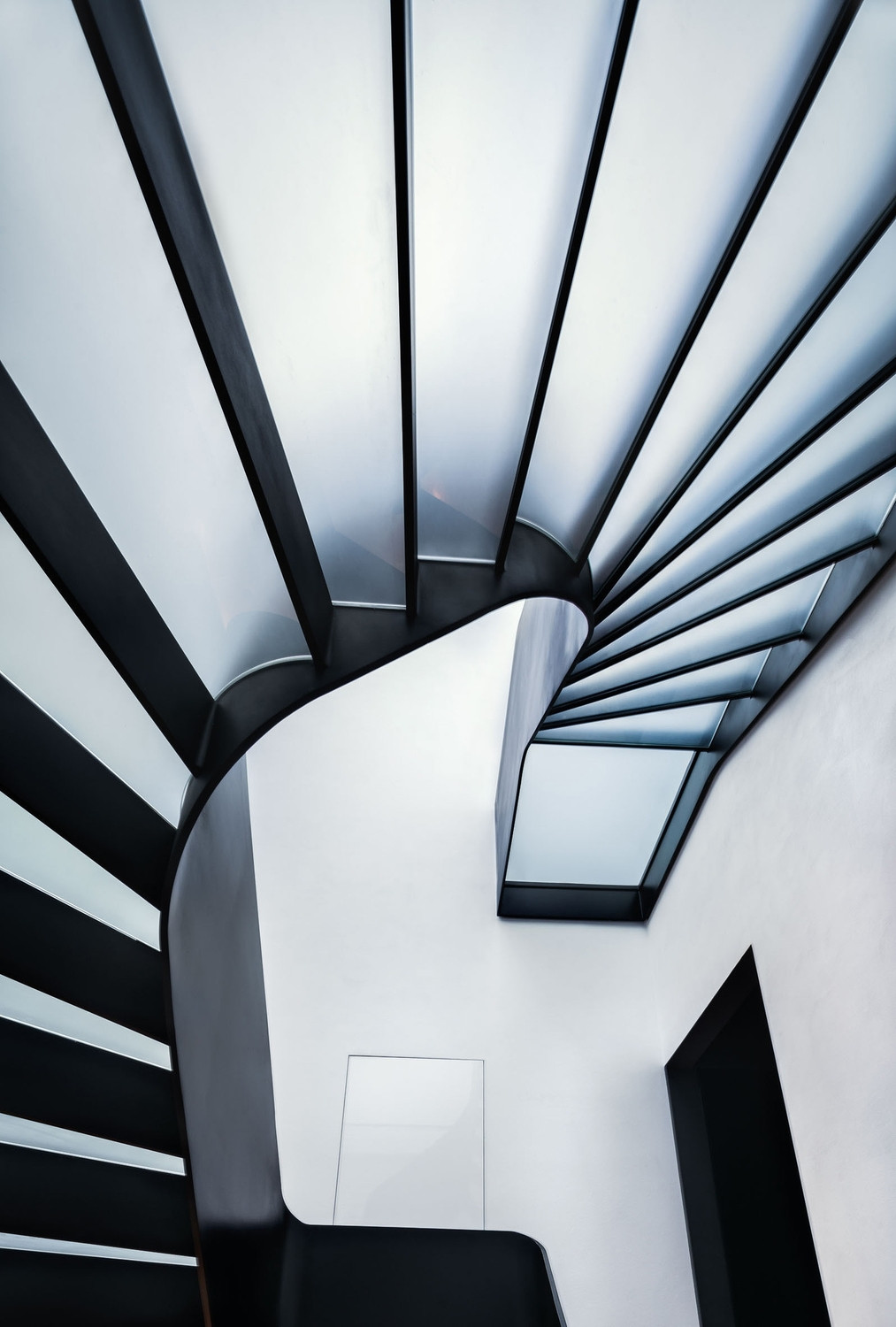 Použitý bílý beton jemně doplňuje strukturu i původní dispozici stavby. Pod deskami z bílého lesklého betonu se ukrývá také současná technologie domu. Díky materiálům, kompozici otvorů i přidání na první pohled protichůdných prvků spolu obě charakteristické části domu (původní a přístavba) komunikují a vzájemně se doplňují. V interiéru domu se nachází nové schodiště, které svým velkorysým zpracováním umožňuje přístup dostatku slunečního světla do centrální části celého domu.