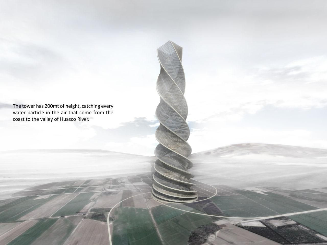 Tento projekt má v úmyslu využívat "Camanchaca", pobřežní mlhu, která se kondenzuje z tlakové výše Pacifiku. Myšlenka projektu je postavit 200 metrů vysokou věž, která bude zachytávat částečky sražené vody a svádět ji do základny věže, kde se z kapaliny odfiltruje sůl pomocí reverzní osmózy. Věž má spirálovou konstrukci, po které zkondenzovaná mlha steče dolů do dřevěné základny. Systém sběru vody využívá pouze větrné energie a gravitace. Porota byla potěšena tímto inovativním, jednoduchým a elegantním řešením, díky kterému může zemědělská oblast prosperovat.