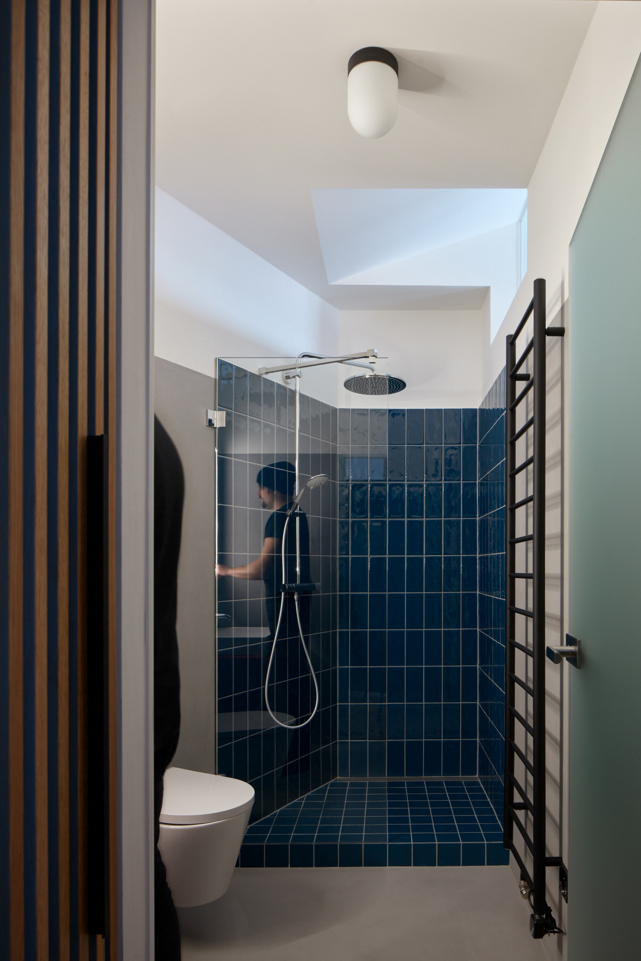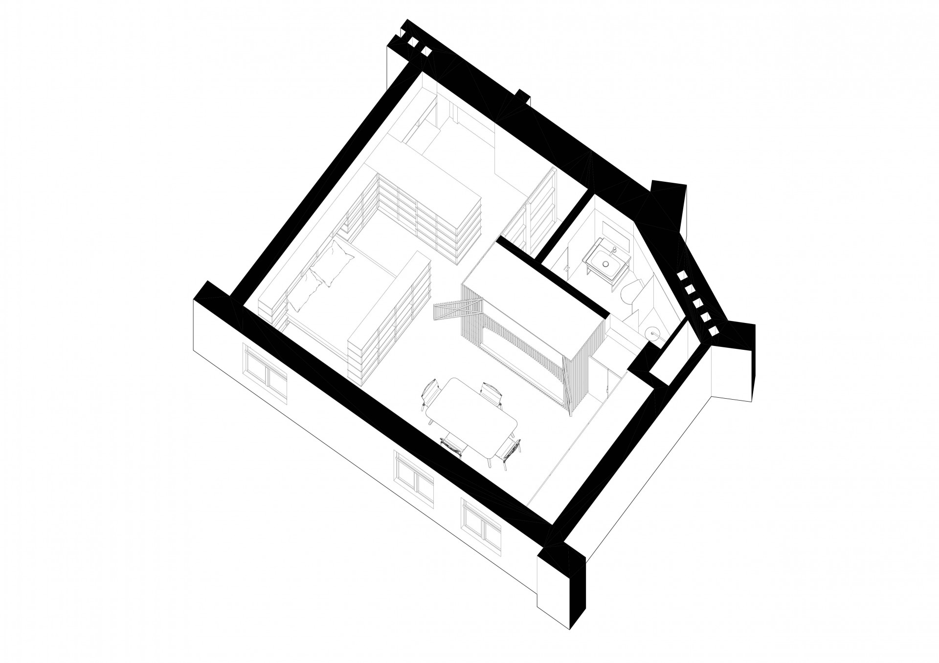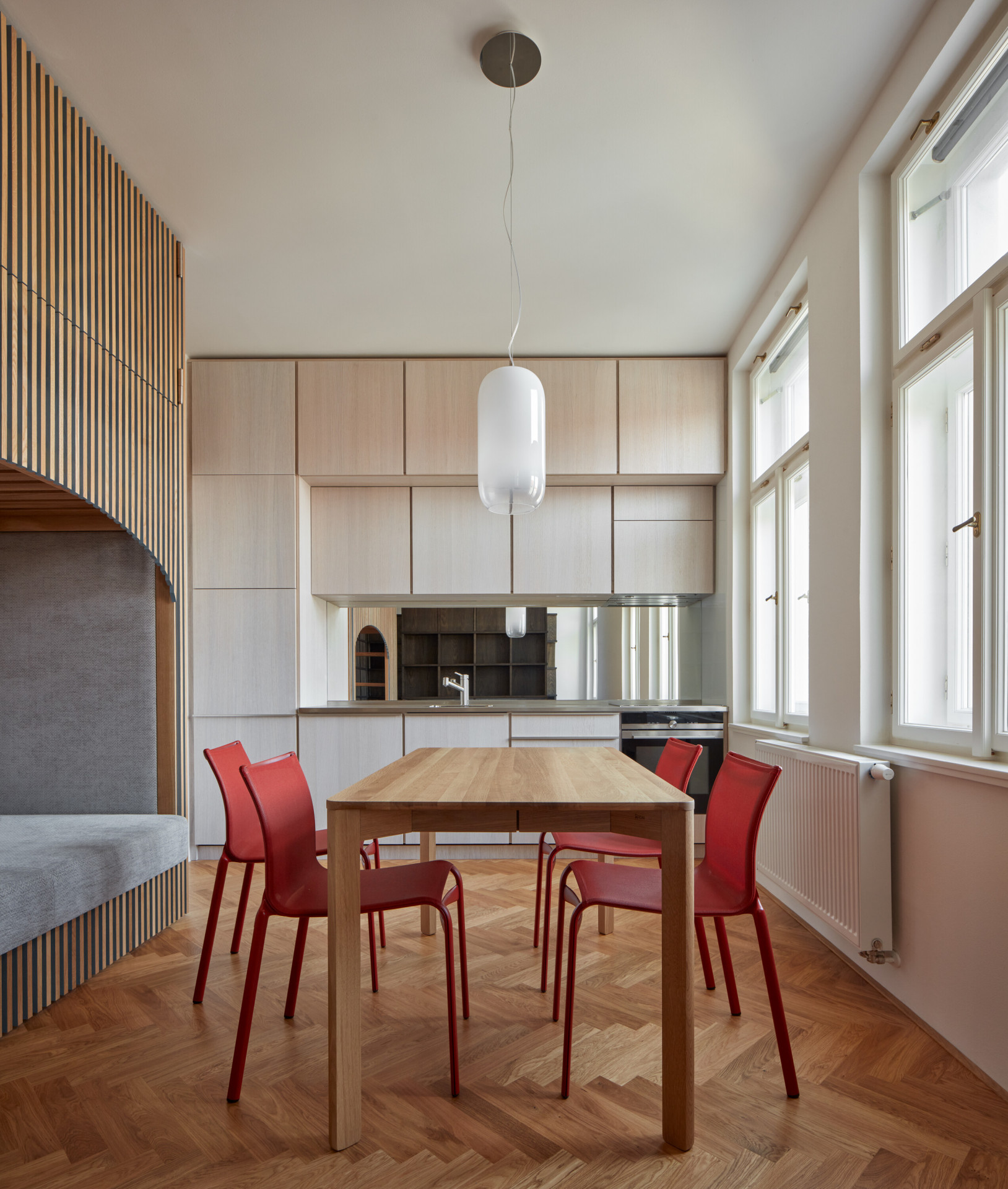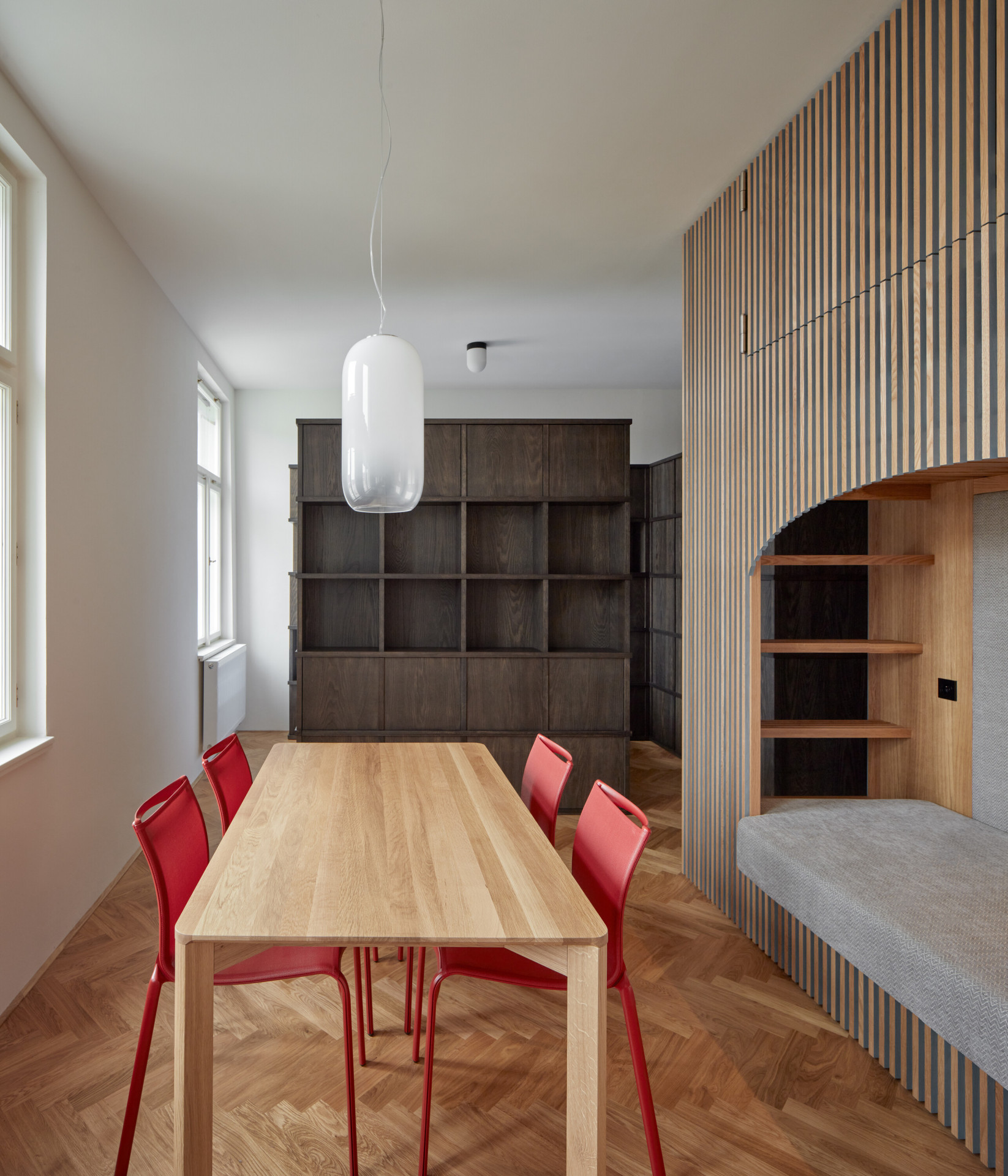Sami architekti říkají, že prostor koncipovali tak, aby se v něm mohli obyvatelé „protáhnout“. „Do centra nové dispozice jsme umístili prostor. Obdélníkový prostor, se stolem a židlemi uprostřed. Posuneme-li však stůl a židle stohujeme na sebe, vzniká nám prostor dostatečně velký, aby se jeden mohl protáhnout. Tím jsme se vyvarovali pocitu stísněnosti,“ popisují řešení bytu.