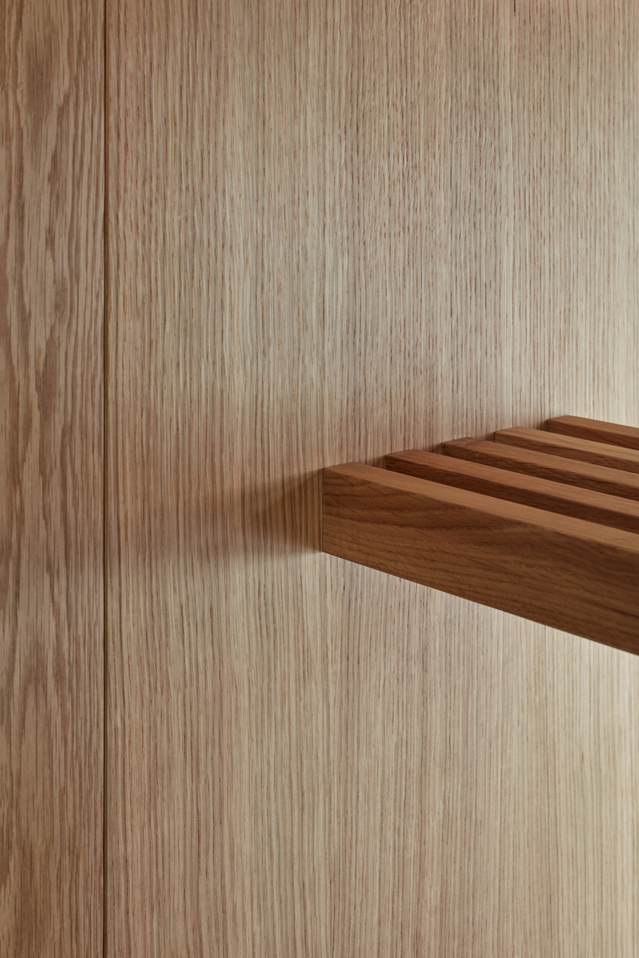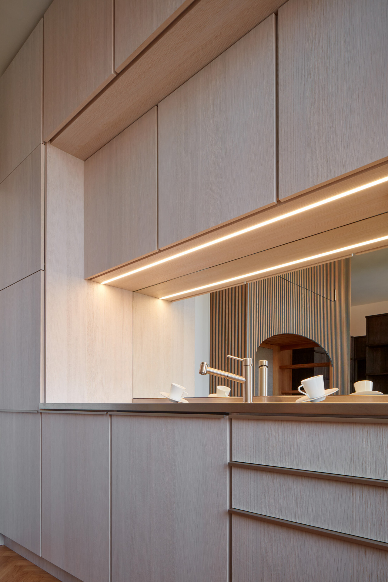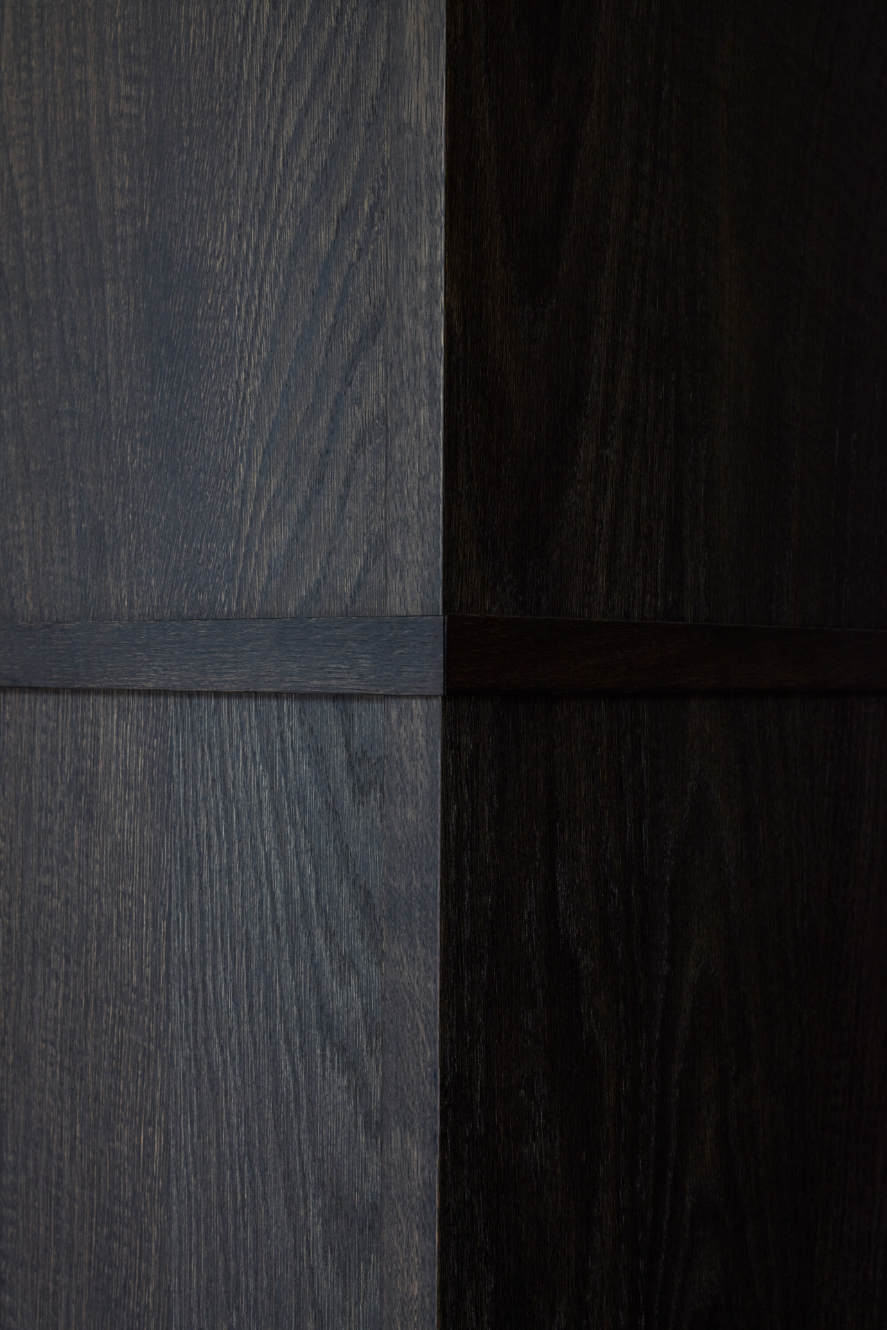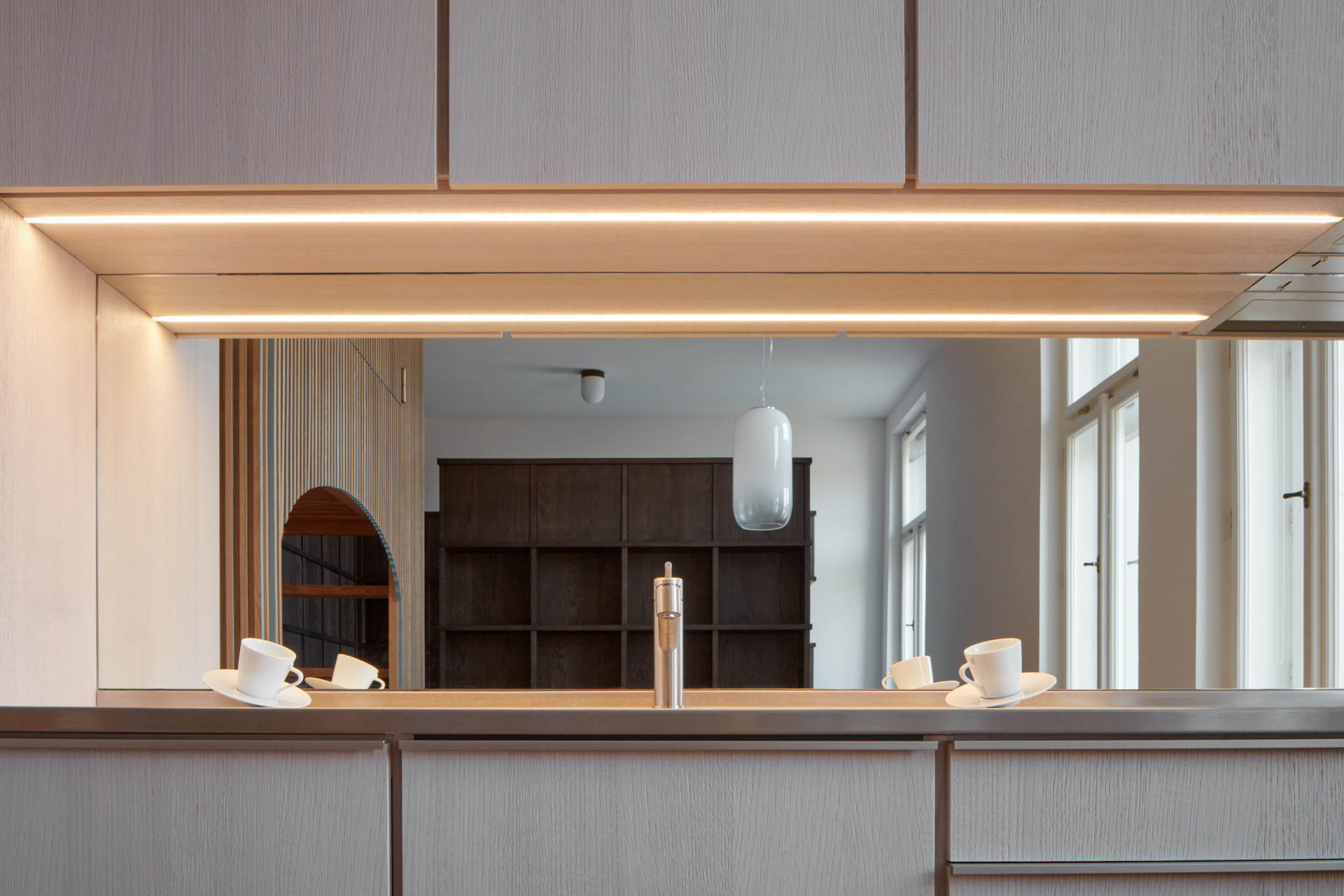 Veškerý vestavný nábytek je jen z jednoho druhu materiálu – dubového masivu a dýhy. Přesto májí jednotlivé kousky odlišné odstíny, a to podle způsobu moření. Transparentní a světlý lak má vybavení, které se používá ve dne, tmavé zase to noční. Prostor navíc ještě opticky rozšiřuje zrcadlo v kuchyni.