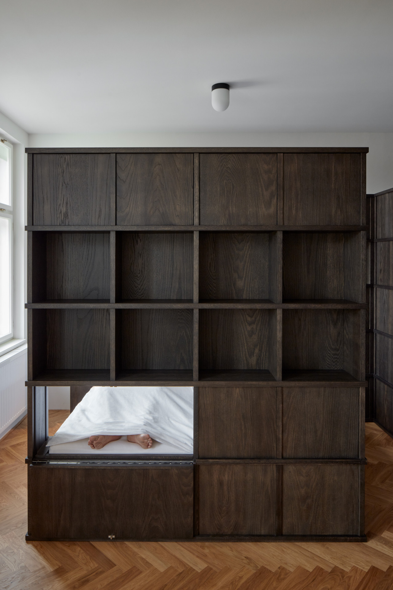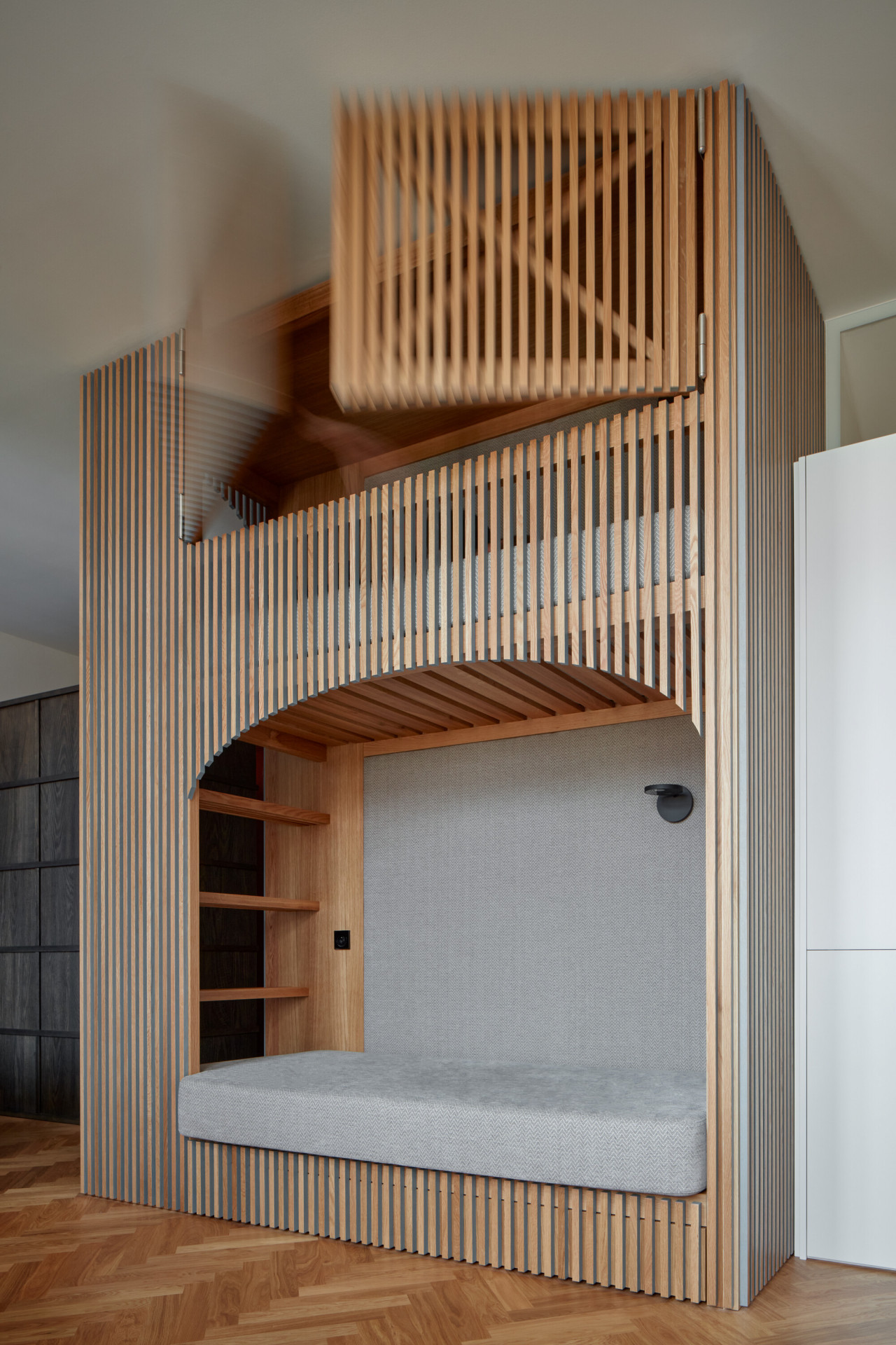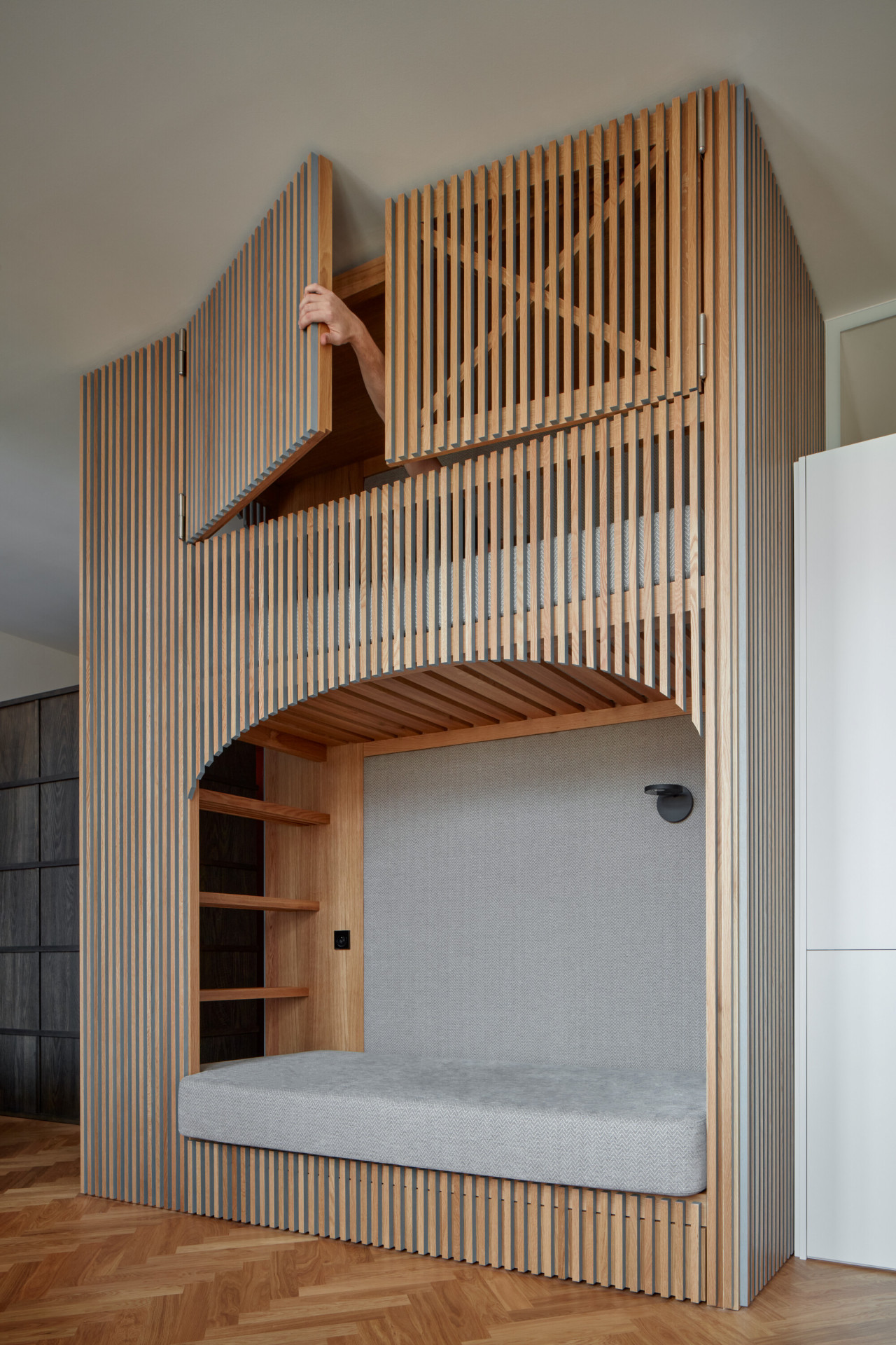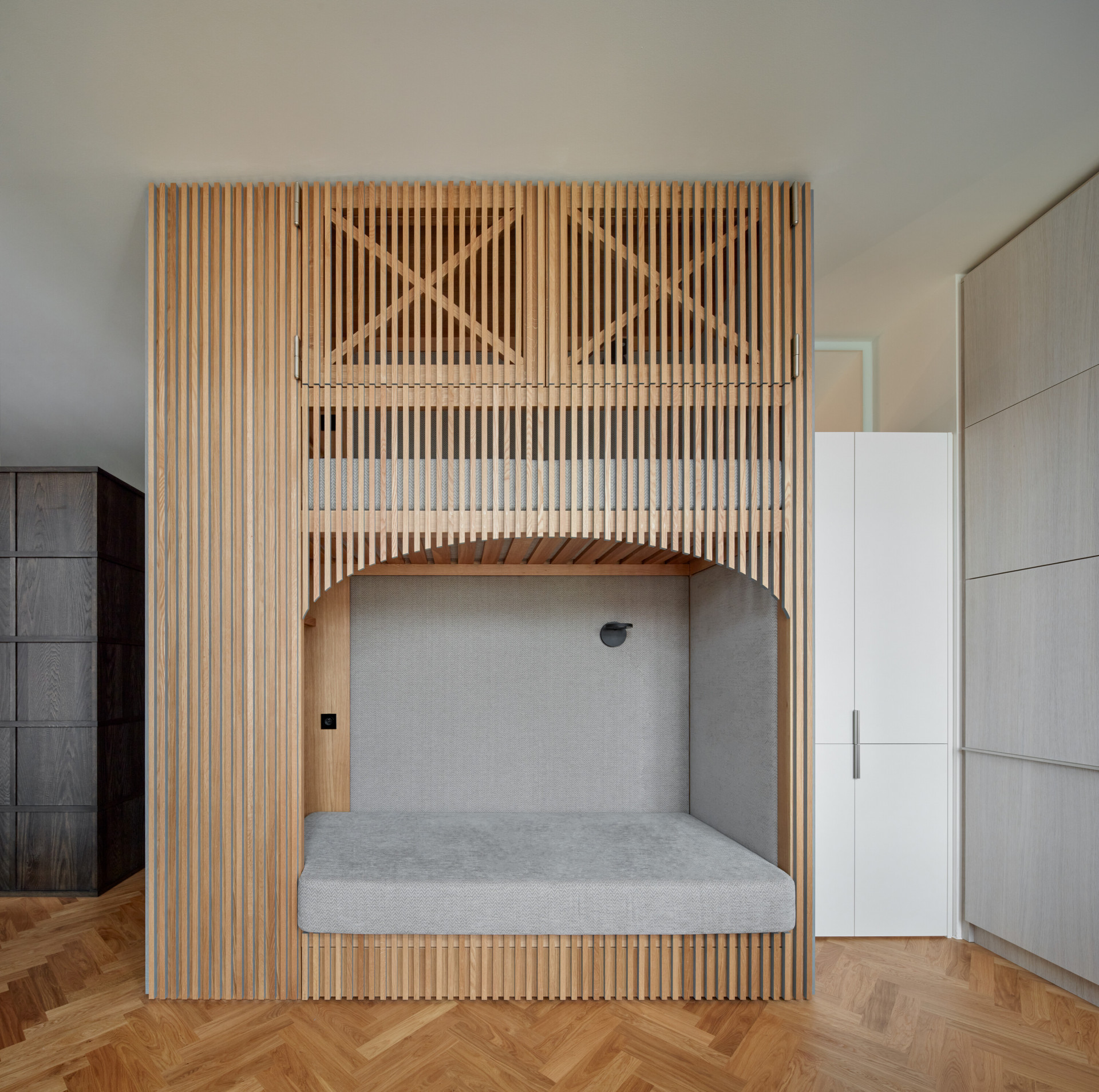 Způsob řešení spaní je na realizaci asi tím vůbec nejzajímavějším. Postel rodičů architekti vsunuli mezi dva regály, vznikla tak soukromější část bytu a také množství úložných prostorů. Děti zase spí v „patrovém boxu“ – de facto na velmi netradičně ztvárněné palandě, jejíž spodní část ve dne slouží jako gauč, horní se dá zase zavřít do "skříně“. „Box je obložený dubovými latěmi, které postupně přecházejí i na stěnu oddělující koupelnu, která se díky tomu jeví také jako součást vestavěného nábytku. Díky dveřím, které dosahují až ke stropu na svou přítomnost neupozorňuje,“ dodávají architekti k nábytkovému řešení.