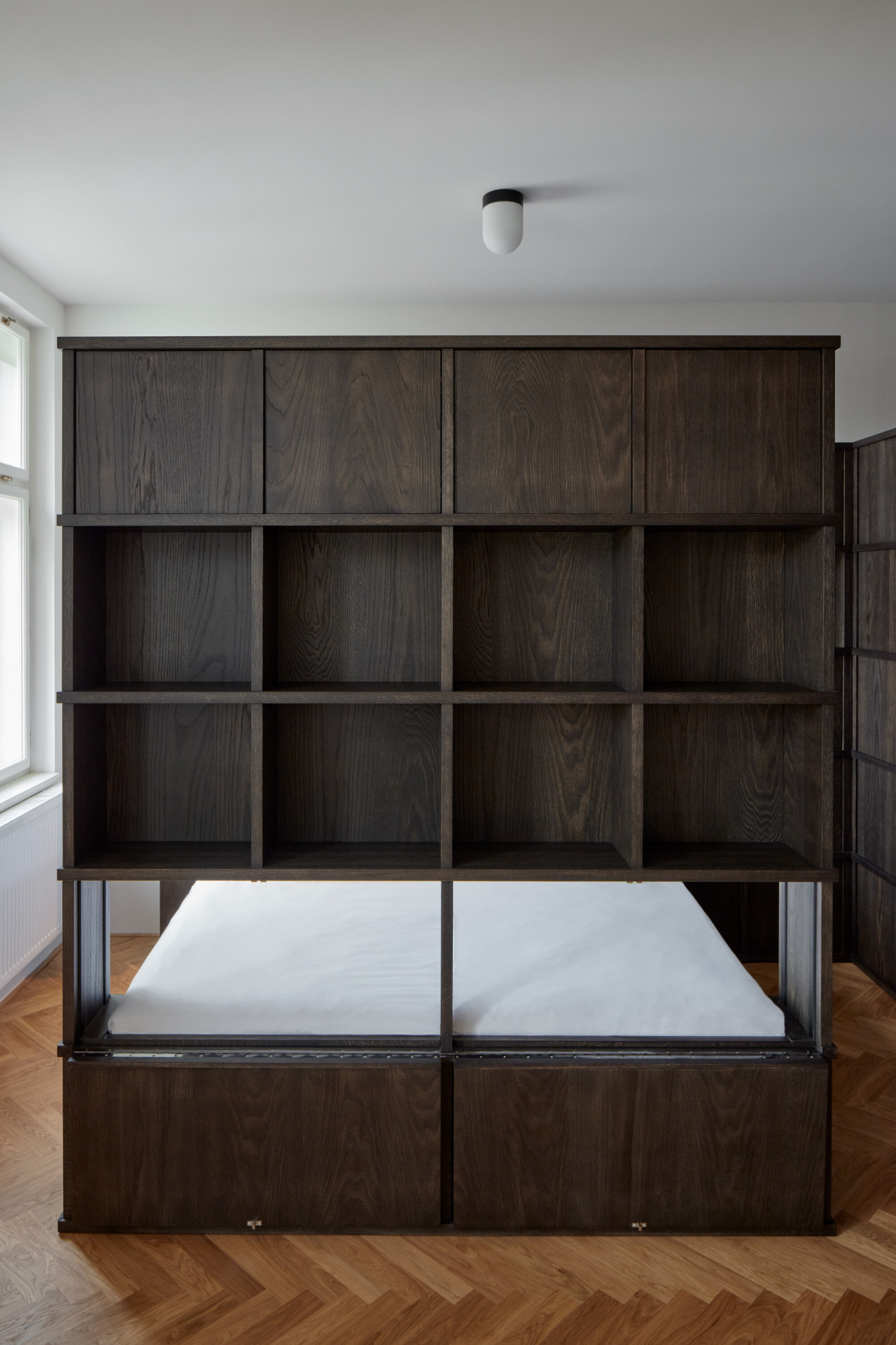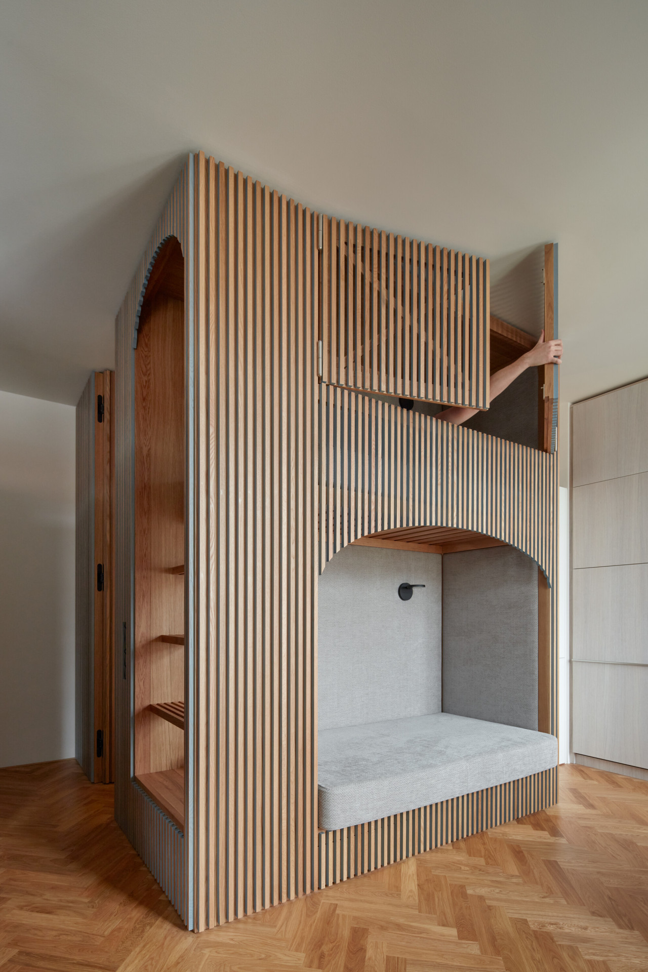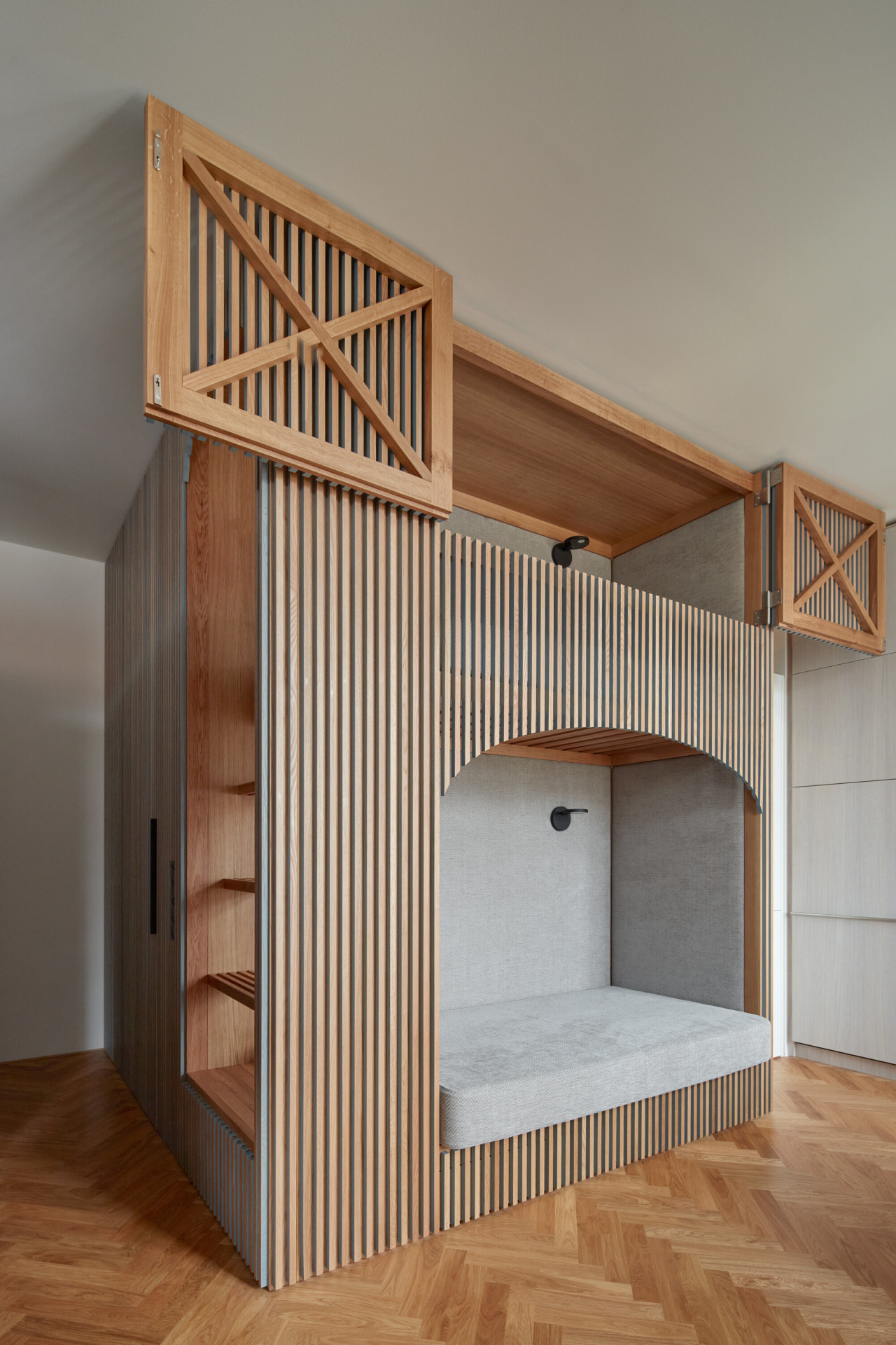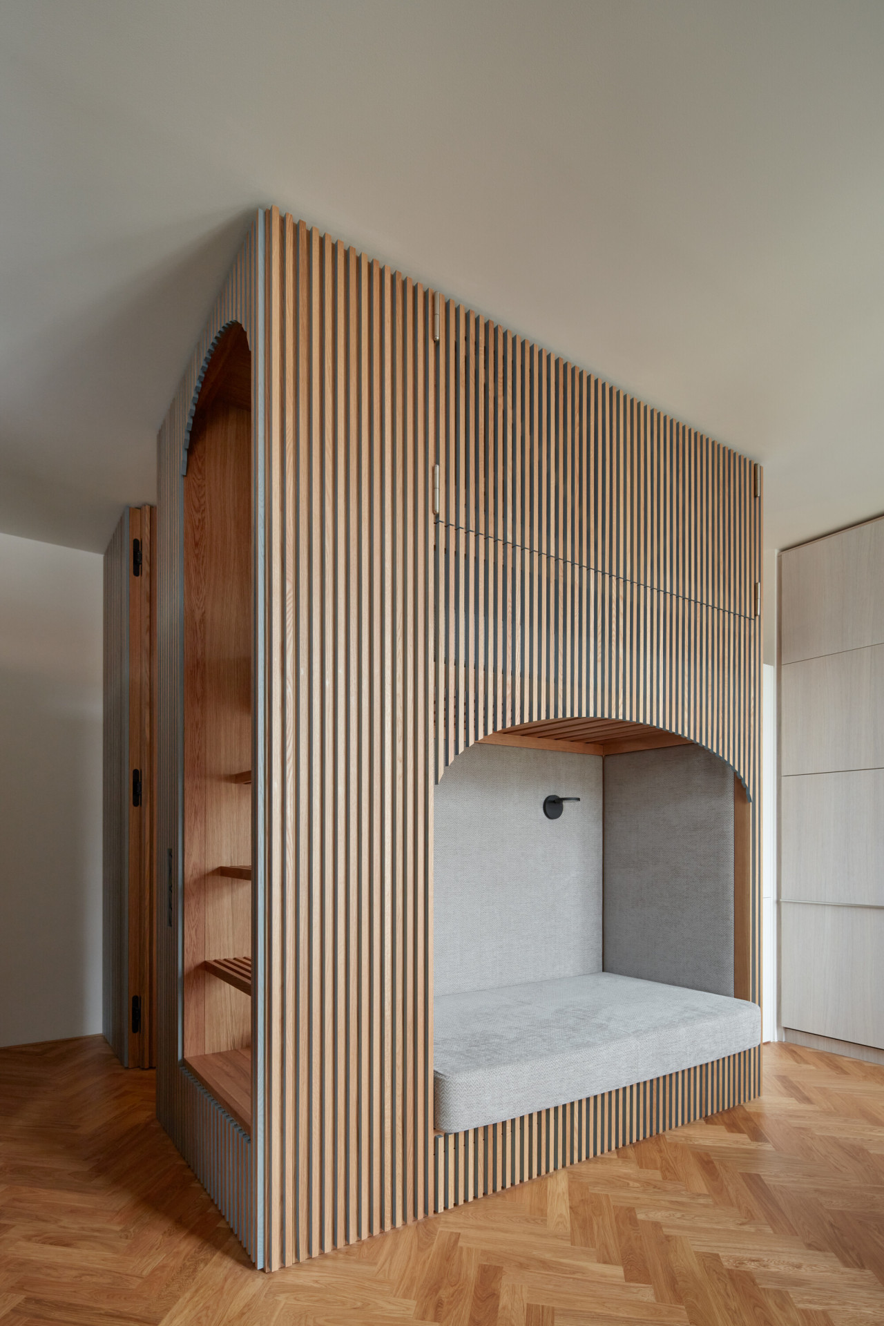 Způsob řešení spaní je na realizaci asi tím vůbec nejzajímavějším. Postel rodičů architekti vsunuli mezi dva regály, vznikla tak soukromější část bytu a také množství úložných prostorů. Děti zase spí v „patrovém boxu“ – de facto na velmi netradičně ztvárněné palandě, jejíž spodní část ve dne slouží jako gauč, horní se dá zase zavřít do "skříně“. „Box je obložený dubovými latěmi, které postupně přecházejí i na stěnu oddělující koupelnu, která se díky tomu jeví také jako součást vestavěného nábytku. Díky dveřím, které dosahují až ke stropu na svou přítomnost neupozorňuje,“ dodávají architekti k nábytkovému řešení.