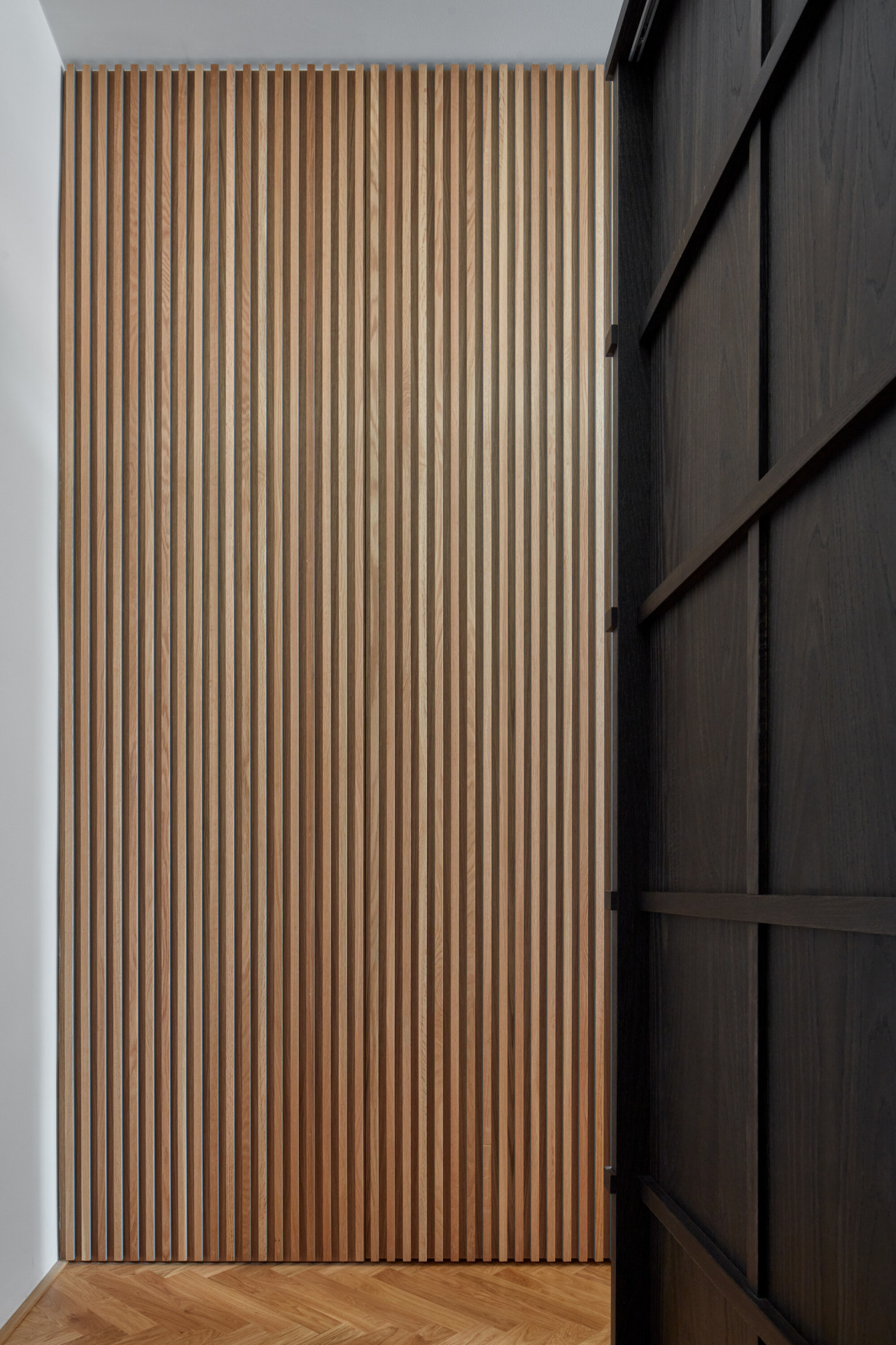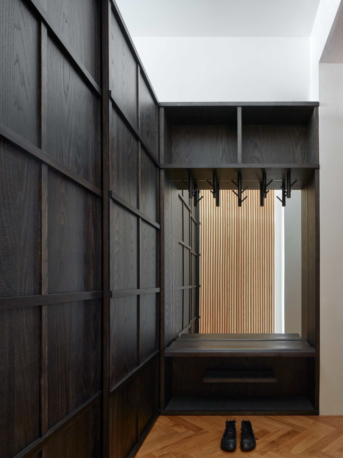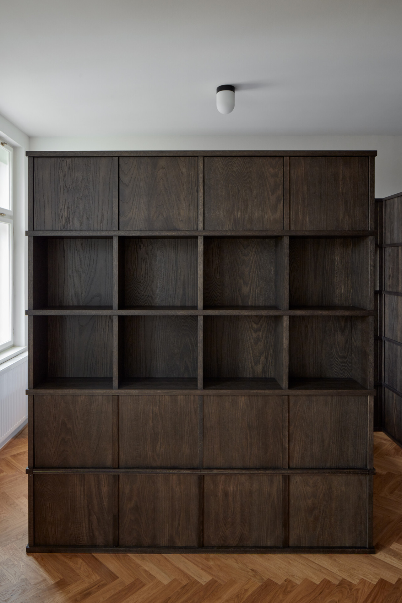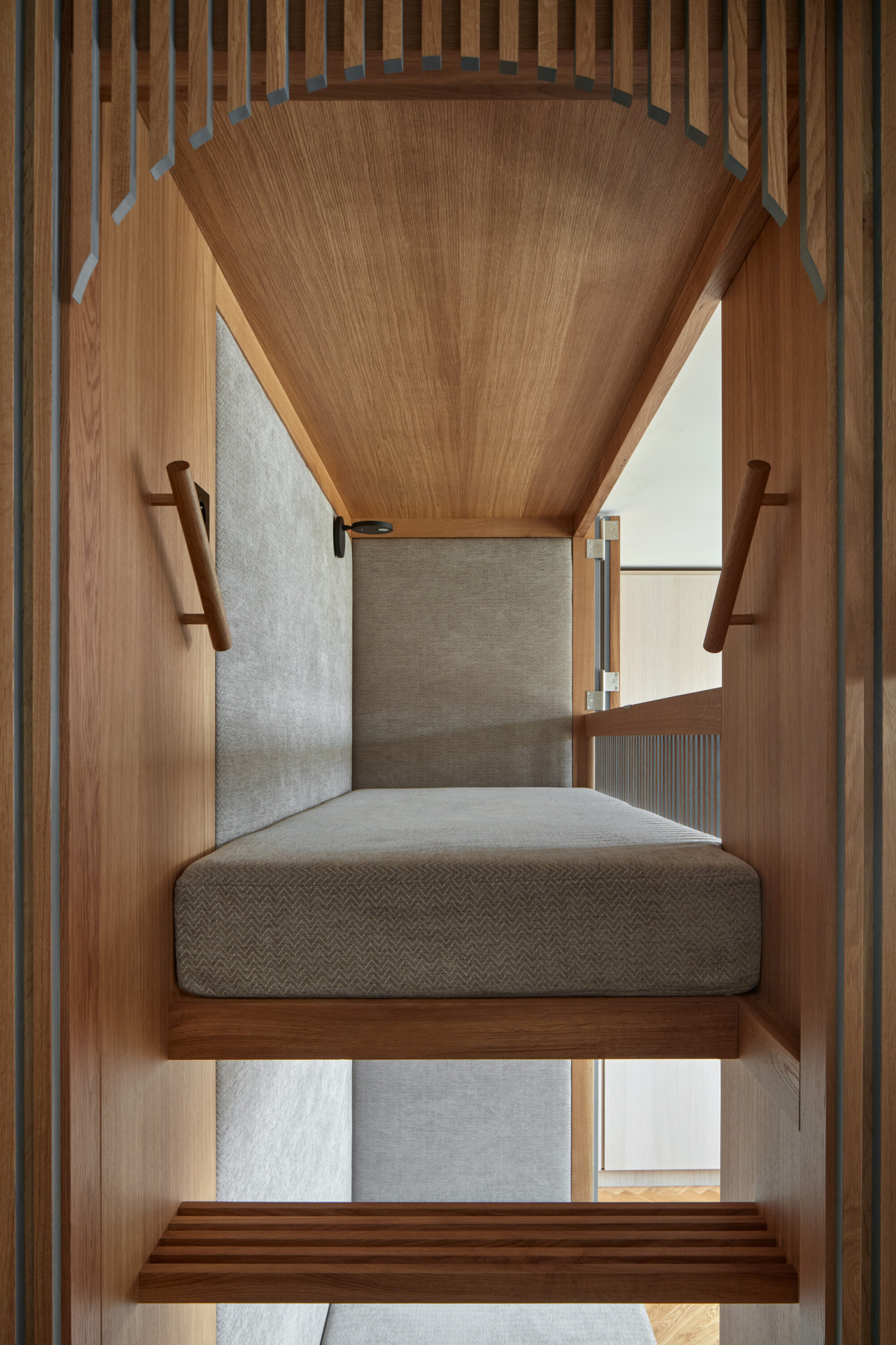 Způsob řešení spaní je na realizaci asi tím vůbec nejzajímavějším. Postel rodičů architekti vsunuli mezi dva regály, vznikla tak soukromější část bytu a také množství úložných prostorů. Děti zase spí v „patrovém boxu“ – de facto na velmi netradičně ztvárněné palandě, jejíž spodní část ve dne slouží jako gauč, horní se dá zase zavřít do "skříně“. „Box je obložený dubovými latěmi, které postupně přecházejí i na stěnu oddělující koupelnu, která se díky tomu jeví také jako součást vestavěného nábytku. Díky dveřím, které dosahují až ke stropu na svou přítomnost neupozorňuje,“ dodávají architekti k nábytkovému řešení.