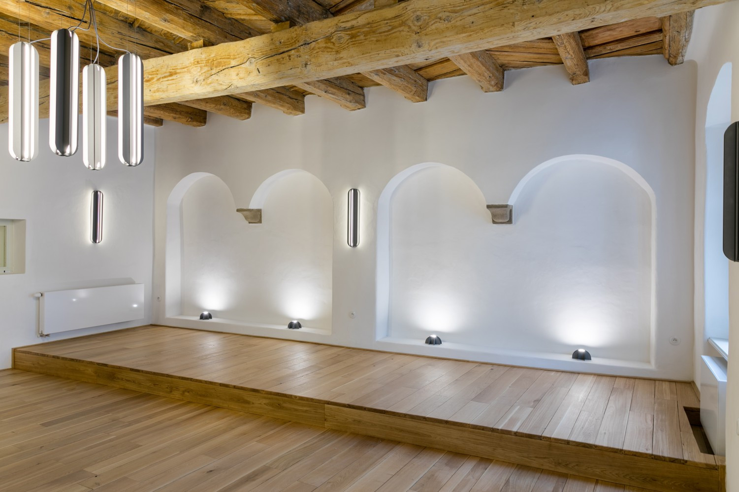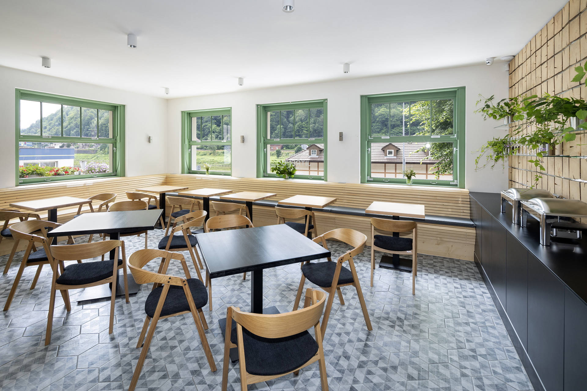 Interiér v neutrálních odstínech bílé a šedé doplněný dřevěným nábytkem nechává vyniknout zelené rámy dveří a oken, která jsou v restaurační části zachována v původní podobě. Ve společenském prostoru zaujme geometrický vzor tmavě šedé dlažby i dřevěné obložení stěny, které umožňuje přichytit téměř neviditelné skleněné police nesoucí rostliny a jiné doplňky.