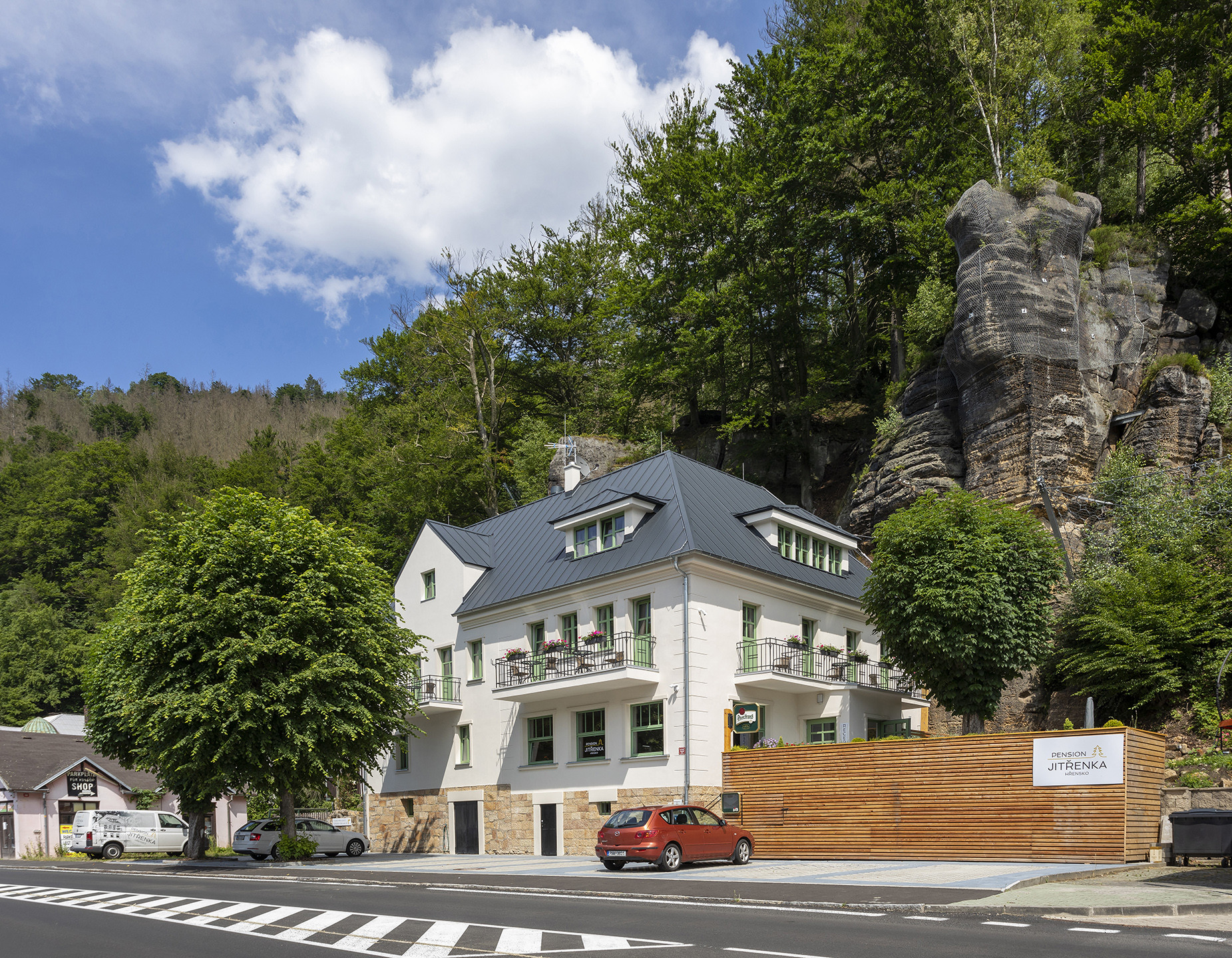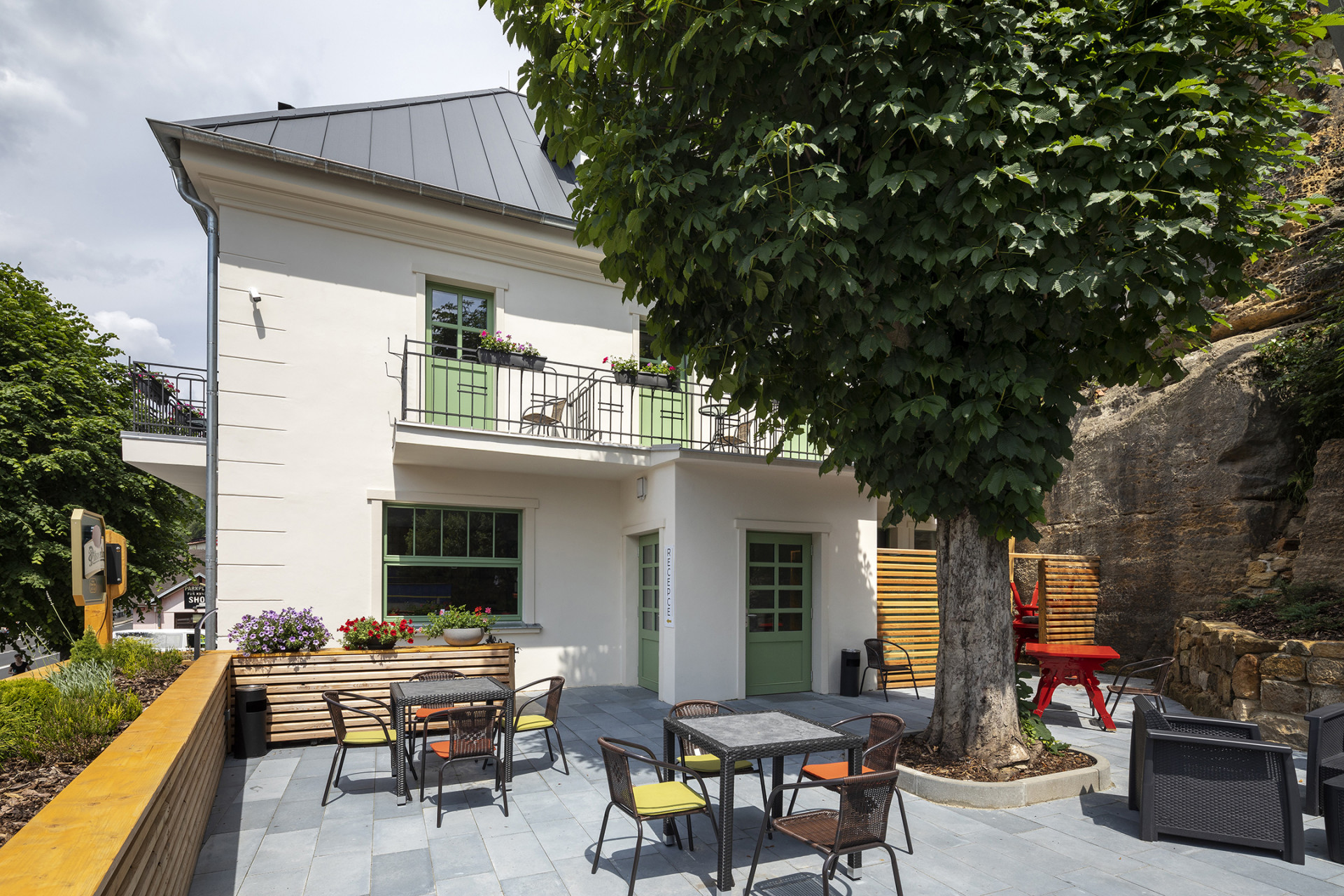 Architektky citlivě upravily i okolí penzionu. Betonová dlažba zpevňuje prostranství pro parkování a posezení na terase. Ta je šikovně odcloněna od silnice dřevěnými latěmi, vše nakonec zpříjemňují truhlíky s rostlinami nebo stávající stromy poskytující užitečný stín.