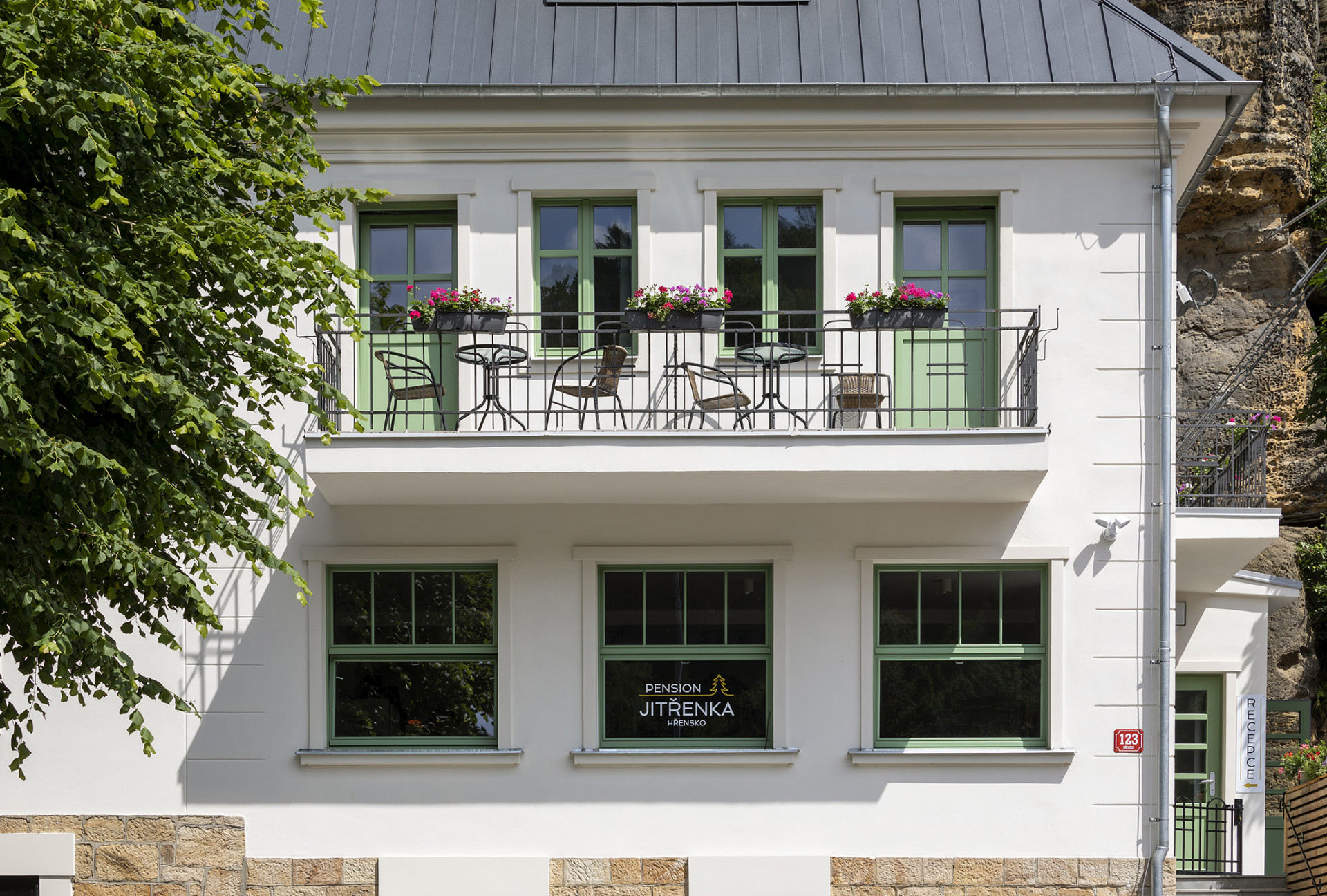 Vnější fasáda navazující na původní a nově pouze očištěnou pískovcovou podezdívku se nese v neutrální béžové barvě. Pozornost na sebe tak přitahují okenní a dveřní rámy v olivovém odstínu zelené. Balkony doplňuje jednoduché černé zábradlí s truhlíky pro květiny. Celou stavbu nakonec kryje valbová střecha z falcovaného antracitového plechu.