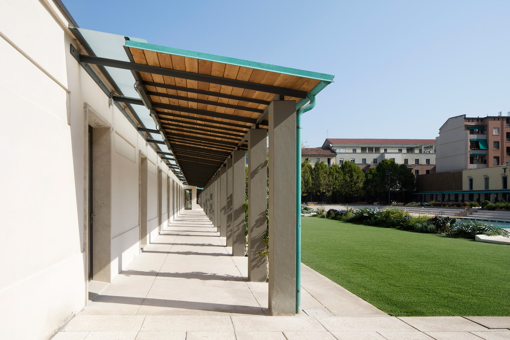 Betonové sloupy podpírající střešní systém vytvářejí zajímavý architektonický rytmus. Střecha je pokrytá světle zelenými předpatinovanými měděnými panely, v nichž jsou integrovány okapové žlaby. Zastřešení sloupoví je od sousední konstrukce odděleno zasklenou plochou, která také umožňuje větrání průchodu za letních veder. Co se týče materiálového řešení renovace, soustředil se architekt De Lucchino na zachování původních prvků – veškeré nové zásahy pak viditelně přiznal.