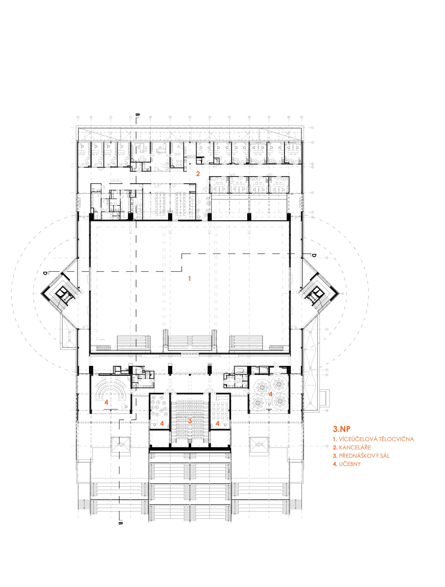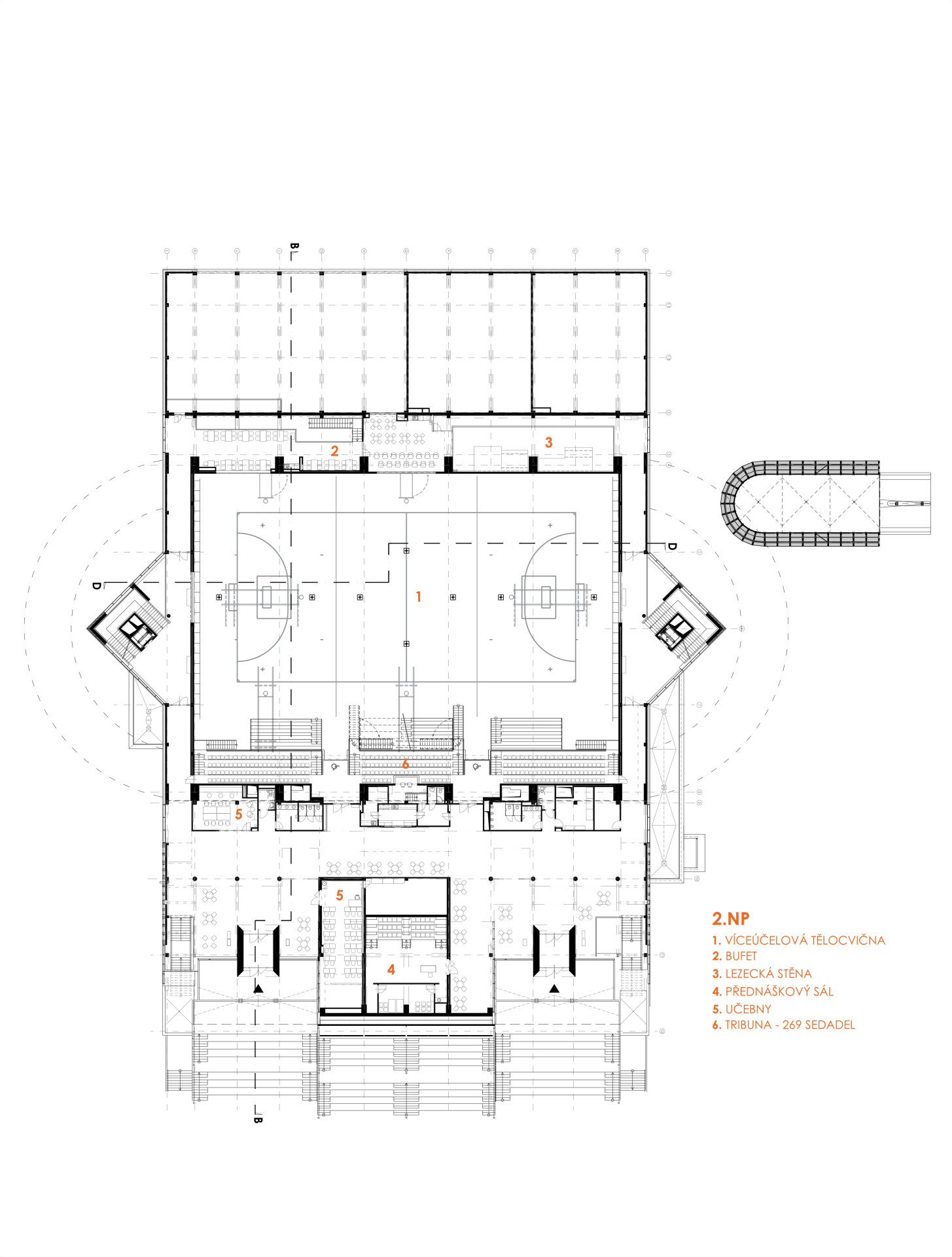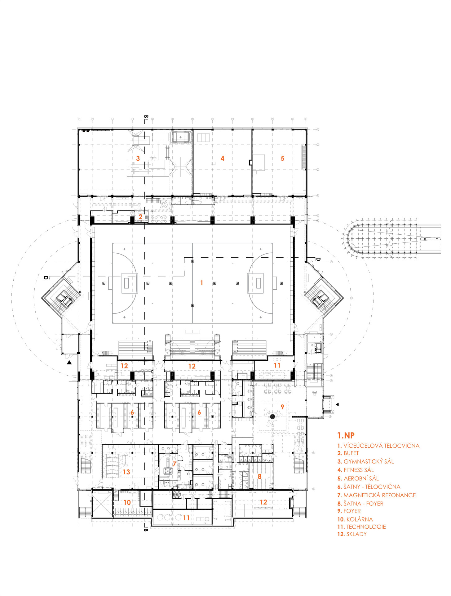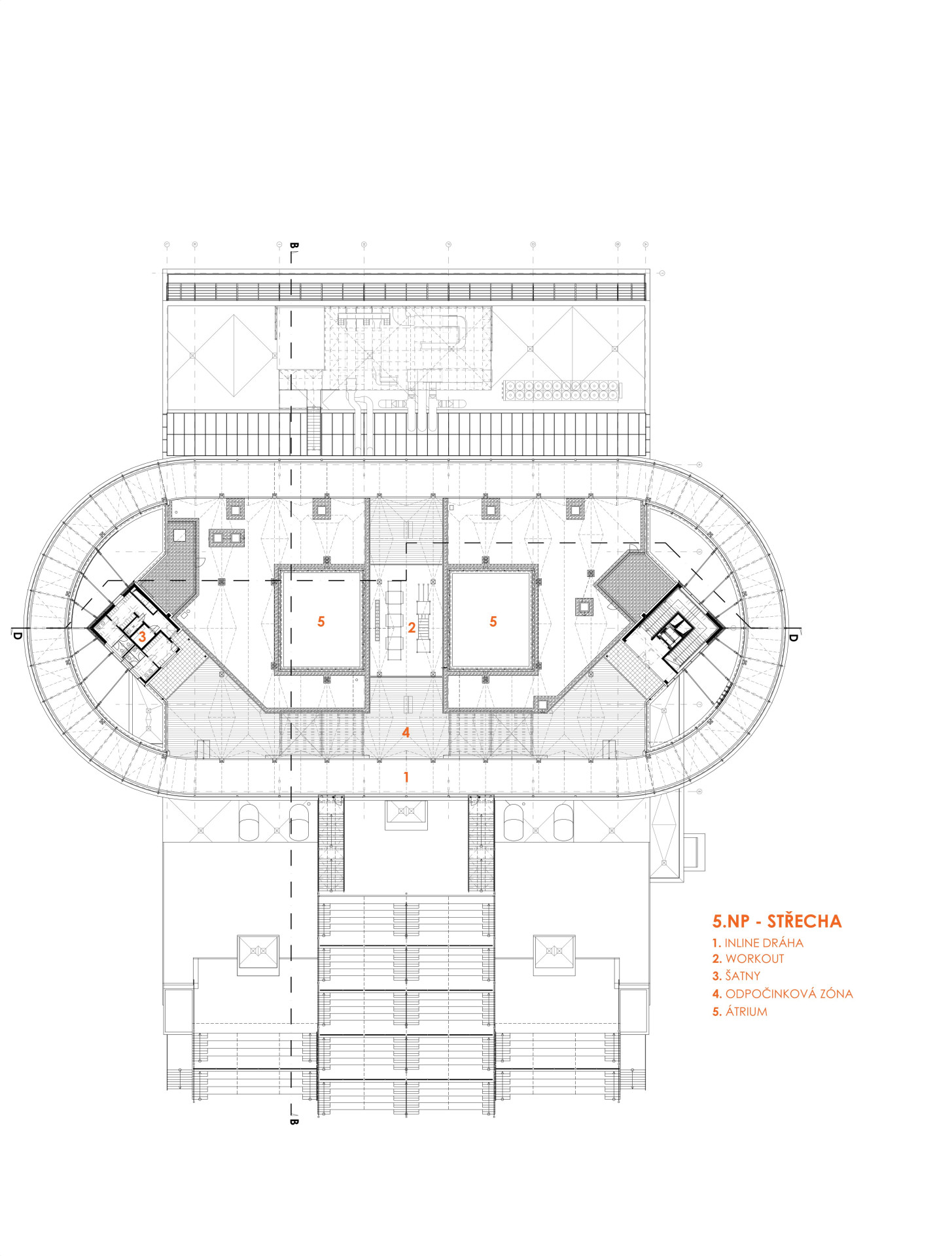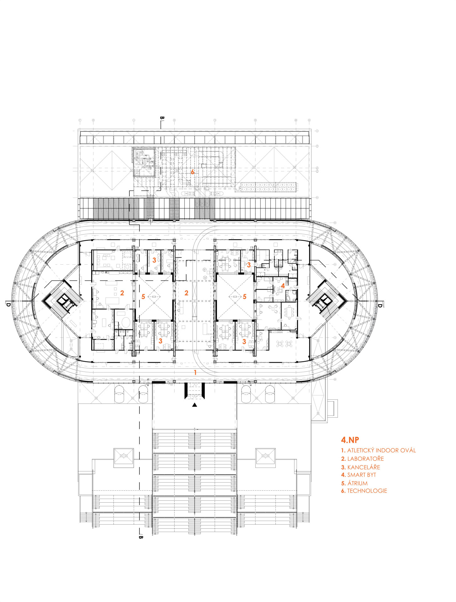 Provozně je objekt rozdělen do tří celků. První celek obsahuje kancelářské a administrativní prostory, druhý celek sportovní zázemí pro všechny druhy sportu a pohybových aktivit s centrální sportovní halou a běžeckým oválem. Třetí celek je vyhrazen jednotlivým shromažďovacím prostorům, posluchárnám společně s technickým a technologickým zázemím. Velká centrální sportovní hala je středobodem celé stavby a společně s běžeckým oválem jedním z klíčových prvků celého konceptu. Střecha krytého běžeckého oválu pak slouží jako otevřená zelená střecha s oválem pro jízdu na bruslích a hřištěm.