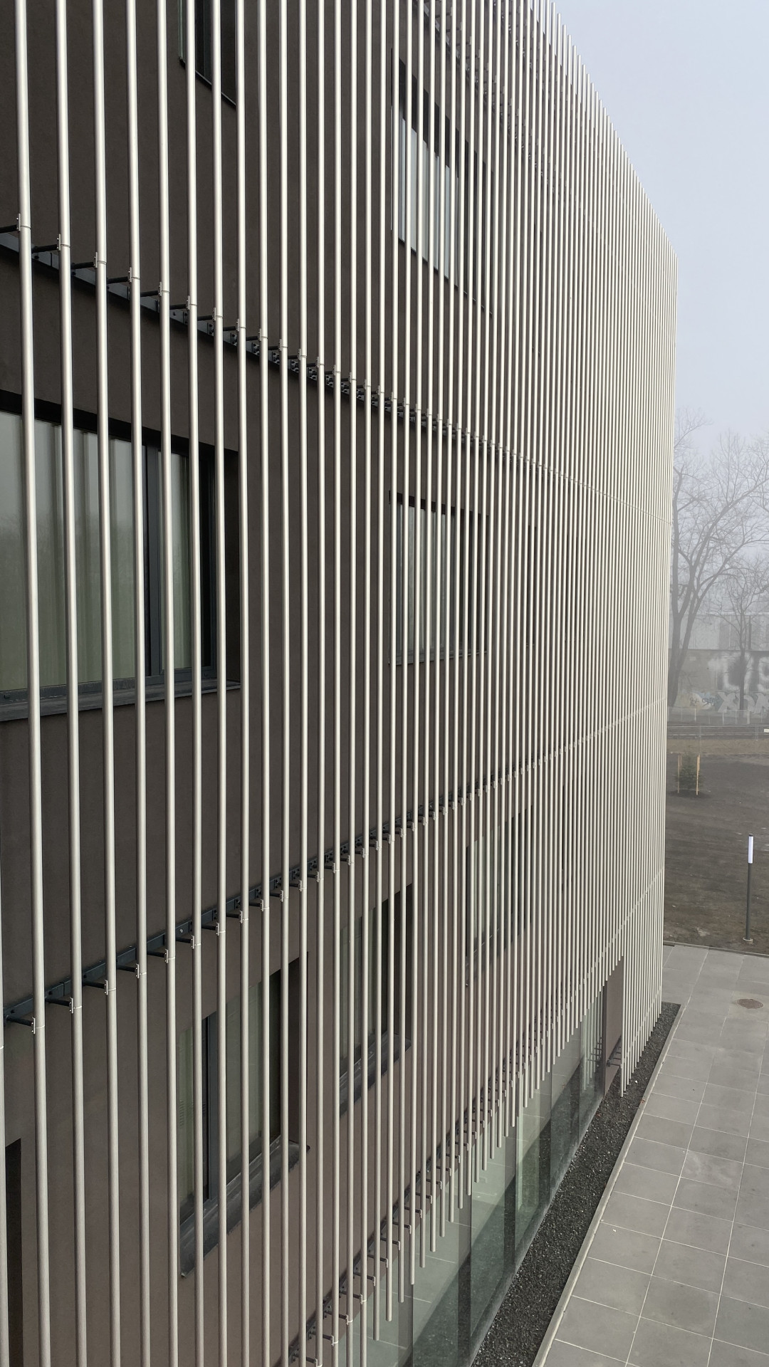 Podélný kvádr s betonovou fasádou obsahuje především hudební sál a reprezentativní komunikační prostor, vertikální kvádr zase výukové prostory uspořádané kolem centrálního atria. Kvádr je pozoruhodný svým atypickým řešením fasády provedené z příčně členěných hliníkových trubek. „V trubkách jsou zabudovány RGB LED moduly, které jsou programovatelné a ve večerních hodinách vytváří na fasádě objektu světelnou show. Objekt je tímto způsobem živý, dynamický a proměnlivý. Fasáda může reagovat na probíhající hudební vystoupení v komorním sále a převést hudební zážitek také na vizuální,“ dodávají autoři.