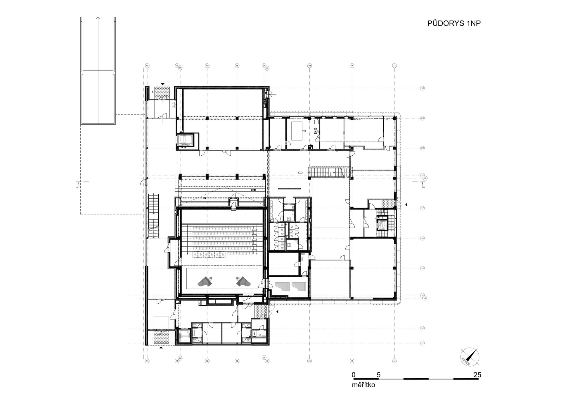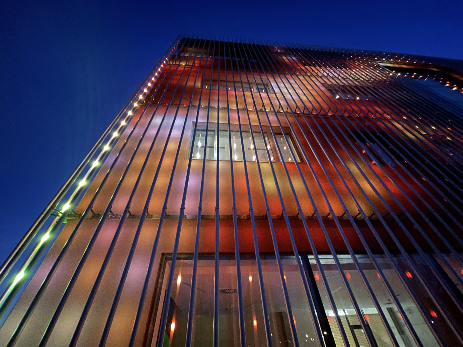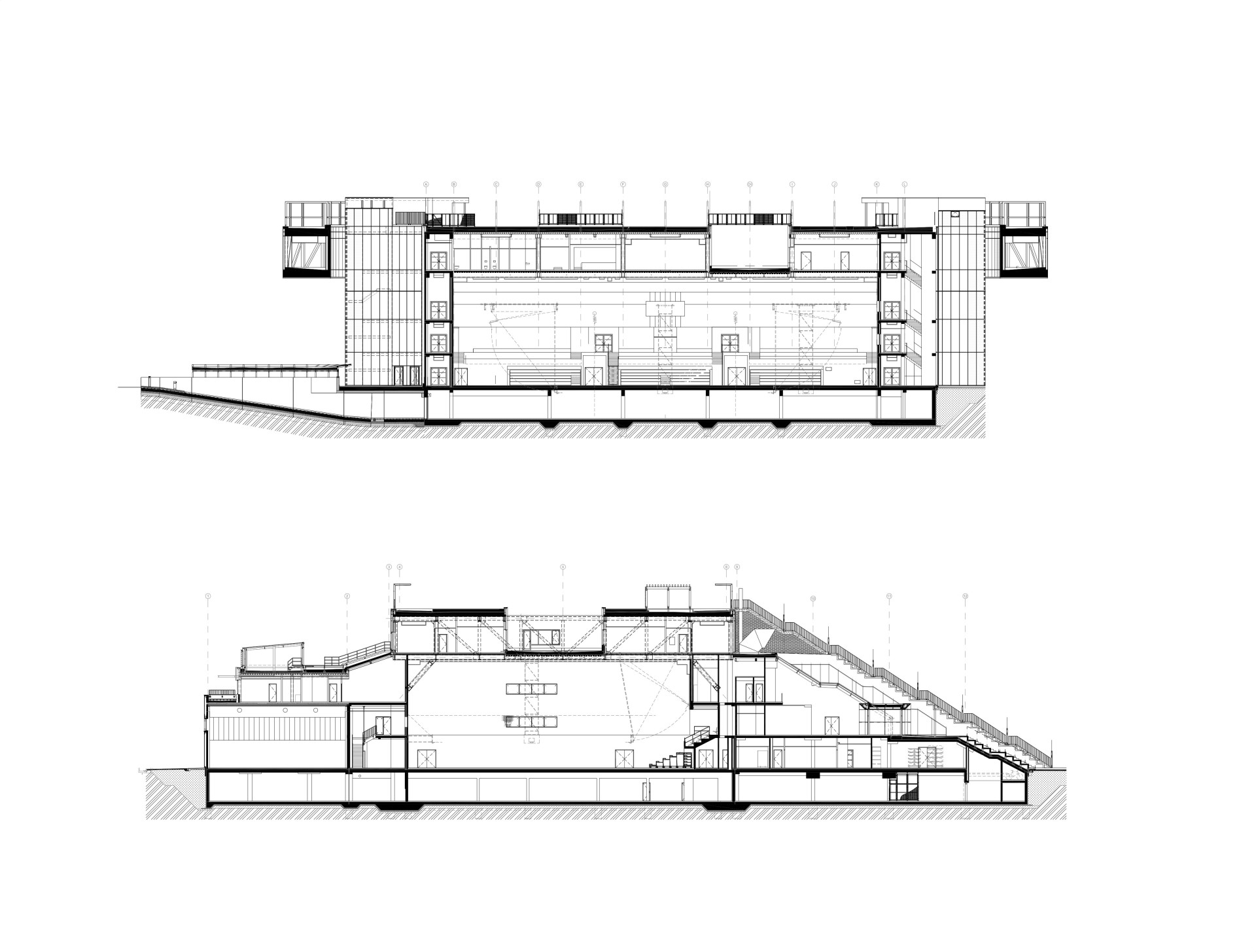 Výrazově silné venkovní terasovité schodiště spojuje všechna nadzemní patra objektu s exteriérem, terénem a střechou. Mimo to, že slouží jako komunikace mezi jednotlivými patry, poskytuje také dostatek pobytových ploch pro sezení a odpočinek. Stává se obrovským amfiteátrem, který je schopen pojmout až 1 200 diváků. To skýtá nespočet možností pro venkovní a společenské akce všeho druhu.