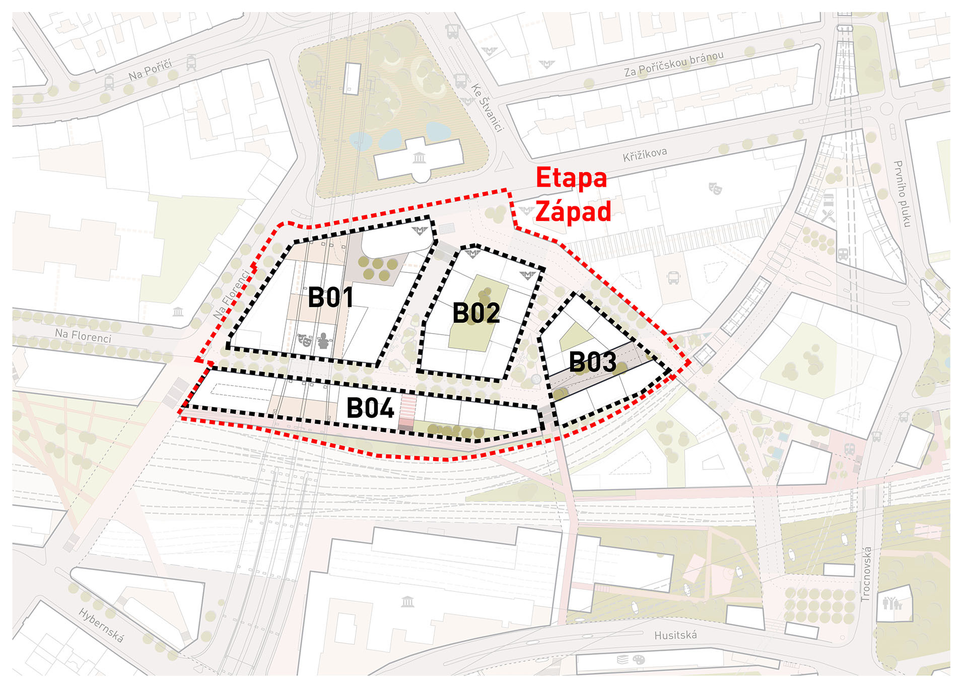 V první etapě dojde k zástavbě západní části při magistrále. Zamýšlené budovy zde jsou rozděleny do čtyř bloků. Pro každý blok bude probíhat samostatná soutěž. Porota navíc bude moci v rámci jednoho bloku kombinovat návrhy různých týmů, aby se podpořila pro Prahu typická různorodost.