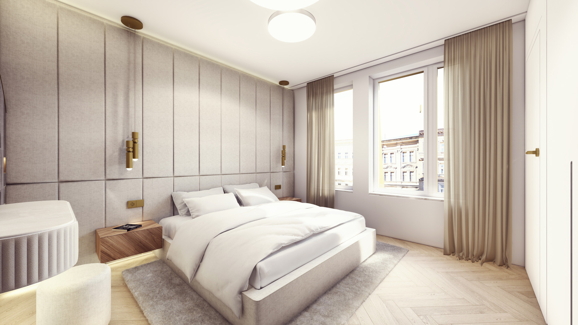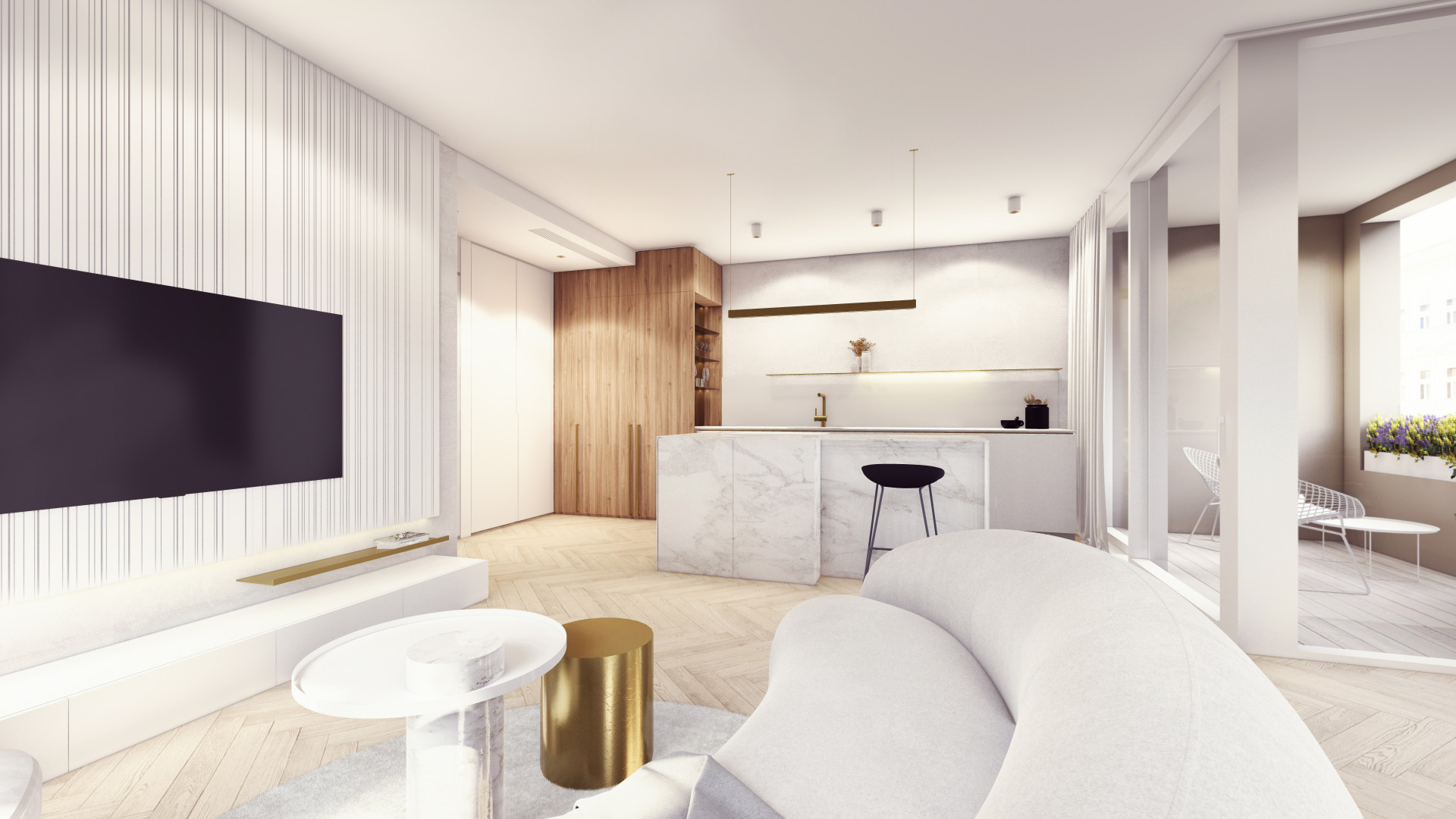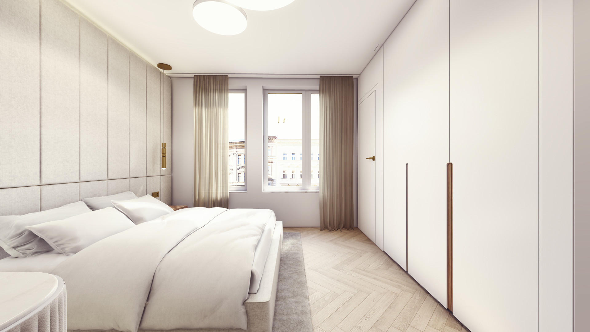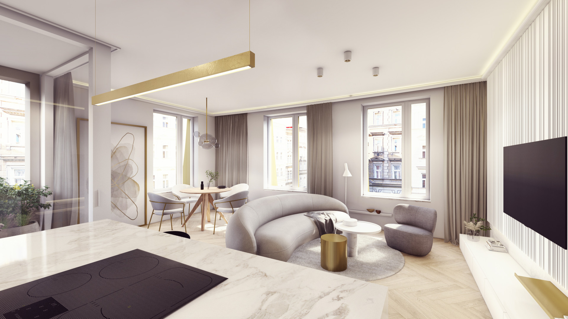 Architektonická kancelář Fránek Architects je také autorem společných vnitřních prostorů v domě, za návrhy jednotlivých bytů pak stojí už pražské studio KarlinBlok, které je koncipovalo tak, aby designově komunikovaly s exteriérem. Všech 27 jednotek nadále zůstane v rukách společnosti CREDITAS Real Estate, která je bude dlouhodobě pronajímat. Vybaveny budou kompletně – od nábytku až po příbory – a v nadstandardní kvalitě. „Všechny byty mají interiéry navržené do posledních detailů a každý byt má svůj osobitý výraz. Nosnými prvky fasády jsou vertikály a mosaz, které jsme promítli i do interiérů bytů. Vertikální linie jsou zakomponované v truhlářských obkladech a kompozici autorských svítidel, mosaz se objevuje na detailech vybavení. Interiér každého bytu vizuálně propojují přírodní prvky − dubové parkety v jemném světlém odstínu v kombinaci s ořechovou dýhou, která se objevuje v detailech jednotlivých kusů nábytku a v případě velkých bytů přechází ve větší plochy na truhlářských obkladech,“ popisují Michal Sůva a Kateřina Ždychová ze studia KarlinBlok.