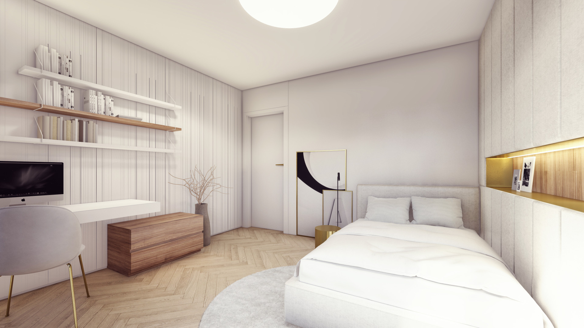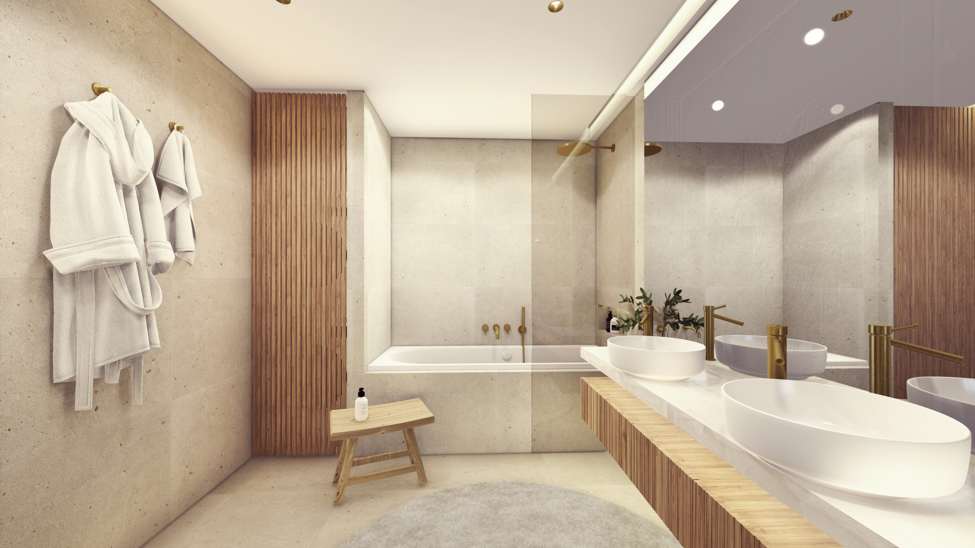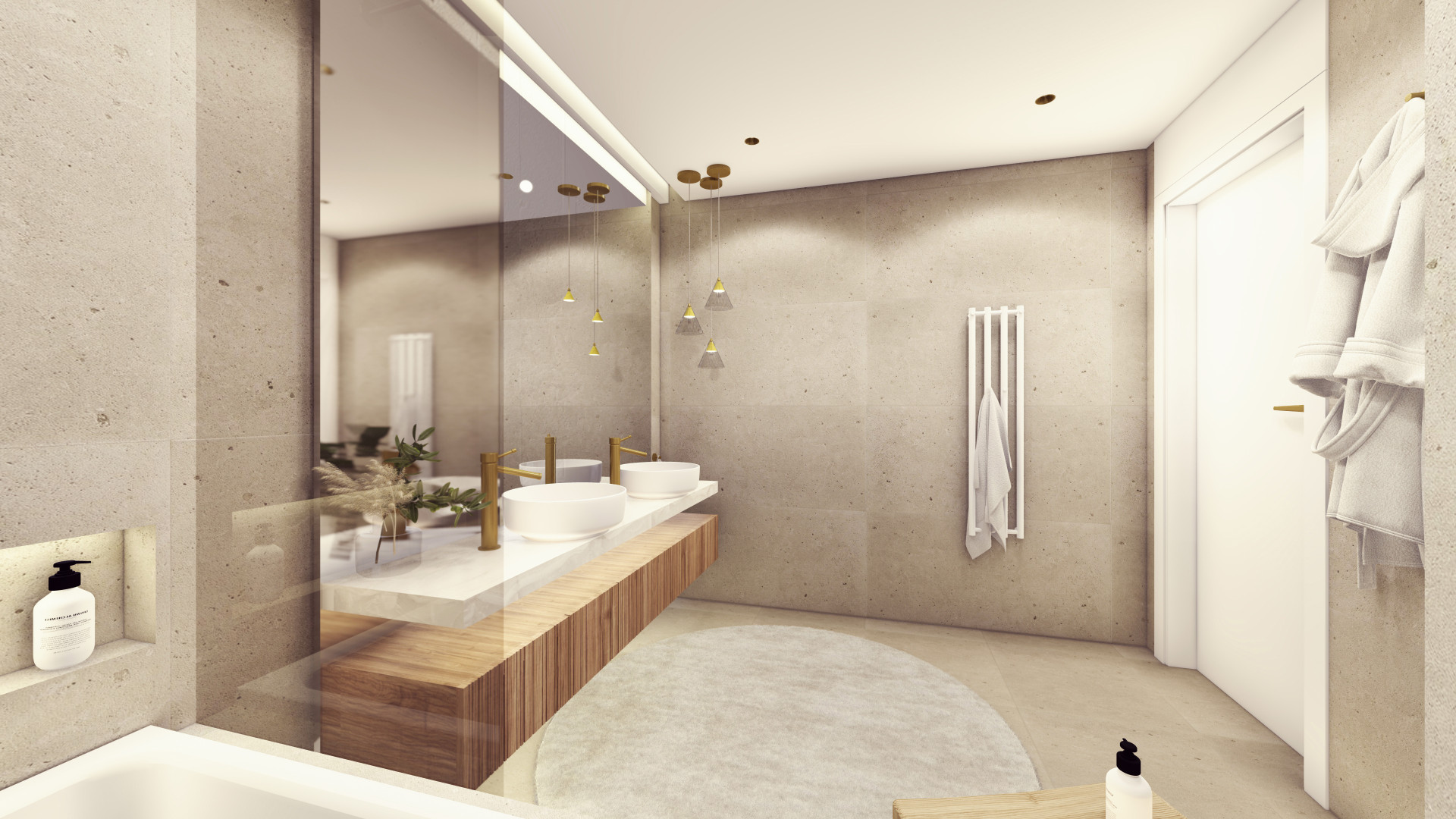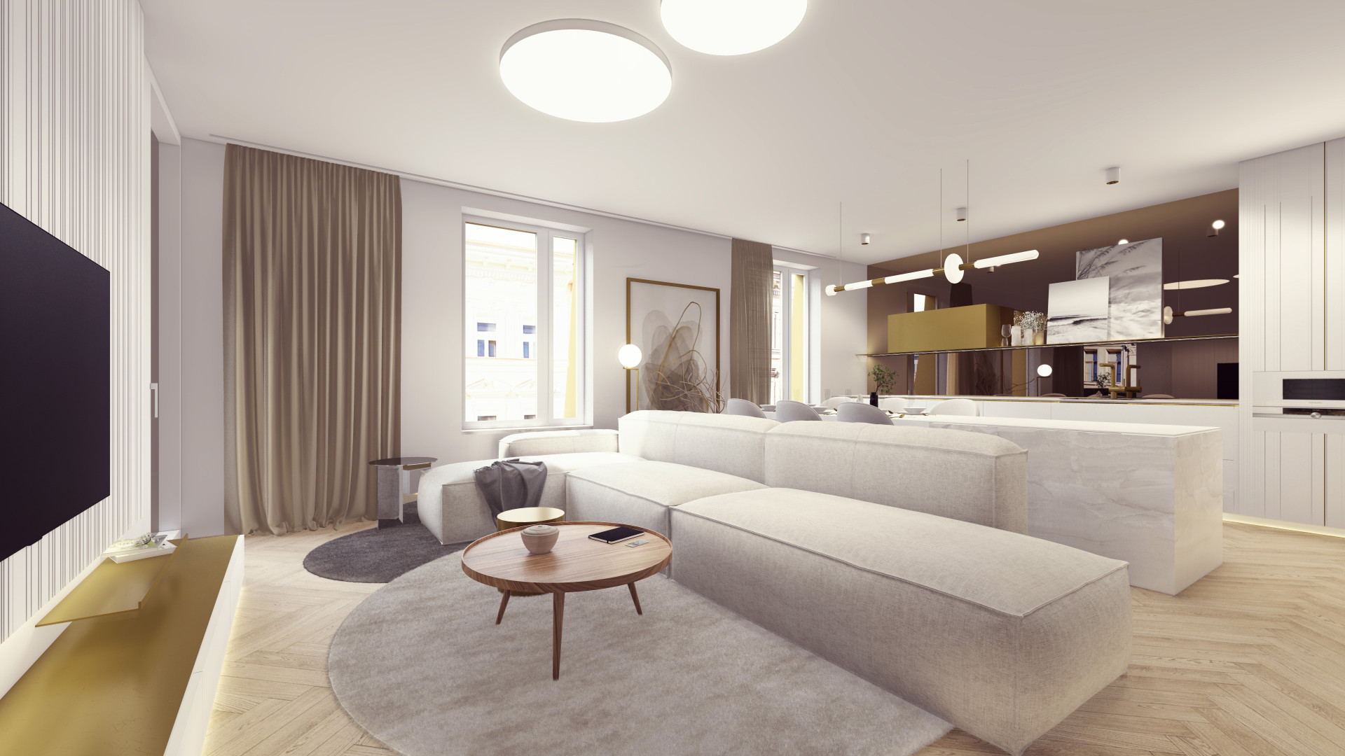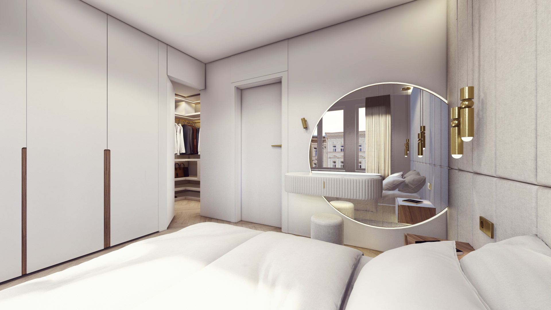 Architektonická kancelář Fránek Architects je také autorem společných vnitřních prostorů v domě, za návrhy jednotlivých bytů pak stojí už pražské studio KarlinBlok, které je koncipovalo tak, aby designově komunikovaly s exteriérem. Všech 27 jednotek nadále zůstane v rukách společnosti CREDITAS Real Estate, která je bude dlouhodobě pronajímat. Vybaveny budou kompletně – od nábytku až po příbory – a v nadstandardní kvalitě. „Všechny byty mají interiéry navržené do posledních detailů a každý byt má svůj osobitý výraz. Nosnými prvky fasády jsou vertikály a mosaz, které jsme promítli i do interiérů bytů. Vertikální linie jsou zakomponované v truhlářských obkladech a kompozici autorských svítidel, mosaz se objevuje na detailech vybavení. Interiér každého bytu vizuálně propojují přírodní prvky − dubové parkety v jemném světlém odstínu v kombinaci s ořechovou dýhou, která se objevuje v detailech jednotlivých kusů nábytku a v případě velkých bytů přechází ve větší plochy na truhlářských obkladech,“ popisují Michal Sůva a Kateřina Ždychová ze studia KarlinBlok.