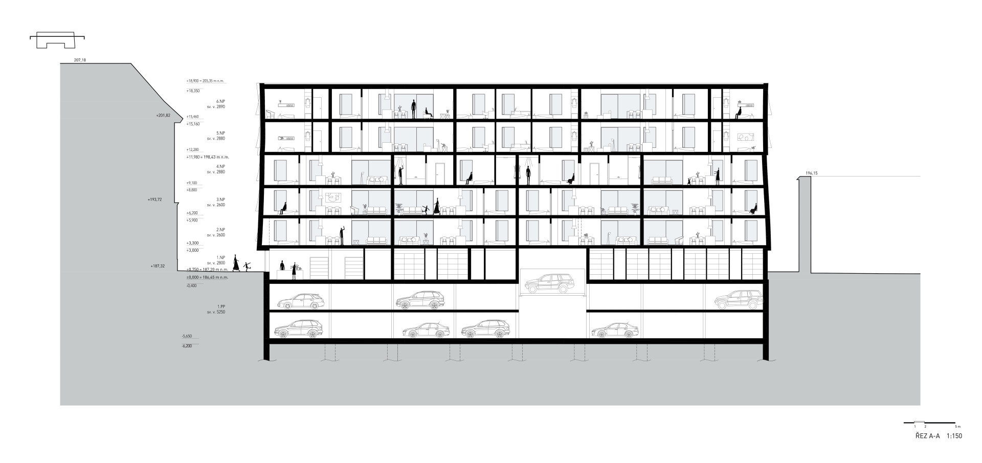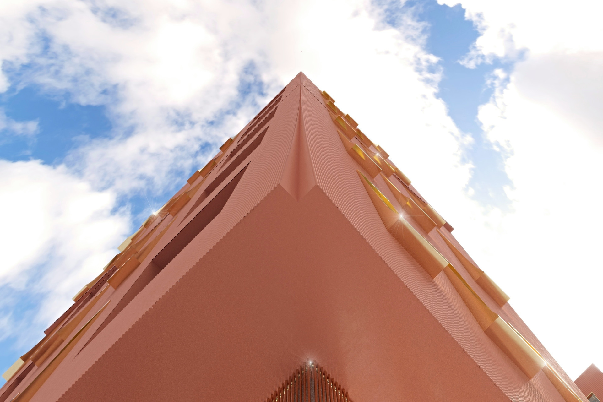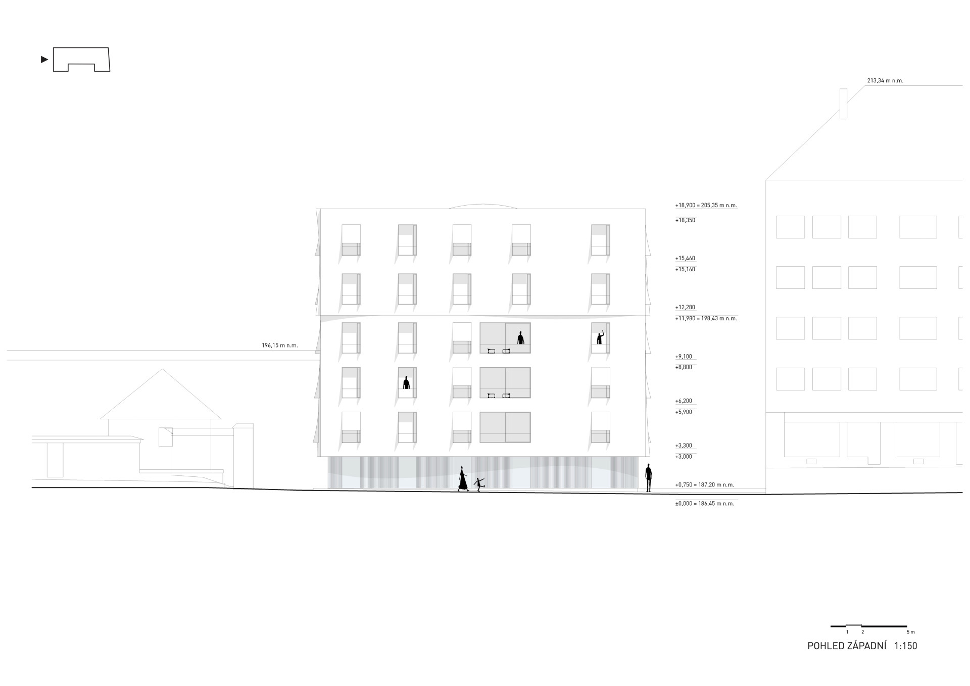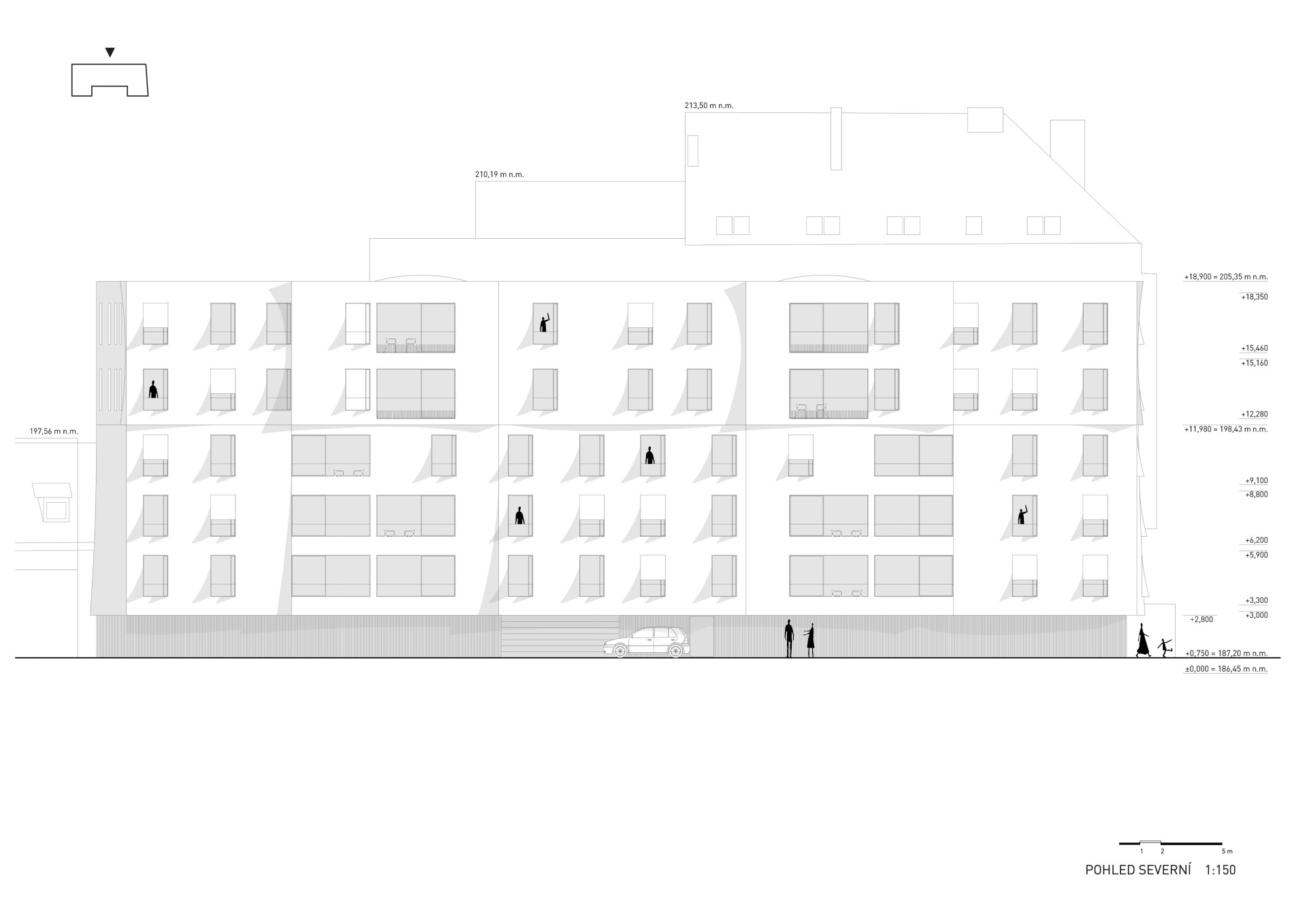 Bytový dům, který dnes na místě roste, je hmotově úplně stejně objemný jako ten, který Zdeněk Fránek navrhl v roce 2012. V kontextu města ho dělá jiným nové řešení fasád – budou mít cihlovou barvu s ručně taženým vroubkovaným rastrem. Ten hraje na stavbě svou roli jak v detailu, tak v dálkových pohledech, ve spodní části bude jemnější, nahoře hrubší. Sofistikované členění fasád, které se na různých místech prohýbají nebo vypukají, přinese například ten efekt, že se nejvyšší podlaží domu specificky zapojí do kontextu střešní krajiny místa.