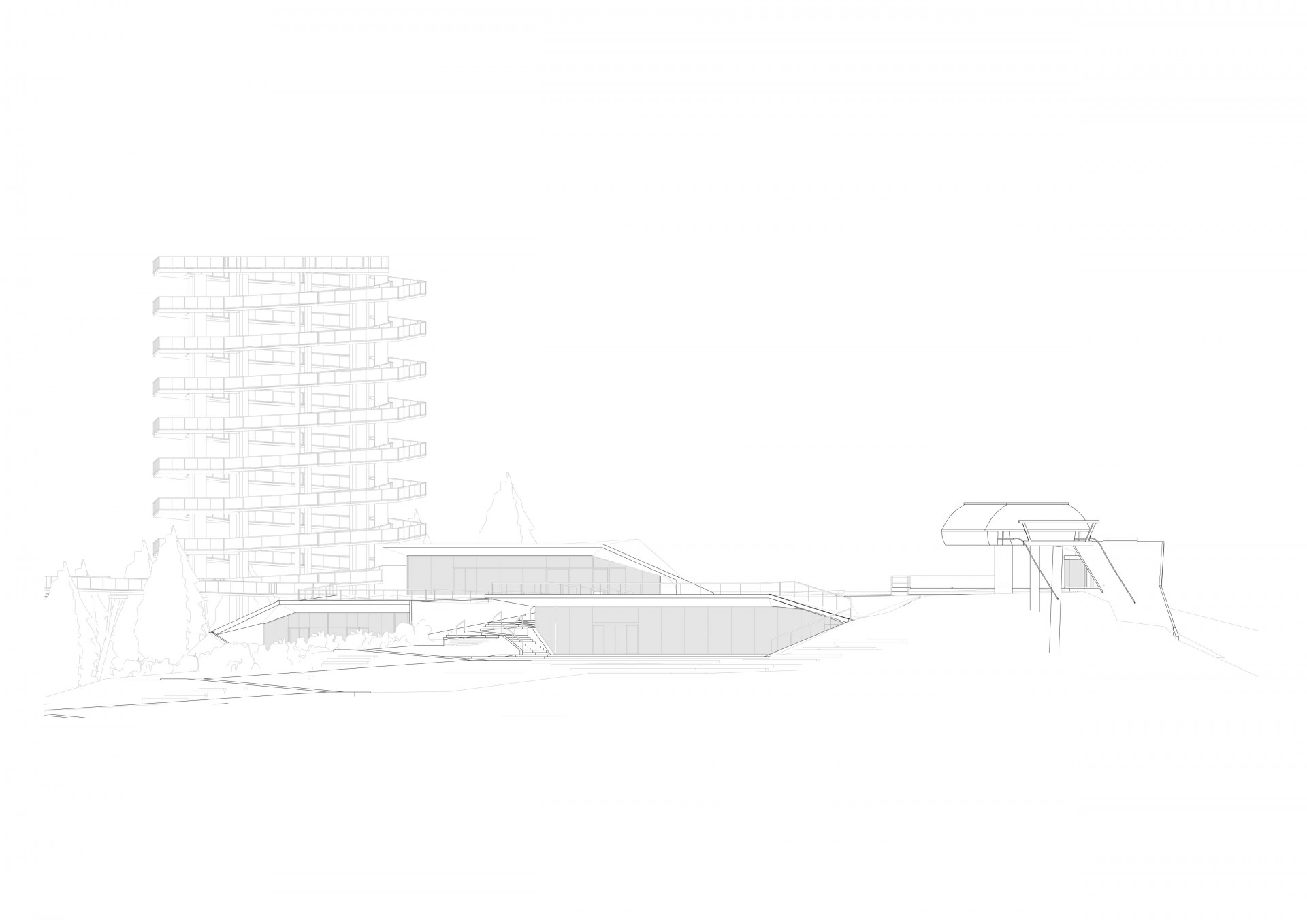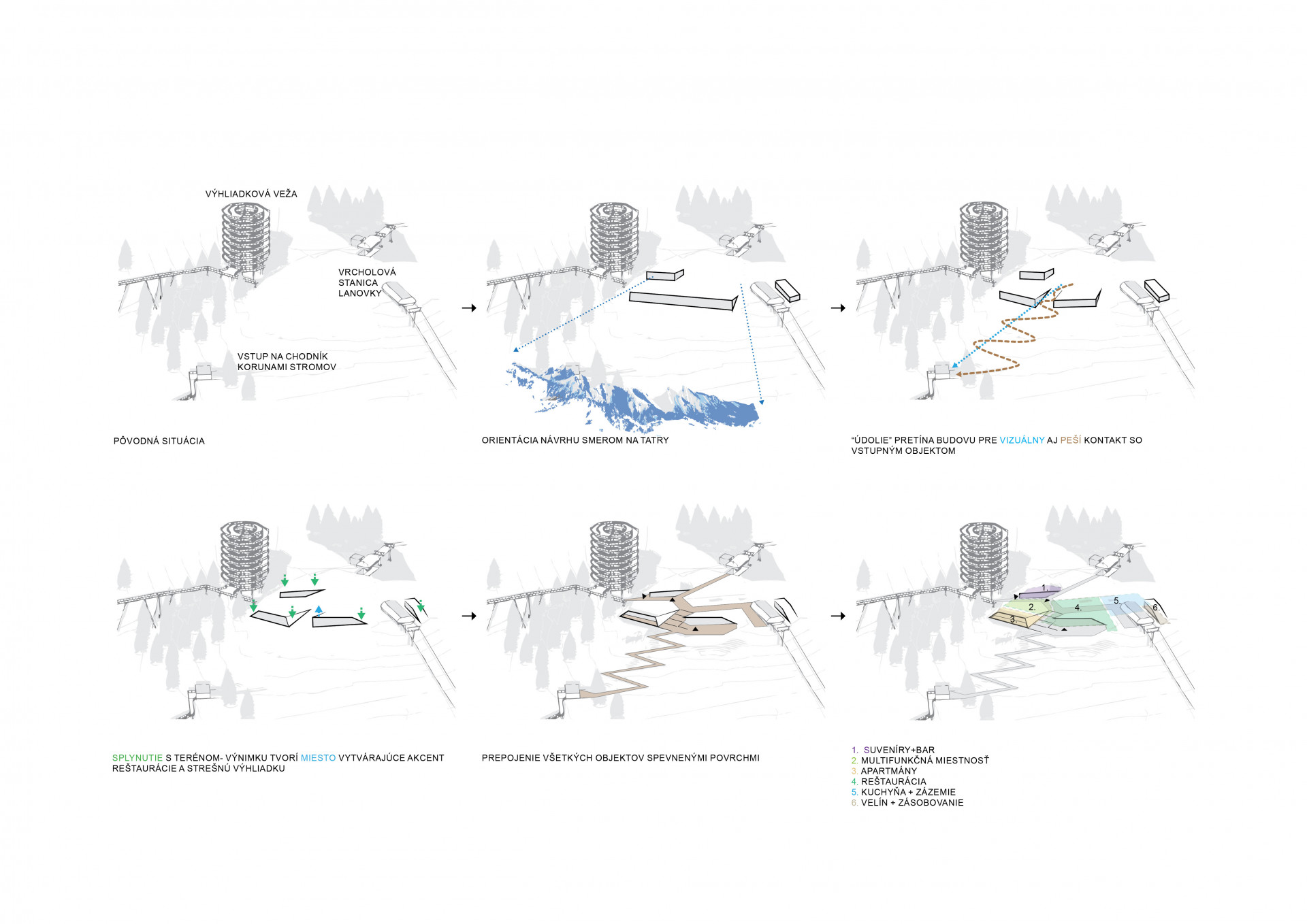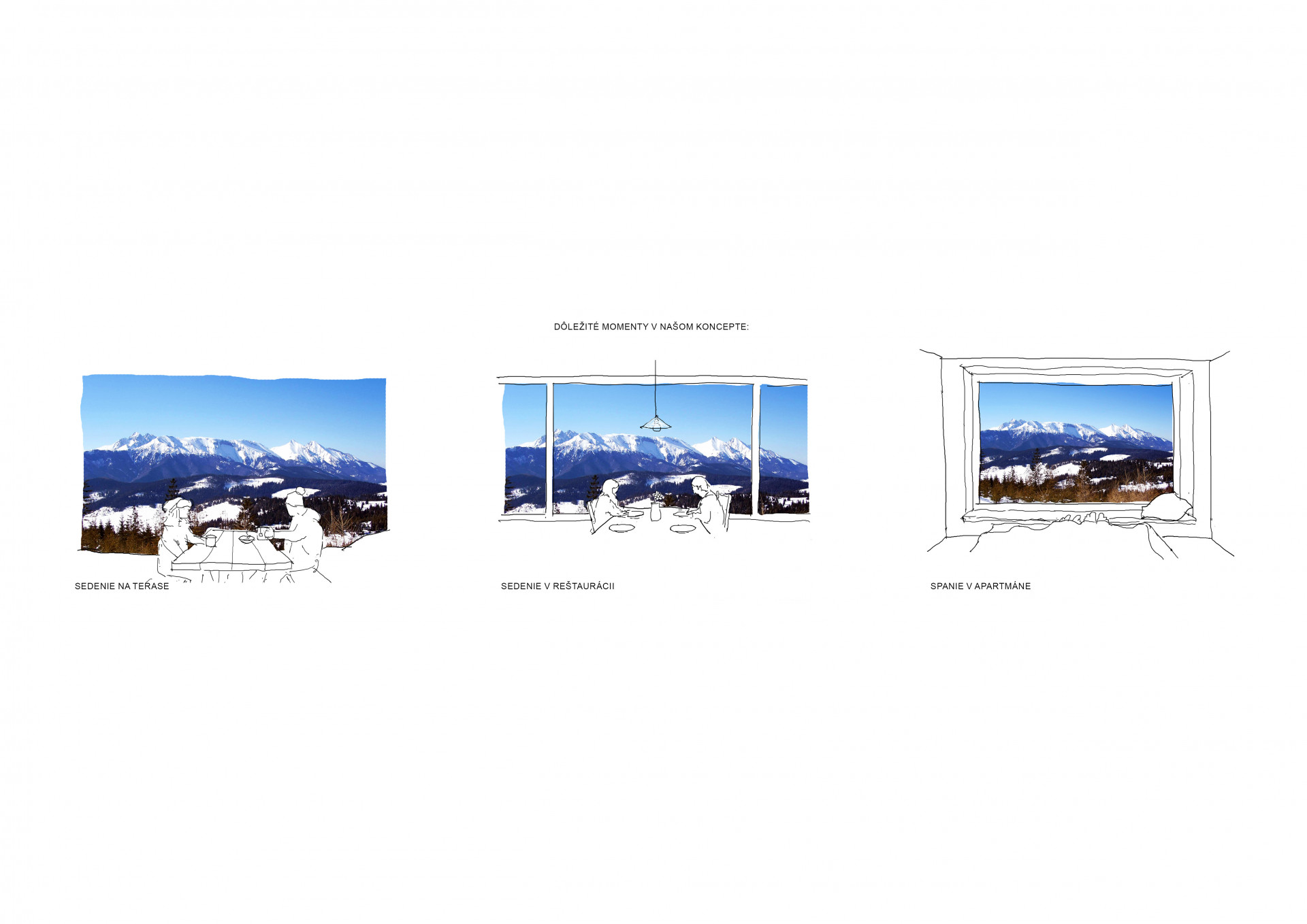 „Rozhodli jsme se vytvořit přechod v centrální poloze jižní fasády, čímž vznikl přímý vizuální kontakt mezi horním plató a nástupem na Stezku. Zároveň se tím rozdělila celistvá plocha fasády na část restaurační a část, kterou zaujímají apartmány. Tyto části navíc nejsou v jedné rovině, ale kopírují vrstevnici, což přináší hned dvě výhody najednou. Jednotlivým apartmánům poskytuje toto řešení větší soukromí a zároveň jsme tím snížili množství potřebných terénních úprav,“ popisují komplexnost návrhu architekti z Ateliéru Compass.