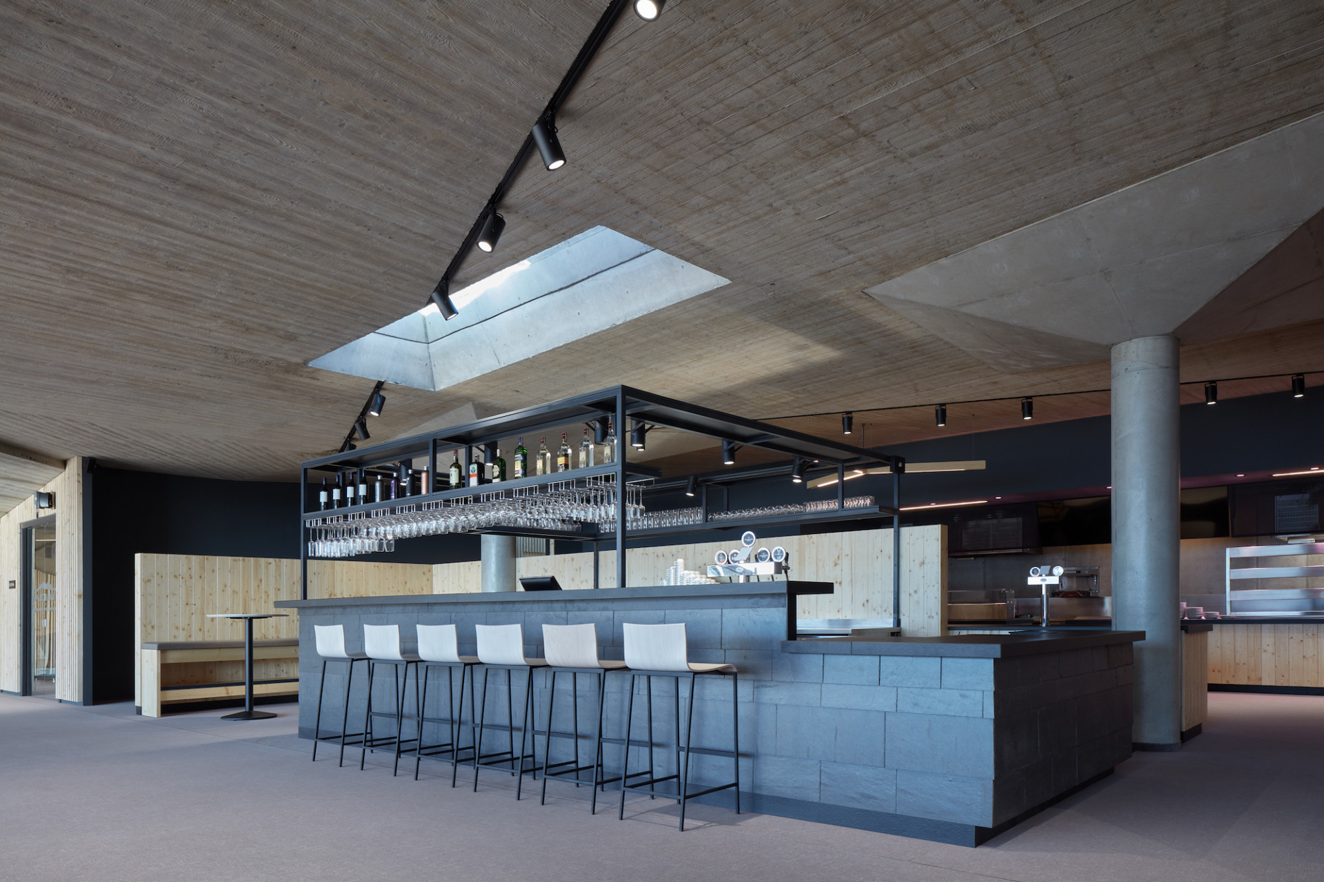 Většinu plochy nižšího – hlavního – podlaží zaujímá restaurace s potřebným zázemím. Daleké výhledy umožňují prosklené plochy sloupko-příčkové fasády Aluprof na celou výšku prostoru. Vedle 180 míst k sezení mohou návštěvníci využít i barový ostrov a samoobslužný výdej, který uspokojí poptávku i v návštěvních špičkách. Na prostor restaurace dále navazuje prostorná venkovní terasa s 350 místy a pomocným terasovým barem. Díky vysokým prolamovaným stropům, světlým materiálům i velké ploše prosklení působí restaurace i přes nemalou hloubku prostoru vzdušně a prosvětleně.