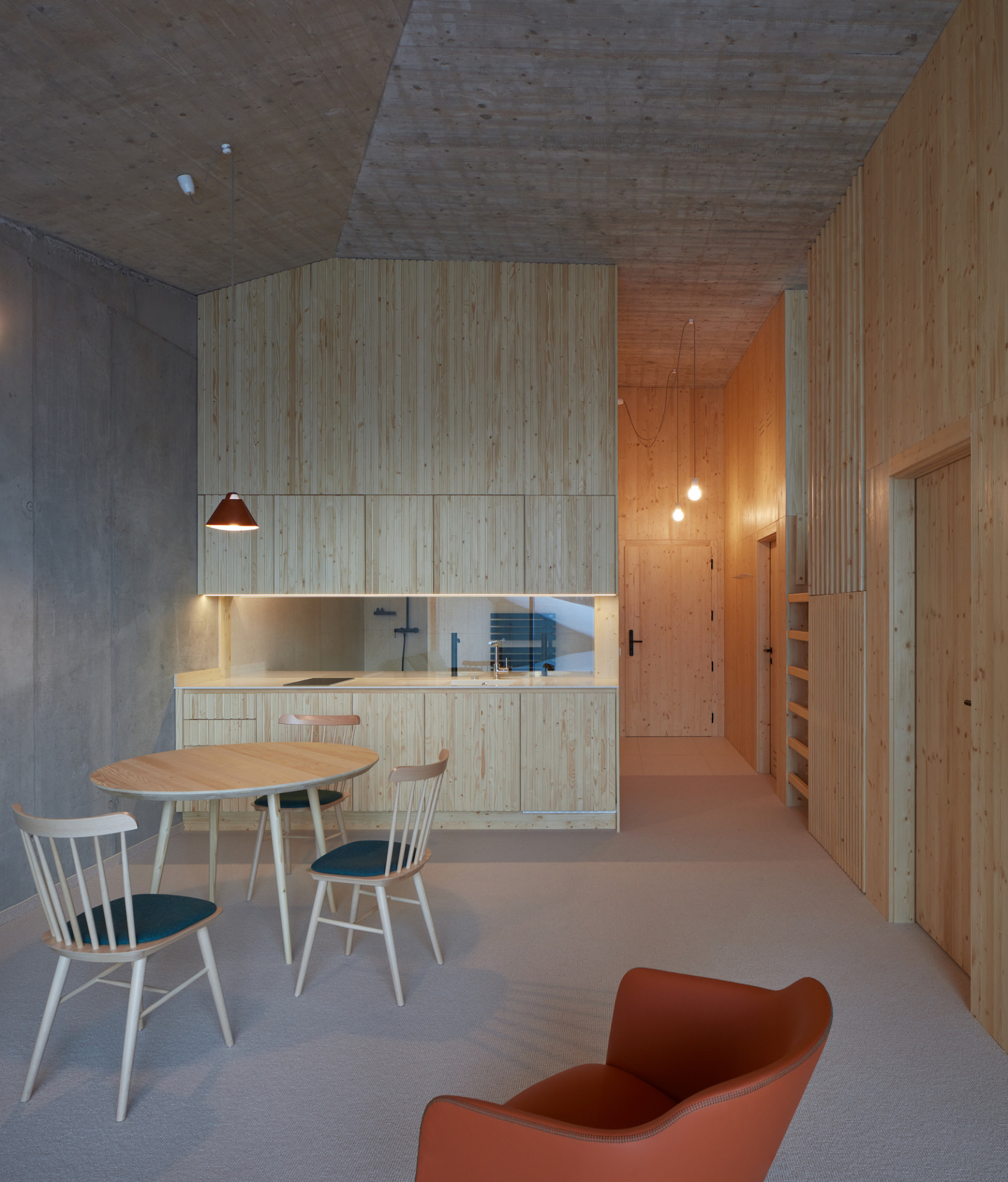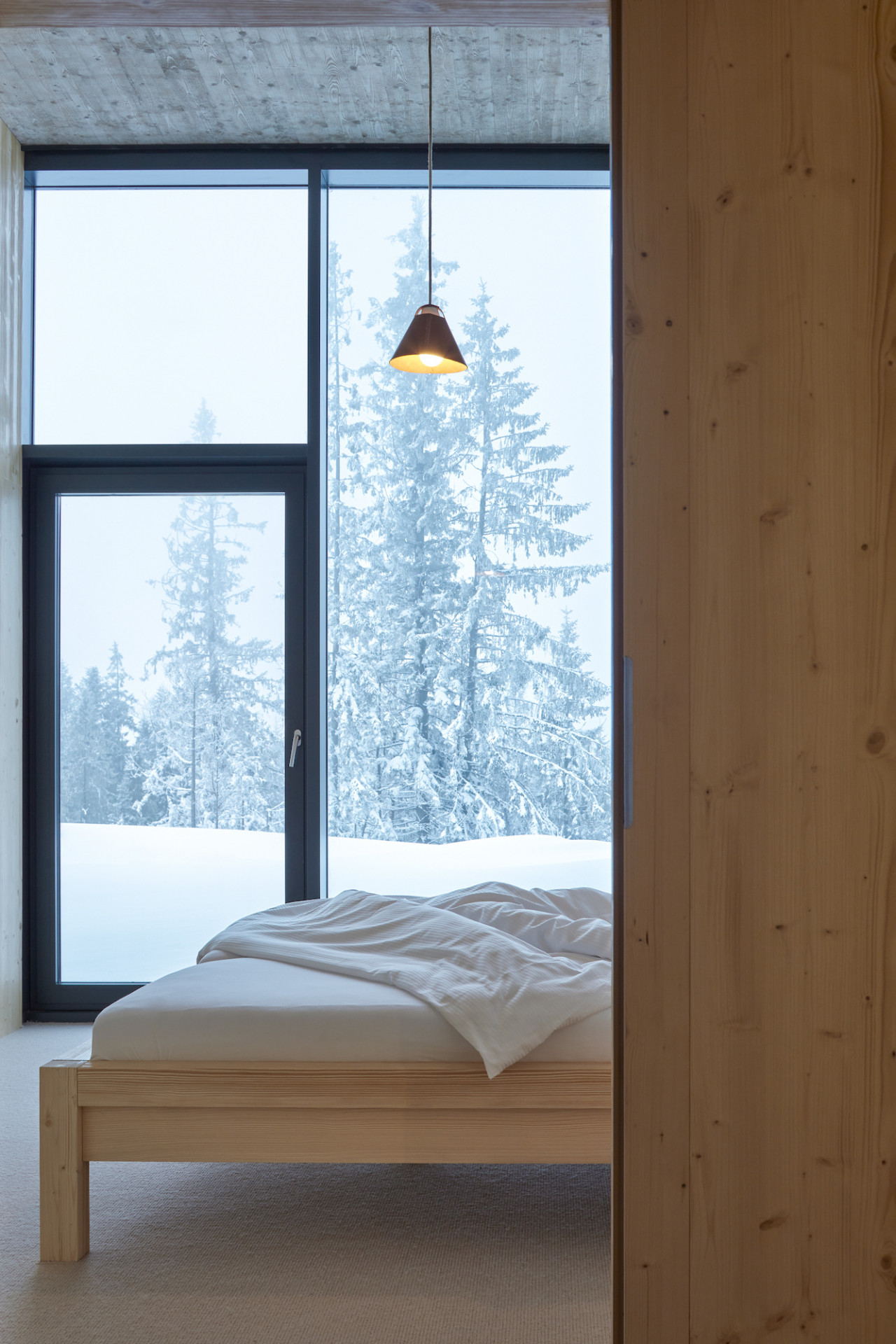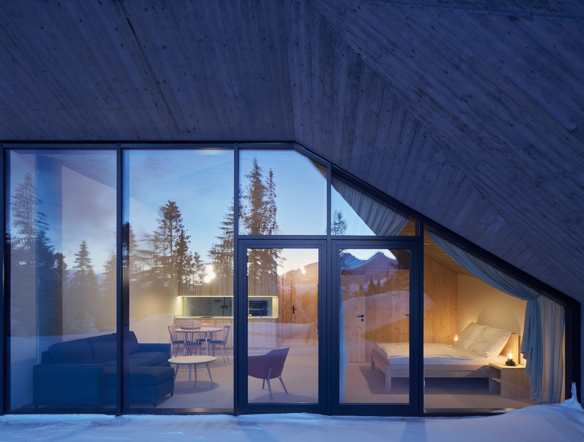 Jako základní materiály zvolili architekti beton a dřevo, které ve své přirozenosti a syrovosti ladí se svým horským okolím. Pro bednění stropu posloužily smrkové desky, které umožnily vykládat složité tvary. Výsledná textura pohledového betonu tak současně reaguje na smrkový obklad stěn. Části bednících desek autoři následně důvtipně použili na dělící zástěny na toaletách. Zatímco v exteriéru hraje prim beton, v interiéru se ve velké míře uplatňuje smrkové dřevo, které doslova obaluje pokoje apartmánů nebo se uplatňuje v podobě obkladu barových pultů či dělících příček.