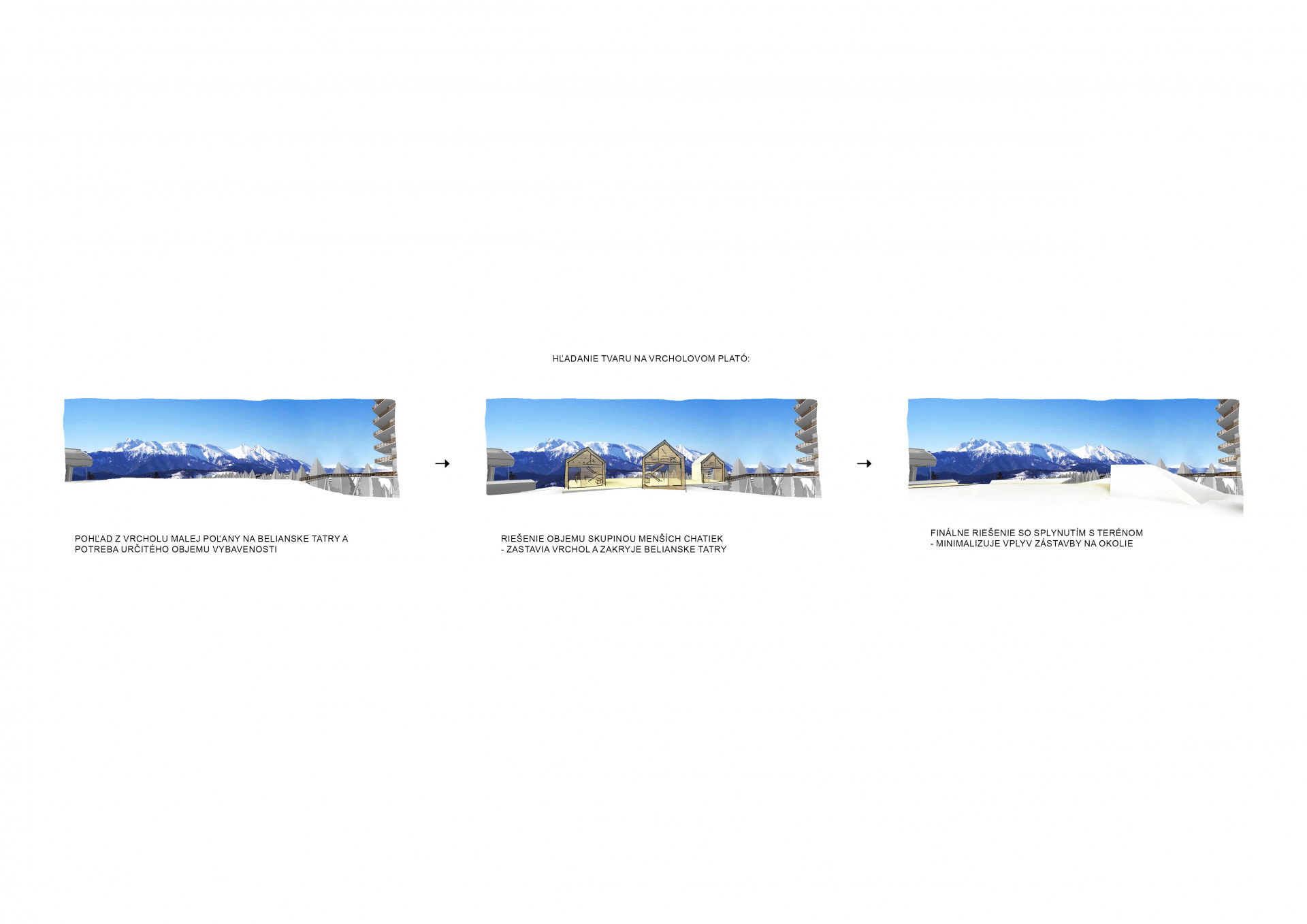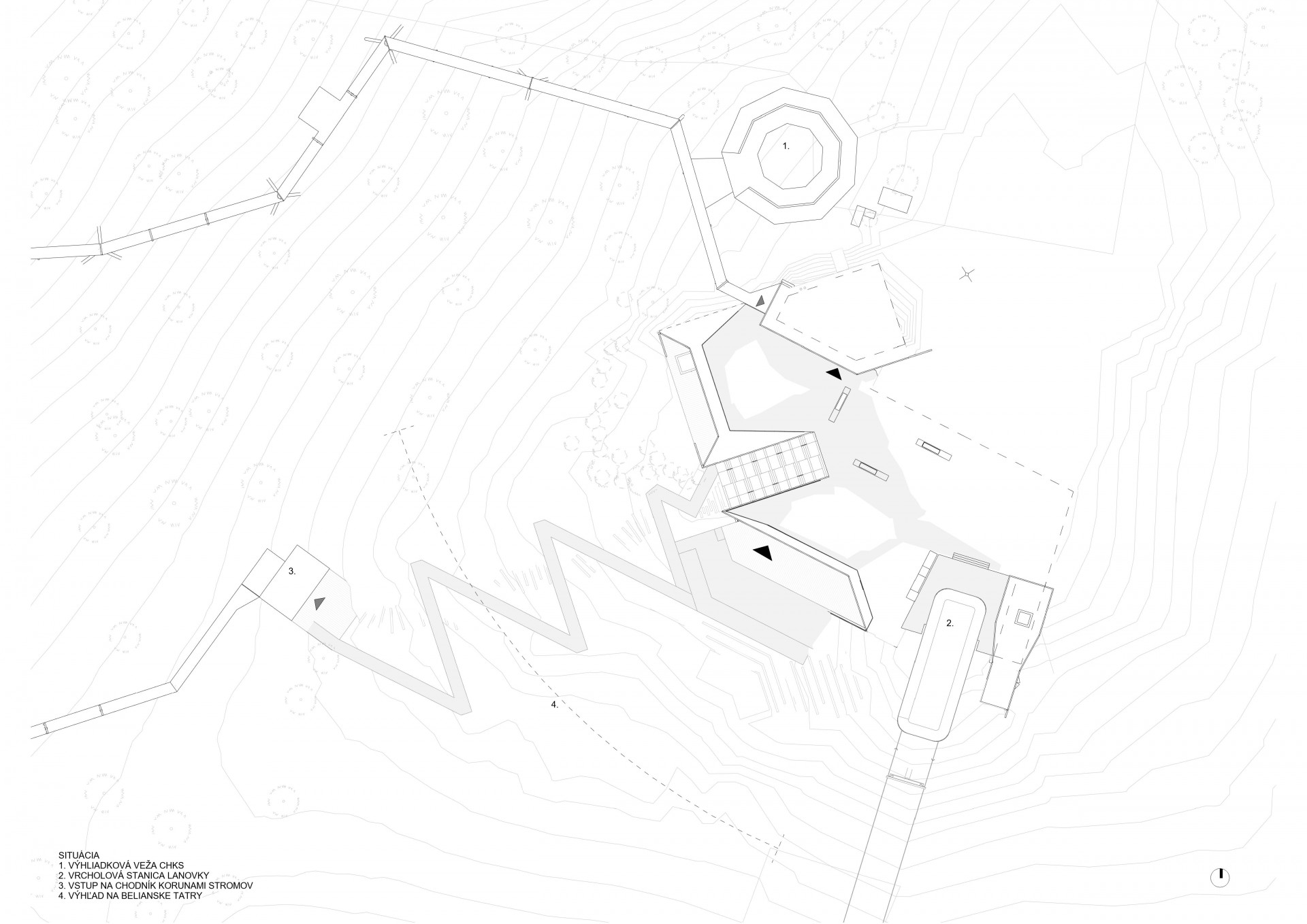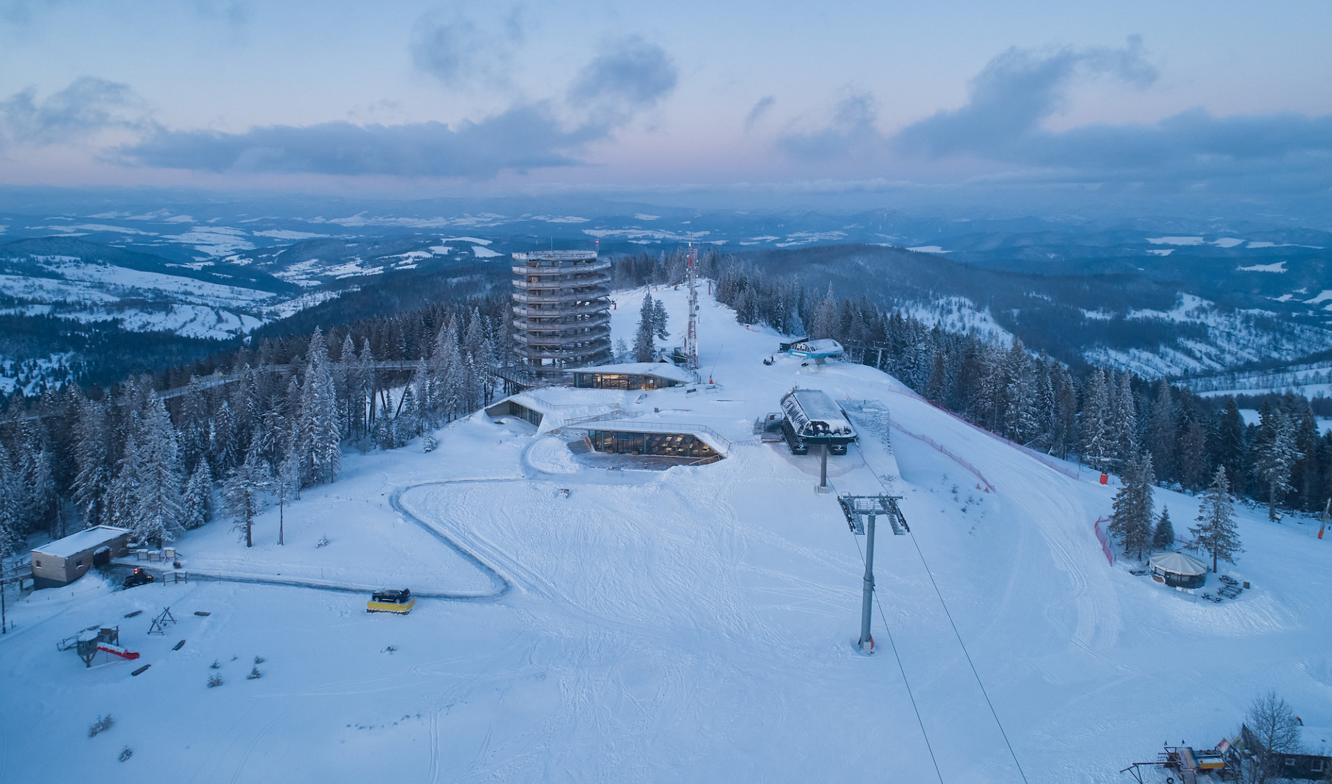 Maximální splynutí stavby s terénem – to byl hlavní cíl studia Compass Architekti při návrhu nového zázemí horského střediska na severu Slovenska. Přirozený sklon vrcholu se odrazil také ve tvarech šikmých stropů a pochozích zelených střech.