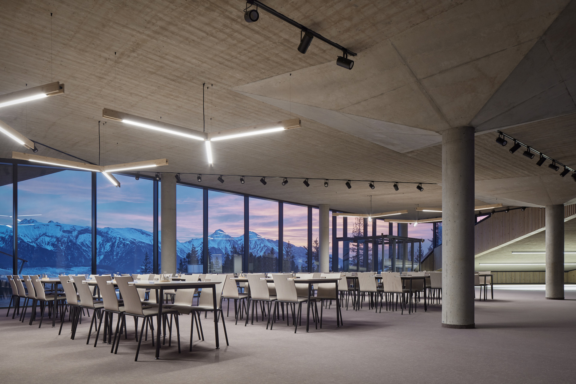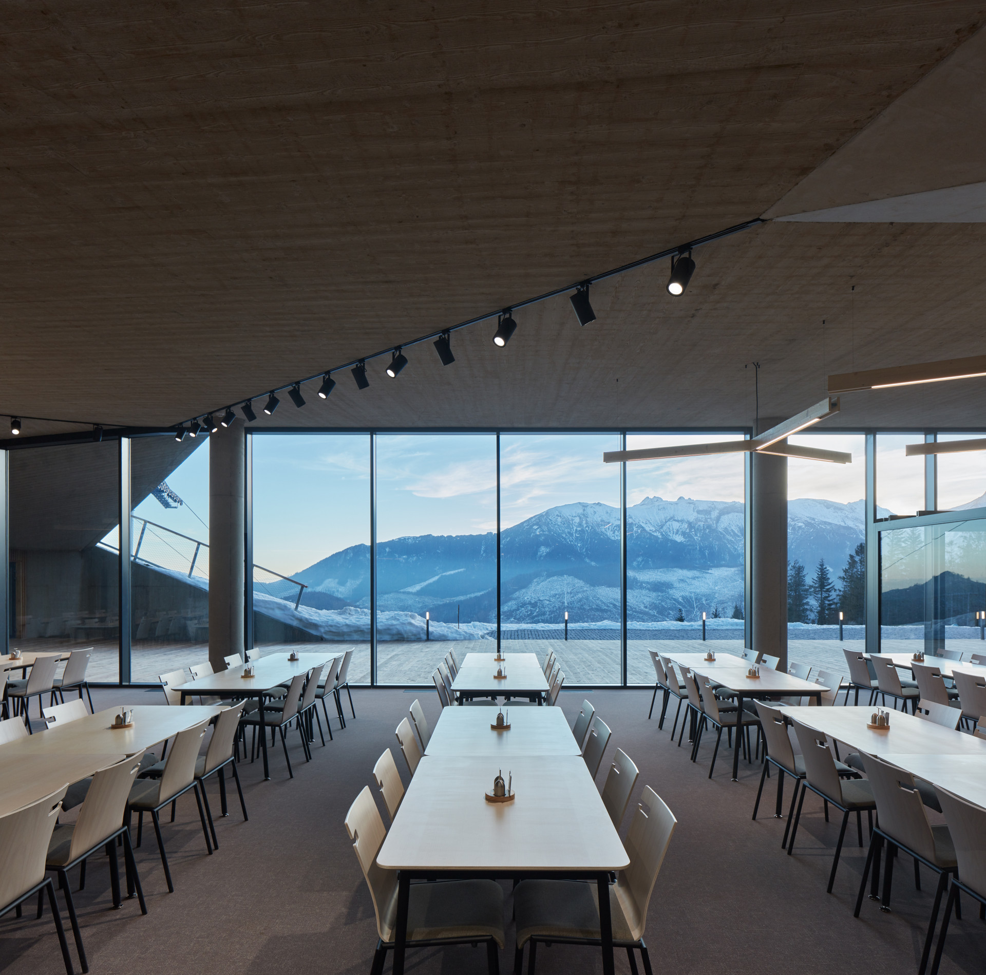 Veškeré prostory, které nevyžadují přímé denní světlo, situovali architekti do podzemí. Při dispozičním řešení významně napomohla i orientace svahu směrem na jih. Atraktivní vnitřní prostory restaurace tak díky velkým proskleným plochám nabízejí návštěvníkům úchvatné výhledy na horský masiv Belianských Tater. Stavba plynule kopíruje tvar svahu díky sešikmeným okrajům zelené střechy.