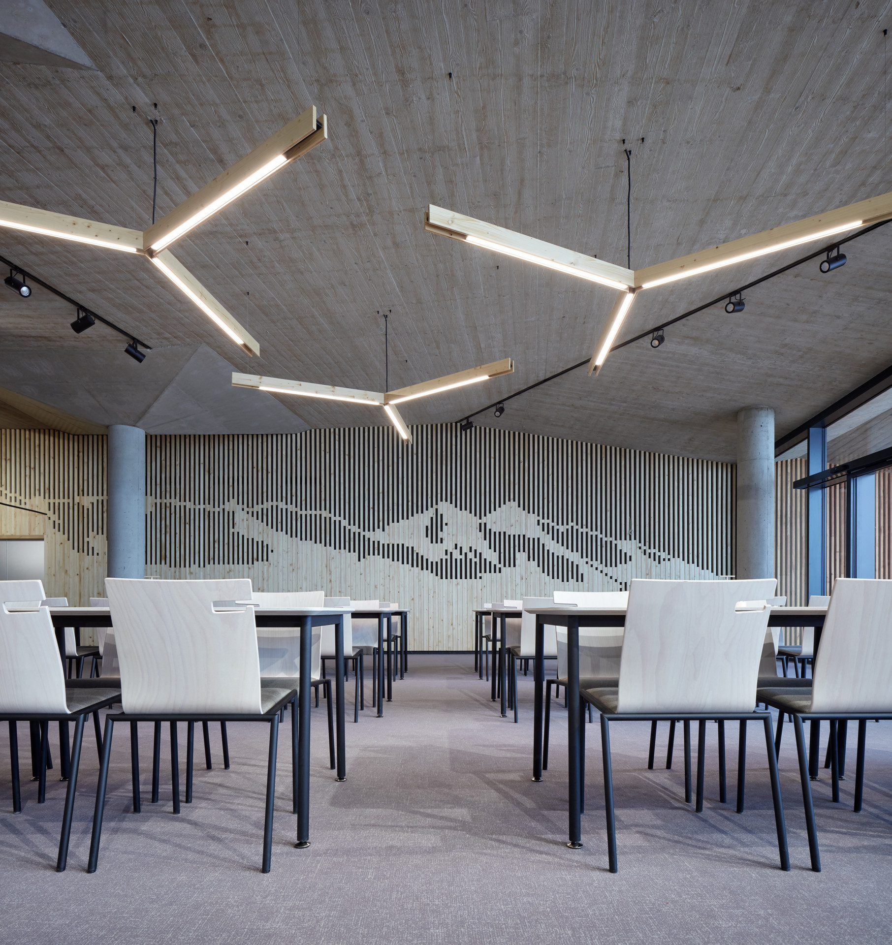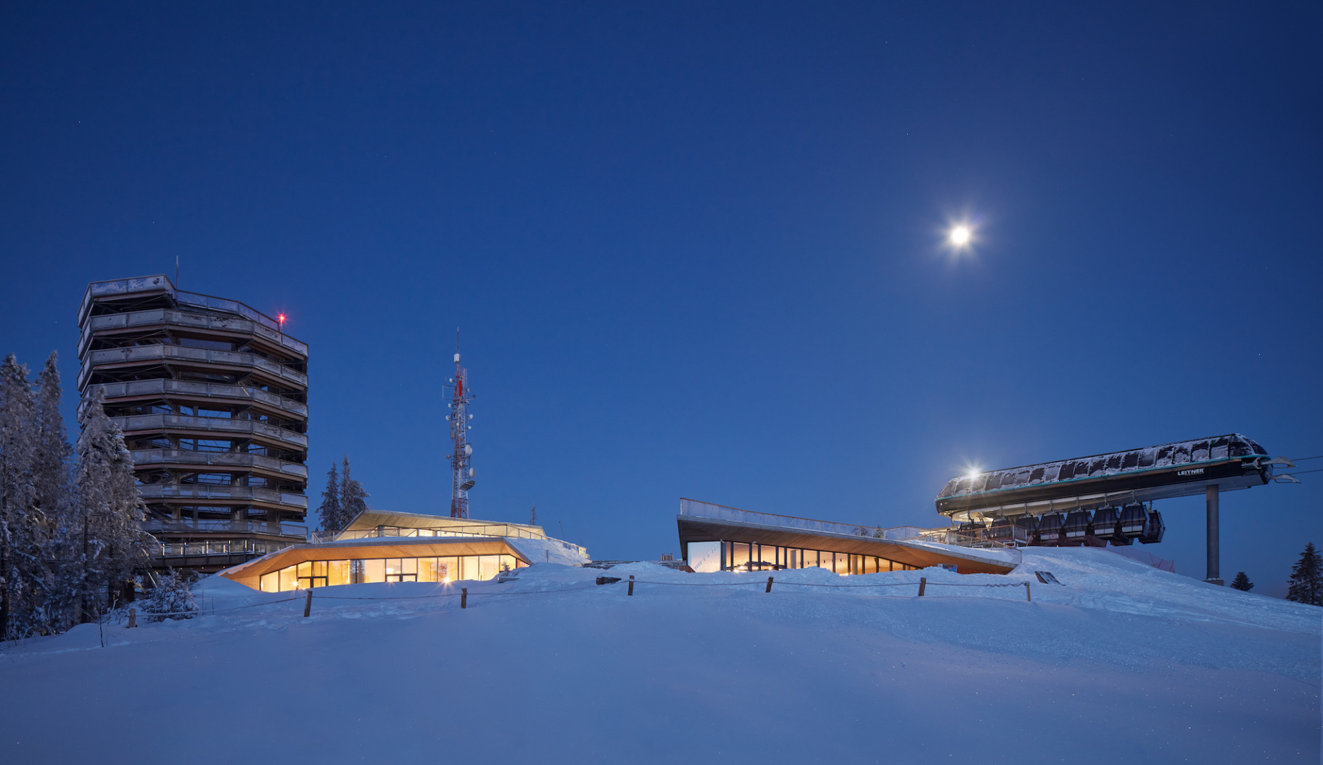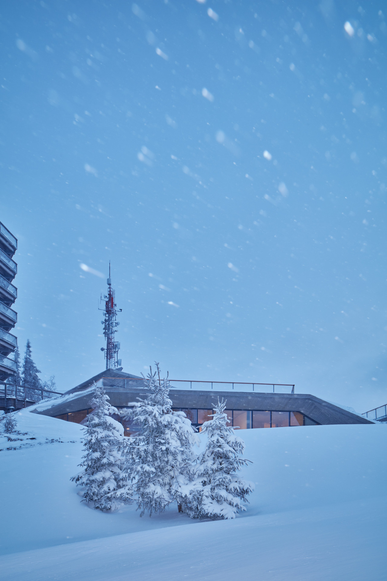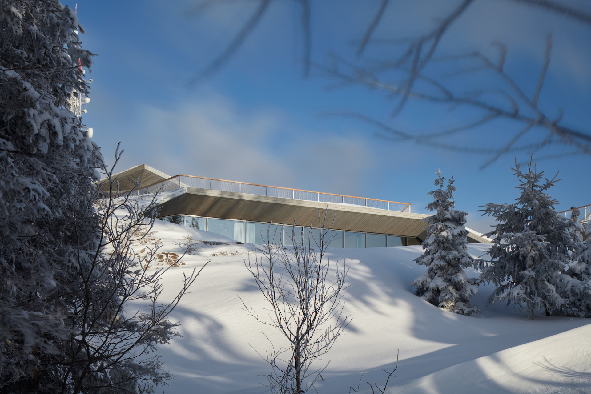 Velká hloubka podzemní části si vyžádala použití světlíků. Ty architekti kvůli ochraně skla před lyžaři spojili s lavičkami umístěnými na pochozí střeše. Vyšší podlaží slouží pro výstup z lanovky a ze stezky v korunách stromů, do jehož blízkosti architekti situovali prodejnu suvenýrů a malý bar. Obě podlaží spojuje jak vnější schodiště s rampou, tak vnitřní vertikální komunikace.
