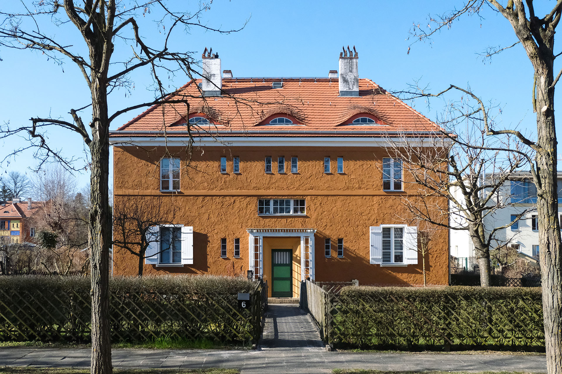 Hufeisensiedlung (1925–30), slavná „podkova“ v Britzu, vznikla ve spolupráci s Martinem Wagnerem – sociálně angažovaným architektem a tehdejším berlínským městským radním pro výstavbu. Centrální blok rámuje veřejný prostor se zelení, kolem něj řadové domy s vlastními zahrádkami. Barva slouží orientaci i identitě. Důstojnost bez přepychu. Identita bez výlučnosti.