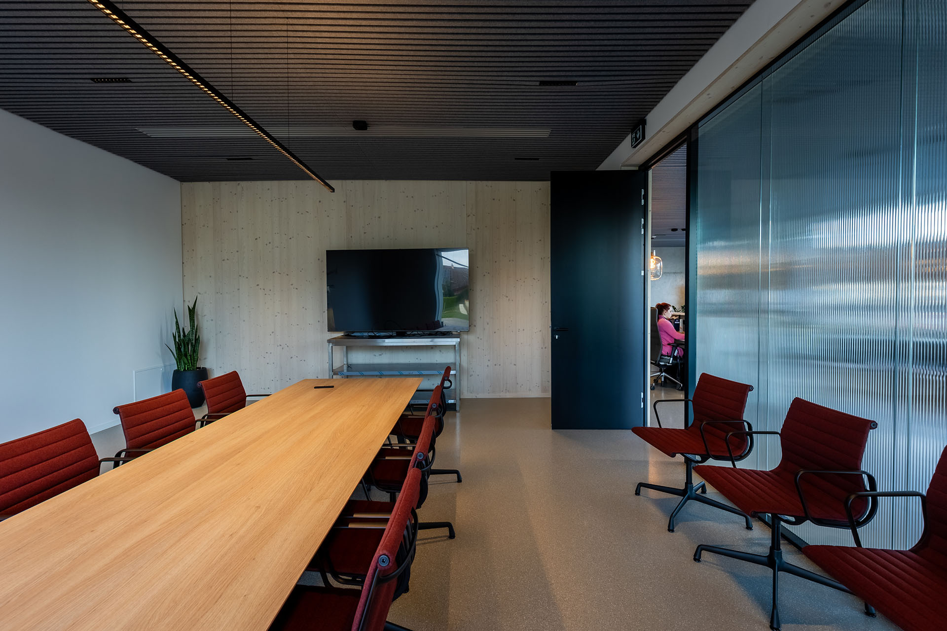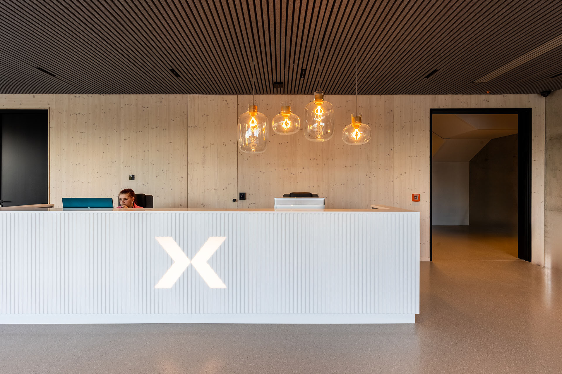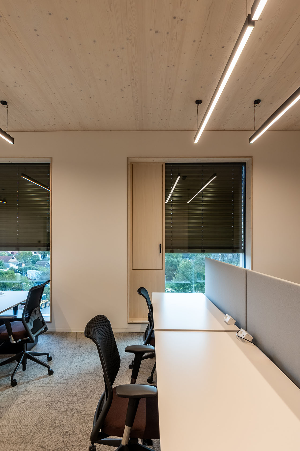 Vnitřní prostory jsou navrženy jako vzdušné, prosvětlené a otevřené. Najdete zde telefonní místnosti pro jednotlivce, menší kanceláře, otevřené pracovní prostory, zasedací místnosti i relaxační lounge. Pro investora byl zásadní vizuální dojem budovy. Architekti postavili celý interiér na pohledových panelech NOVATOP, které zajišťují jednotný a harmonický vzhled všech dřevěných ploch. Výsledný dojem podtrhují řemeslně zpracované detaily, jako jsou čisté přiznané spáry, skryté dveře, designový nábytek a precizní obložky. Navíc interiér oživuje charakteristická vůně dřeva, která každého příchozího doslova pohltí.