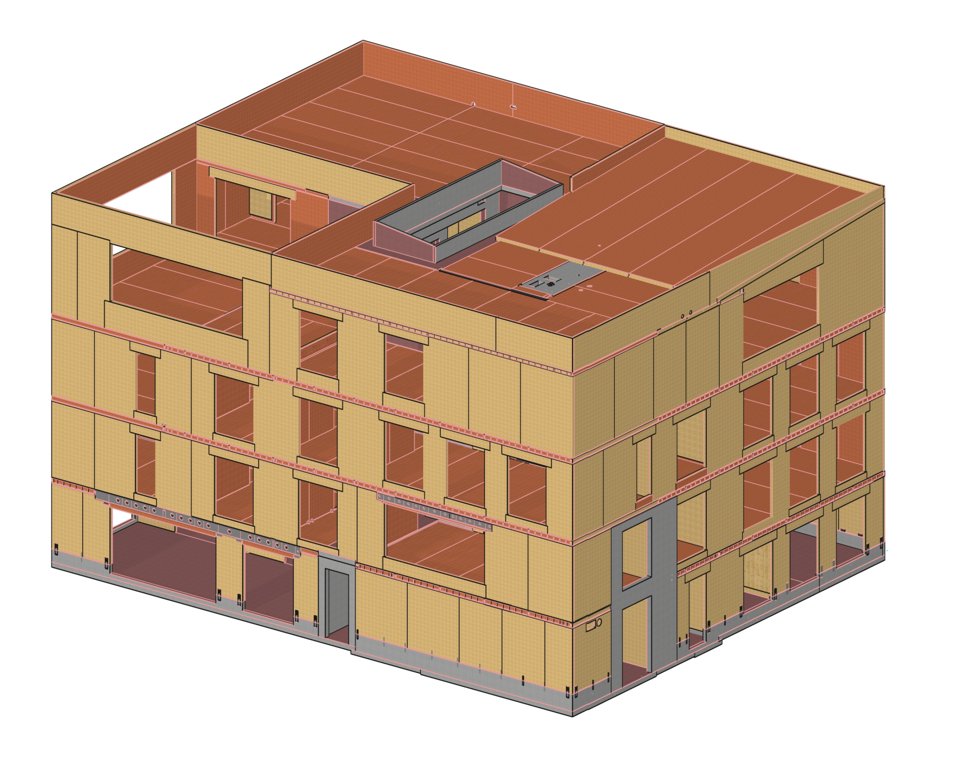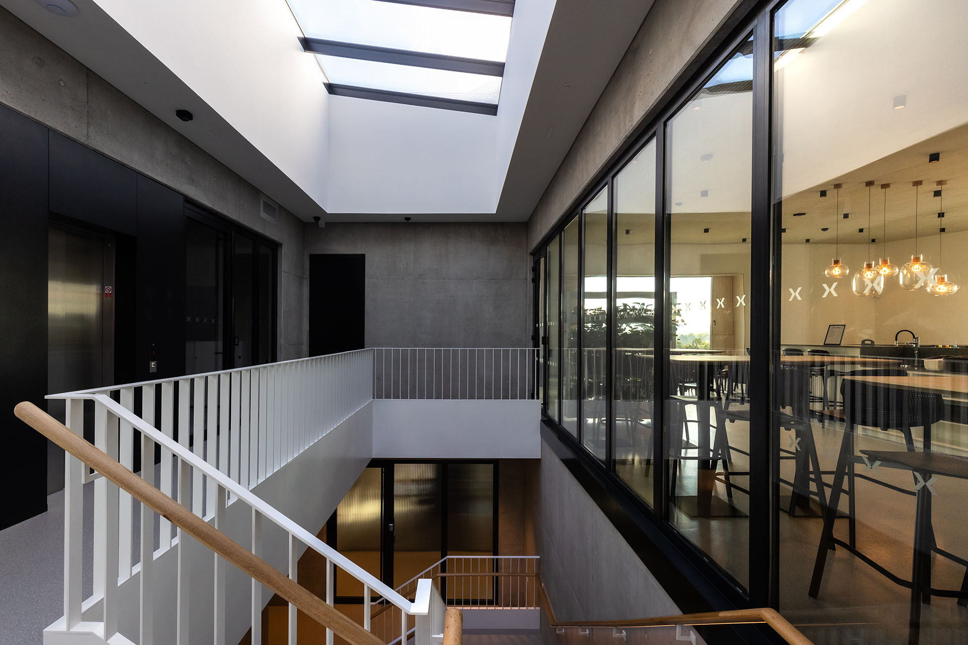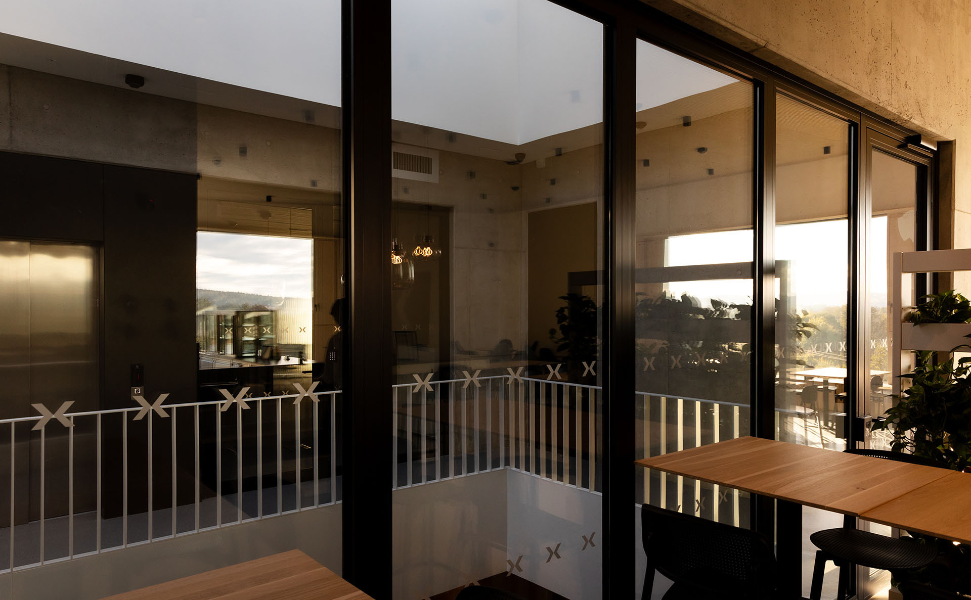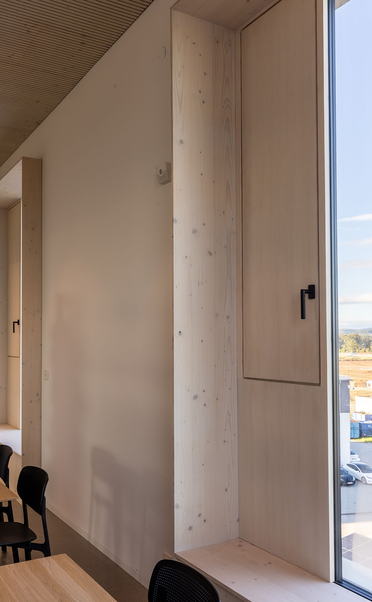 Vnitřní prostory jsou navrženy jako vzdušné, prosvětlené a otevřené. Najdete zde telefonní místnosti pro jednotlivce, menší kanceláře, otevřené pracovní prostory, zasedací místnosti i relaxační lounge. Pro investora byl zásadní vizuální dojem budovy. Architekti postavili celý interiér na pohledových panelech NOVATOP, které zajišťují jednotný a harmonický vzhled všech dřevěných ploch. Výsledný dojem podtrhují řemeslně zpracované detaily, jako jsou čisté přiznané spáry, skryté dveře, designový nábytek a precizní obložky. Navíc interiér oživuje charakteristická vůně dřeva, která každého příchozího doslova pohltí.