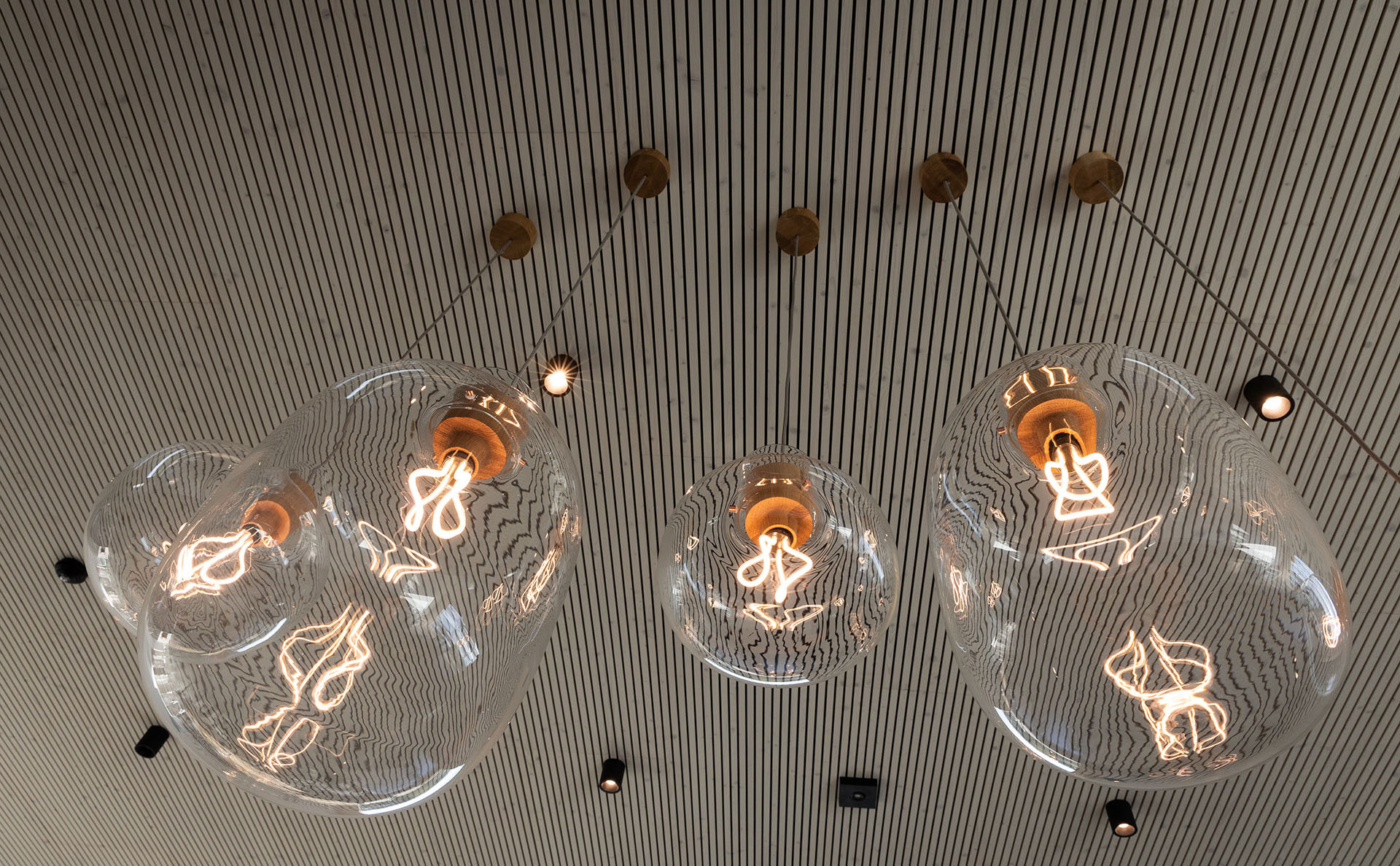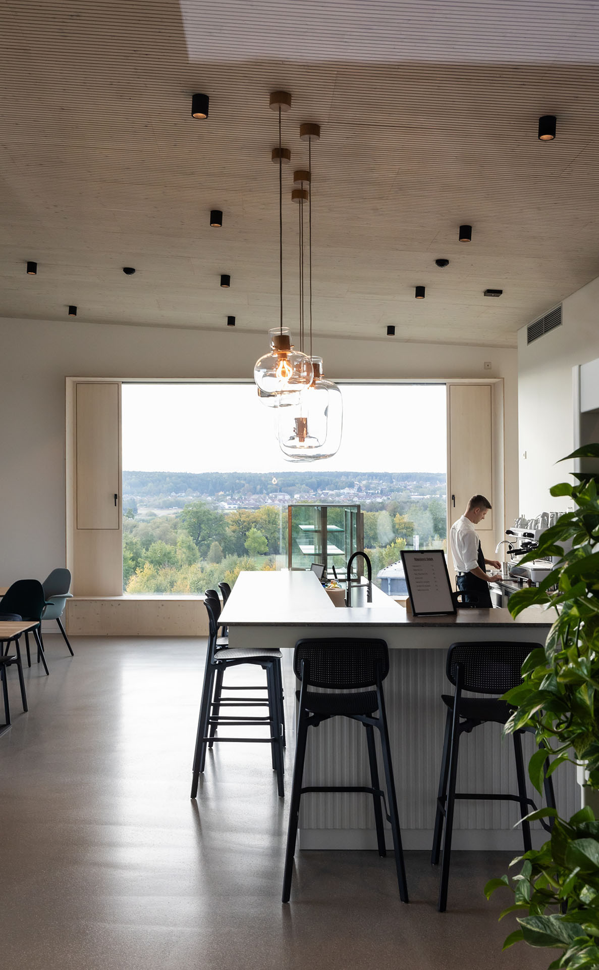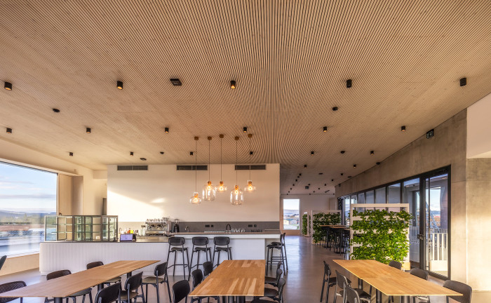 U systému NOVATOP stojí za zmínku stropní žebrové elementy, které oproti klasickému CLT i při osmimetrovém rozponu nejsou náchylné na kmitání a šetří hodně dřeva. Do dutin uvnitř je navíc integrovaný vápencový vsyp pro zlepšení stavební akustiky, aniž by navyšoval tloušťku podlahové konstrukce. Dvojstupňové opracování elementů umožnilo přesné napojení na ocelové průvlaky, které byly následně zaklopeny třívrstvou deskou. Ta plní nejen ochrannou funkci proti požáru, ale také estetickou. Stropy tak působí v ploše celistvě. V posledním patře, kde je velký otevřený prostor moderního bistra, jsou navíc stropní elementy obložené dřevěnými akustickými panely NOVATOP, které zaručují vysoký akustický komfort.