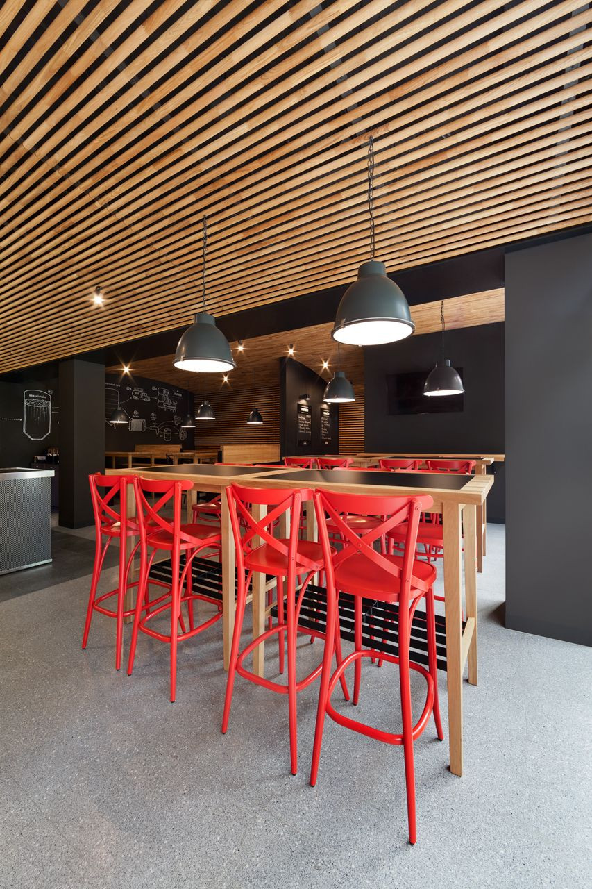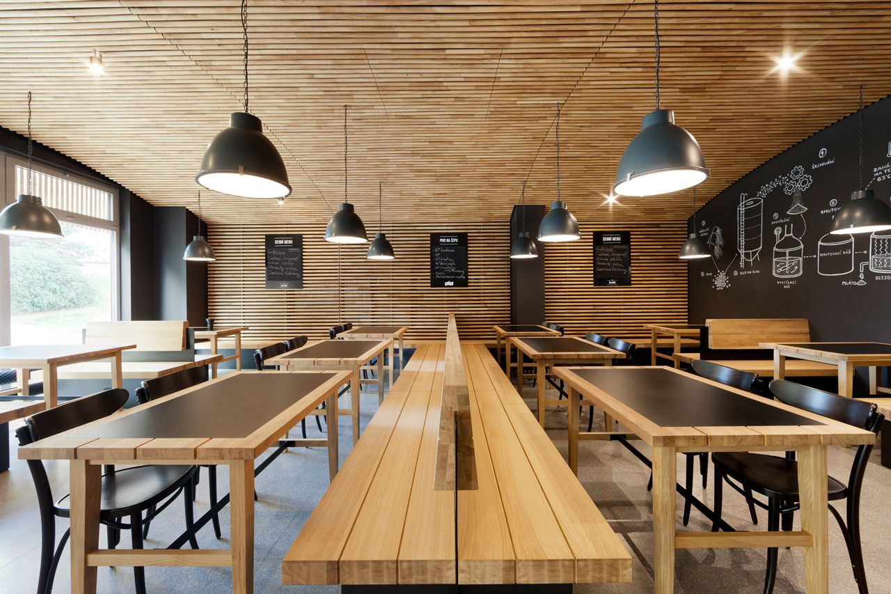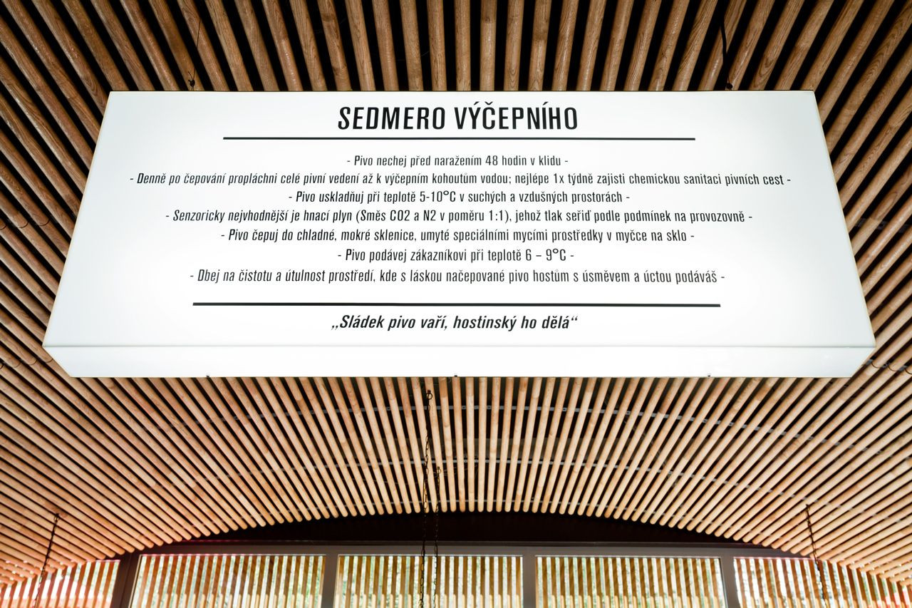 „Chtěli jsme přenést tradici a historizující formu i do prostor, jako jsou moderní komplexy, či nákupní centra, ve kterých může být provozovna také otevřena. Chtěli jsme tímto prvkem nepřímo odkázat na bohatou historii královského pivovaru, přitom zachovat soudobý charakter pivnice,“ říká Roman Vrtiška, druhý z autorského dua. Dřevo v interiéru dodává celku pocit útulnosti a zároveň díky použitým kulatým profilům zlepšuje celkovou akustiku v místnosti.