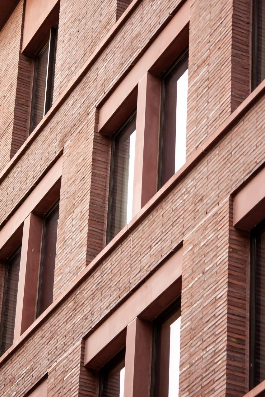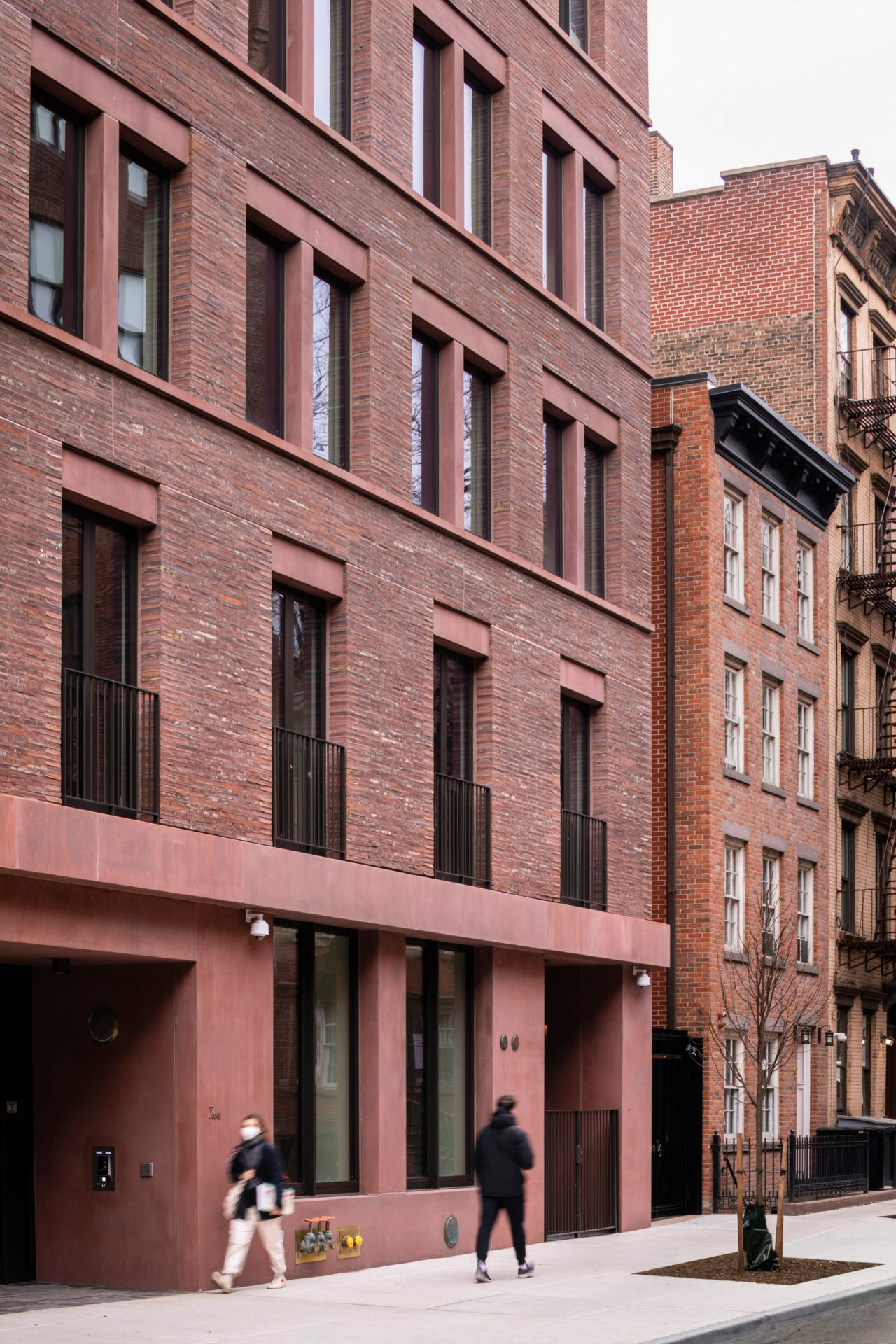 Nejsou to ale pouze architektonické principy a fasádní detaily, jimiž dům navazuje na své okolí. Jasnou kontinuitu lze vidět i v jeho materiálovém řešení. Většina domů na Jane Street je totiž zahalena do pláště z režného cihelného zdiva a není tak divu, že se i studio britského architekta k tomuto fasádnímu řešení uchýlilo. Bytový dům proto opatřilo obkladem z římských cihel, které jsou typické svým podlouhlým a velmi úzkým profilem. Vedle samotné materiálové podstaty ladí dům se svým okolí i barevně – zdivo je klasicky červené, možná lehce narůžovělé. Ve stejném odstínu je proveden i pohledový beton v přízemí a okenní překlady, do nichž byl přidán červený pigment.
