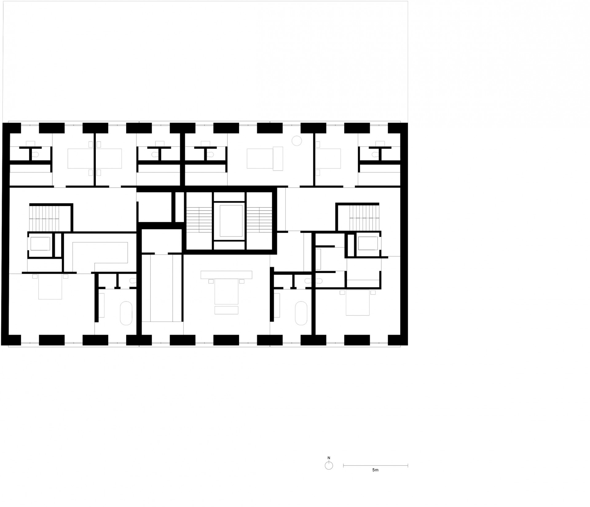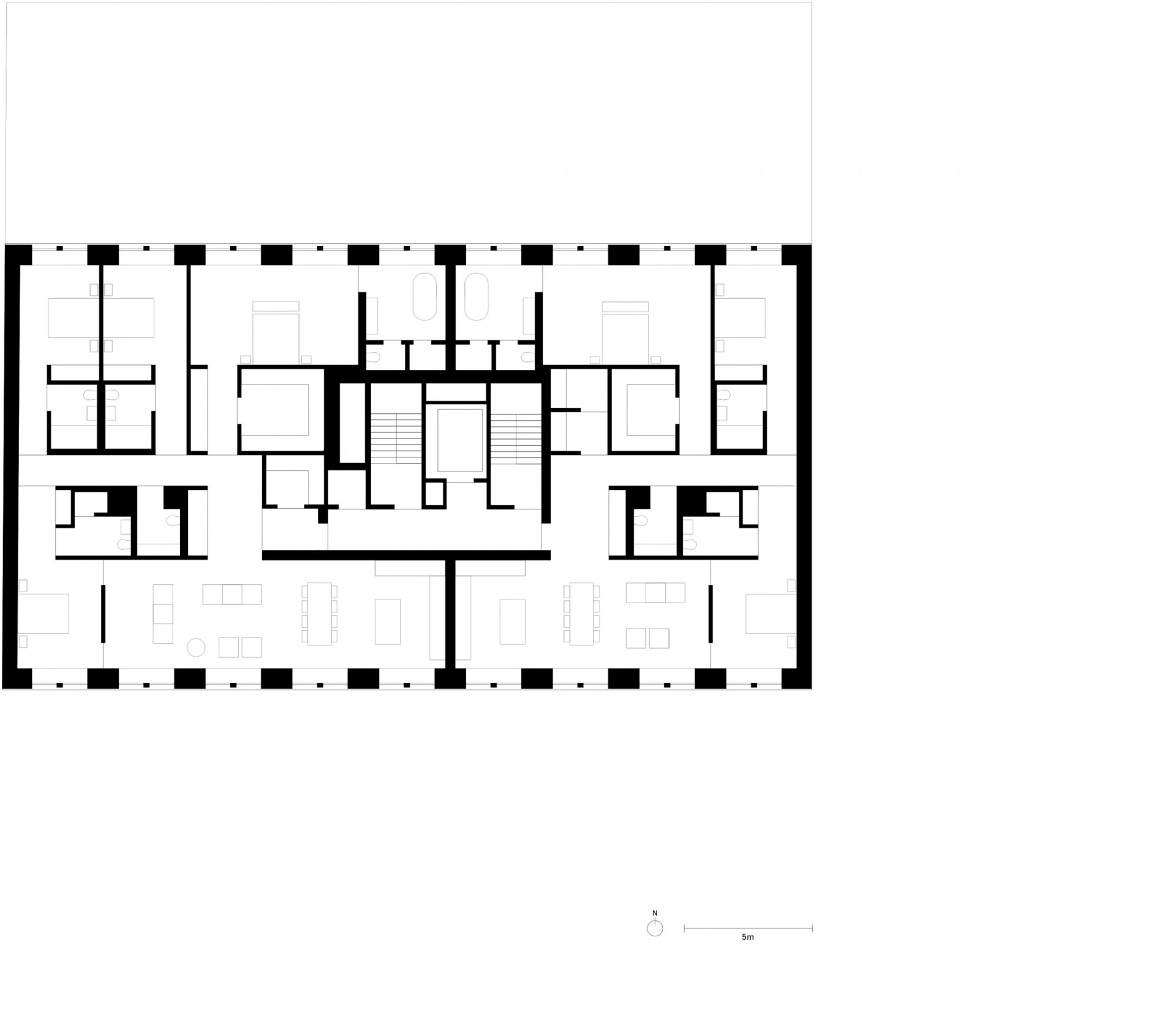 Celý objem plní čistě obytnou funkci, přičemž se v přízemí nacházejí dva mezonetové byty s vlastním vstupem při rozích objektu, v dalších podlažích jsou pak vždy situovány dva prostorné byty a celý objekt zakončuje penthouse, který se velkými okny otevírá do soukromé střešní zahrady. Typ bytů v daných podlažích lze snadno rozpoznat již z ulice, neboť je jednotlivým dispozicím přiřazen různý typ okenních otvorů. Zatímco mezonety se tak do ulice otevírají francouzskými okny, „klasickým“ bytům náleží okna s betonovým okenním překladem a dělicím sloupkem.
