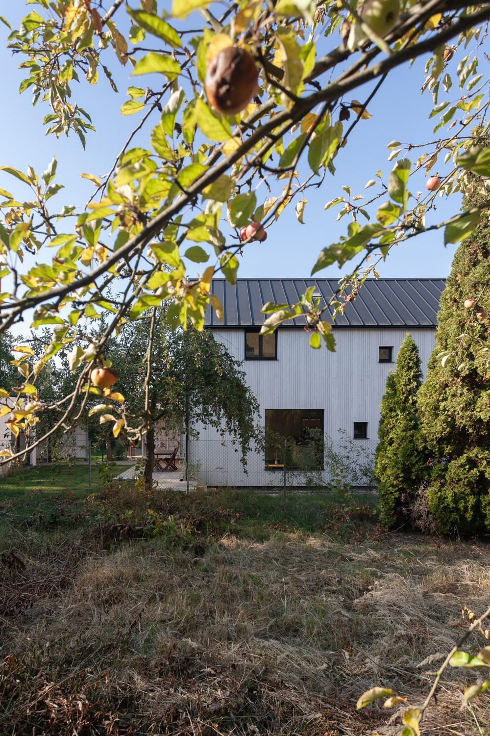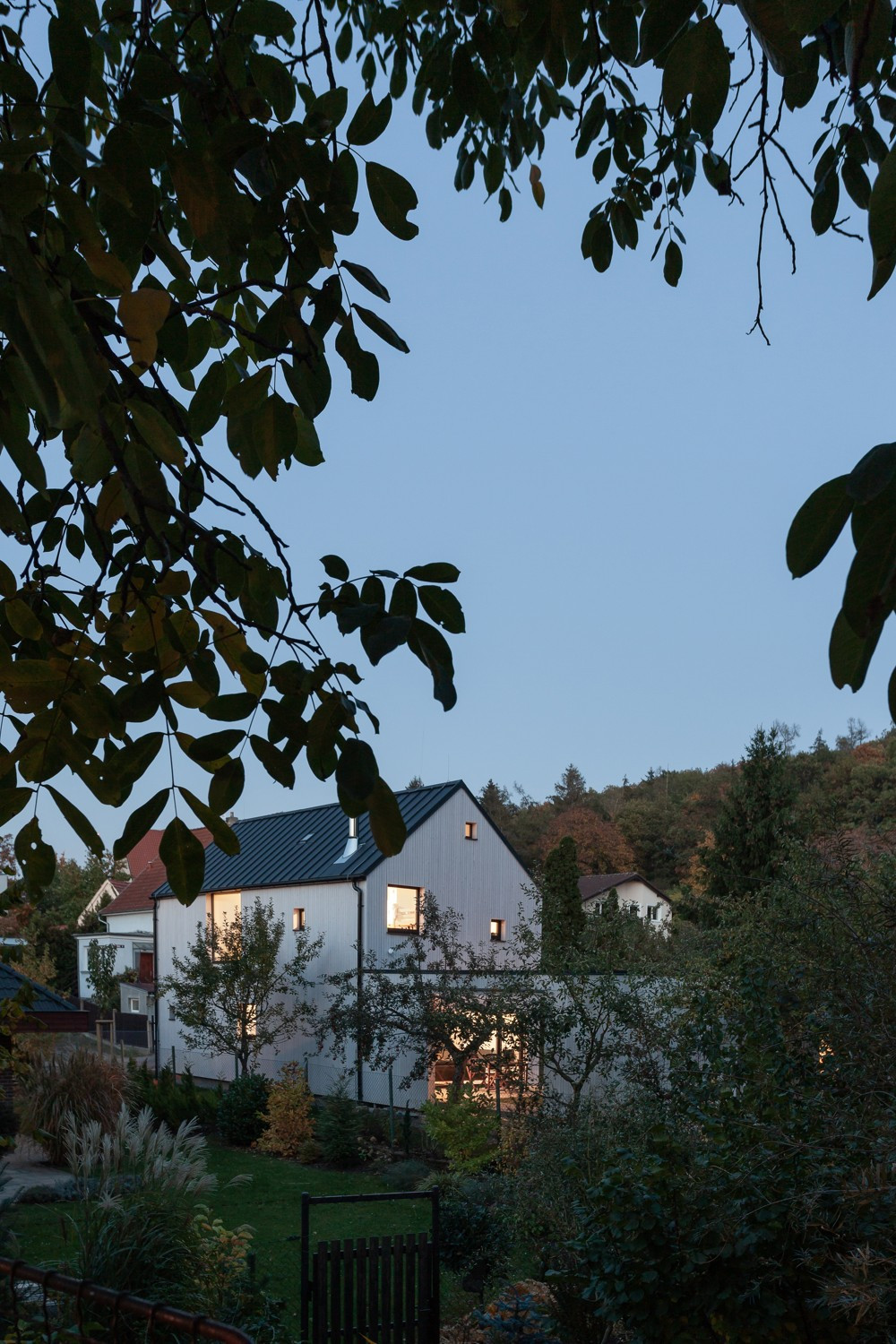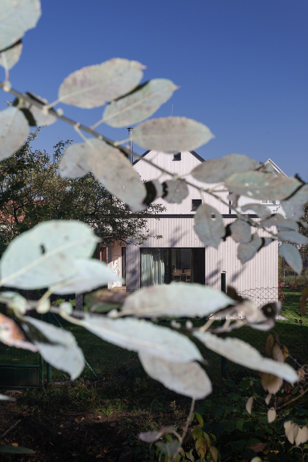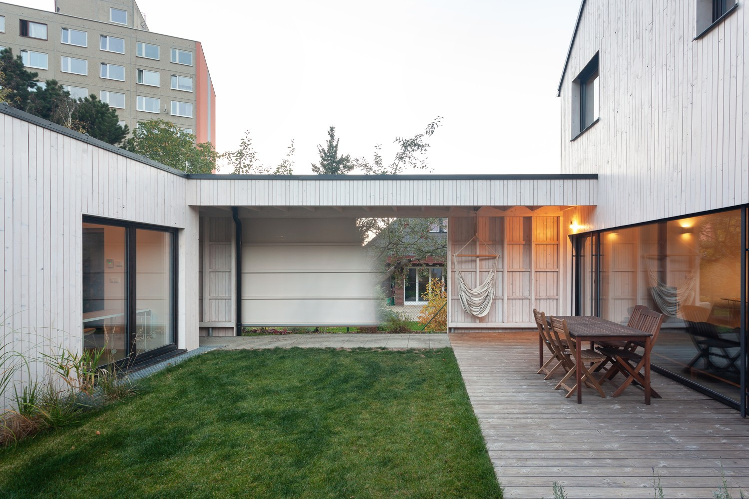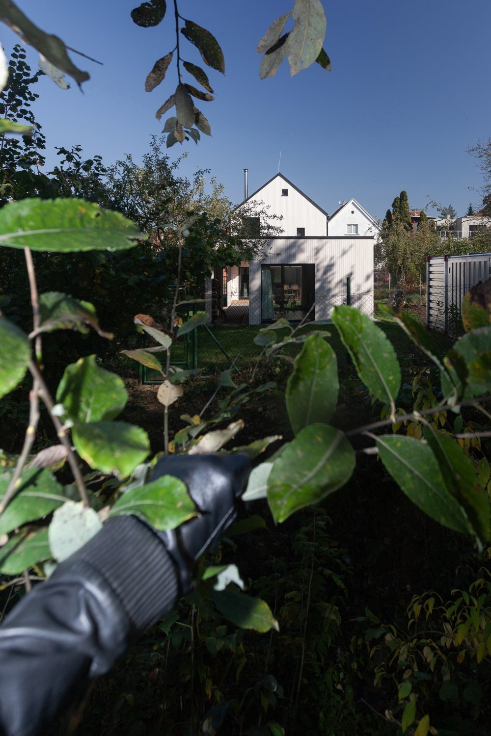 Do okrajové čtvrti Prahy, kde se bytová zástavba panelových domů mísí s rodinnými domky, usadili architekti z místního ateliéru DDAANN rodinný dům, který se uzavírá před hlavní komunikací a naopak otevírá do intimního dvora. Jednoduchá stavba se sedlovou střechou a bilým dřevěným pláštěm ovšem není jedinou stavbou na pozemku. Architekti vytěžili z úzké parcely maximum a rozdělili dům do dvou hmot vzájemně propojených zastřešenou pěšinou. Oba objekty se díky velkým proskleným plochám otevírají klidnému prostoru centrálního dvora a pocitově zároveň zůstávají ve vzájemném kontaktu.