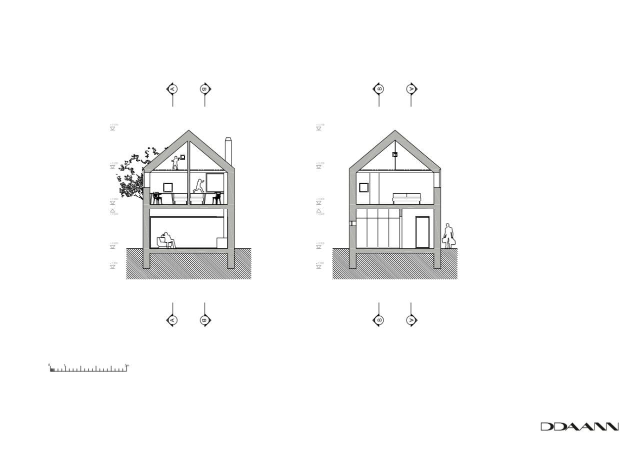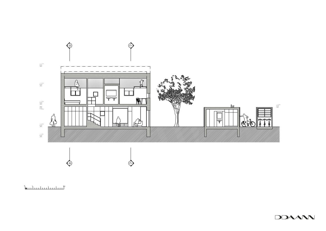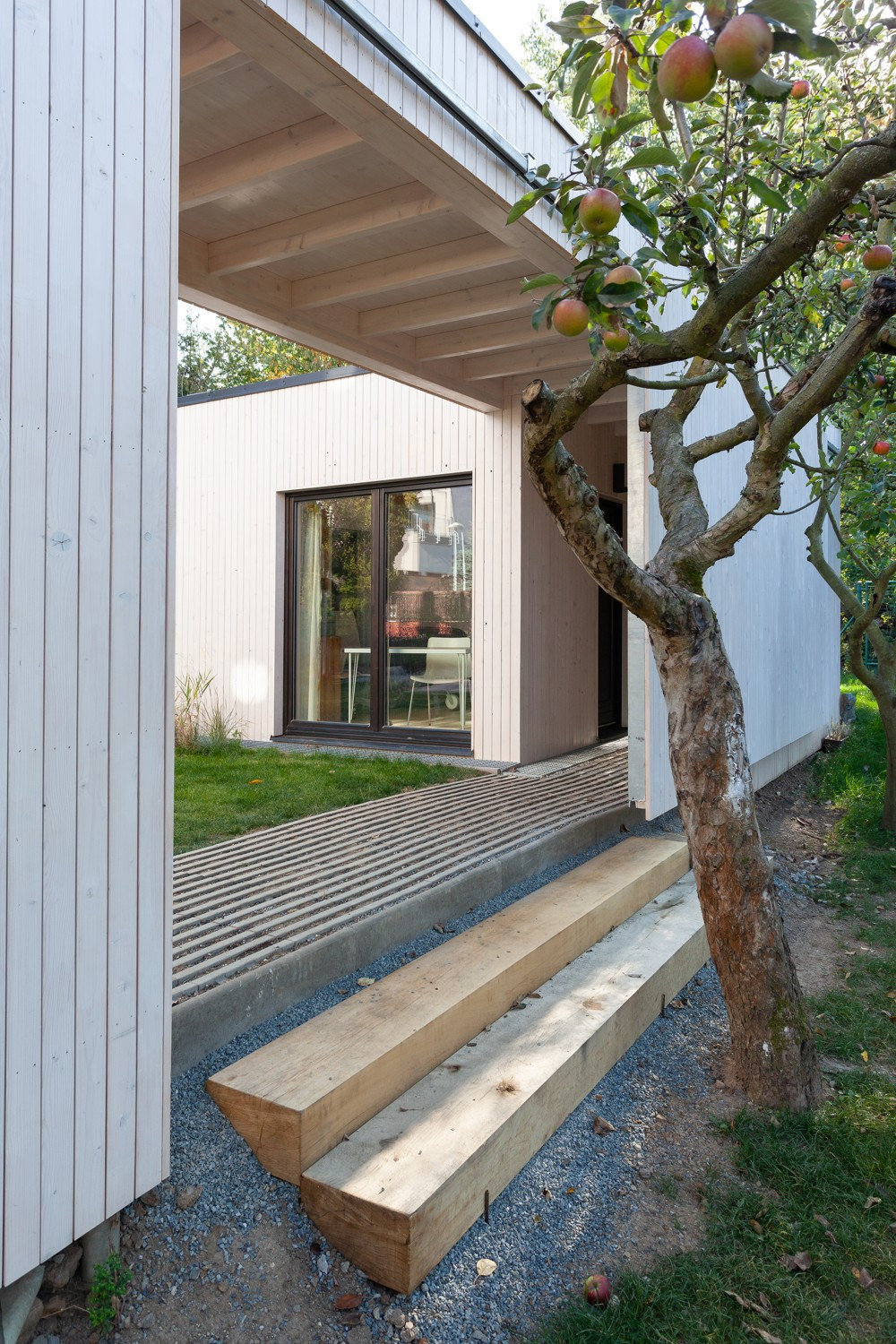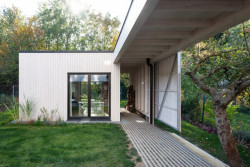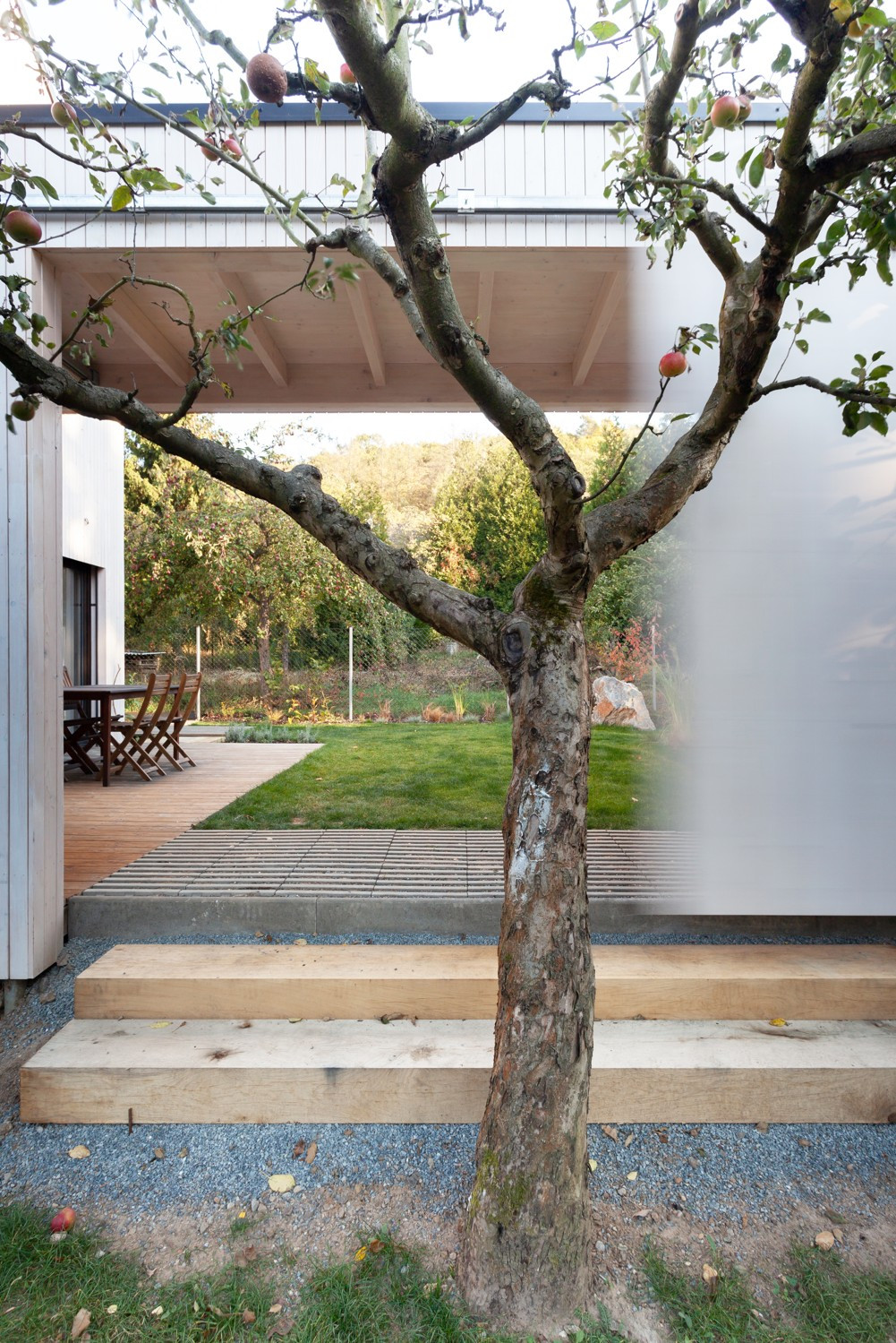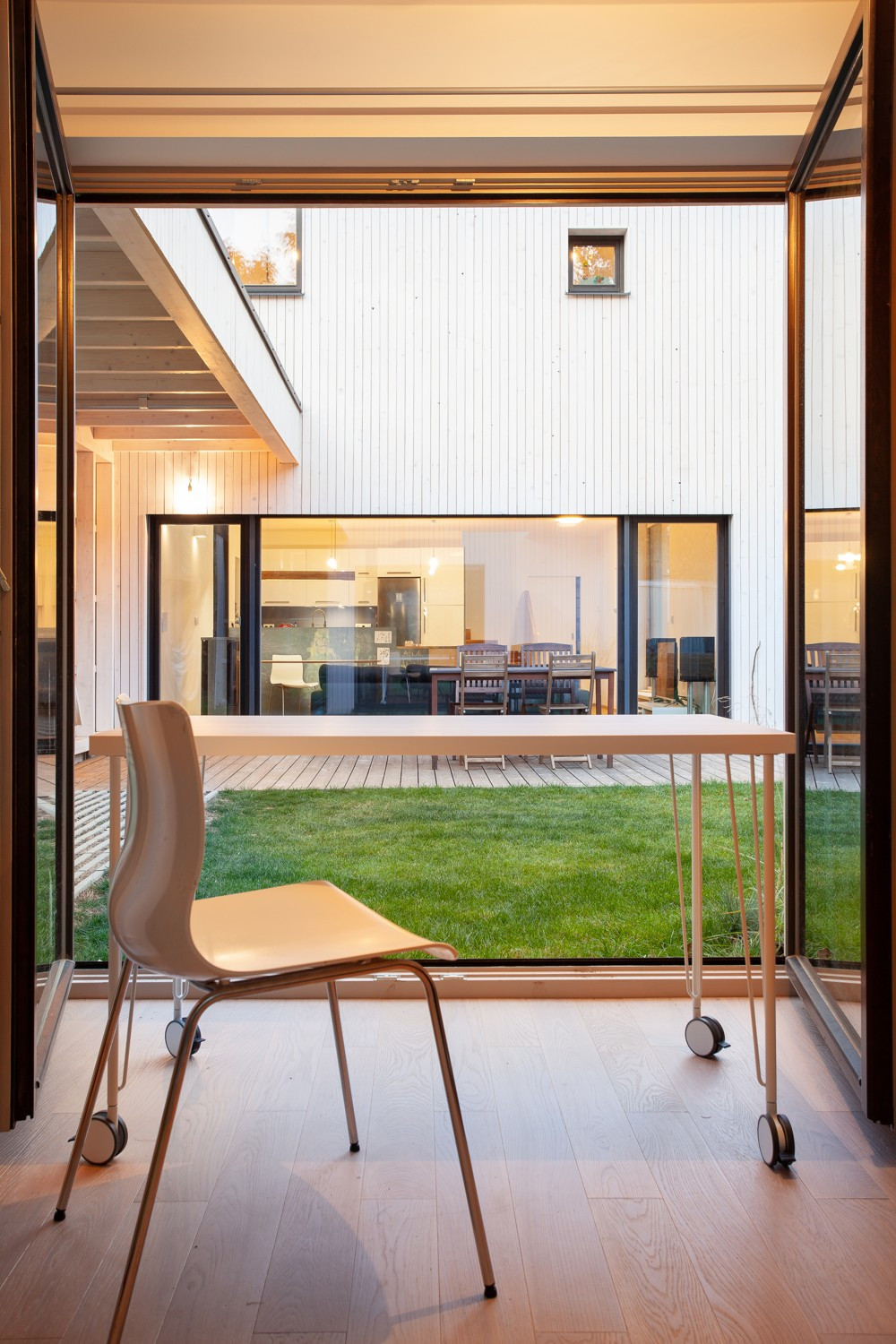 Do okrajové čtvrti Prahy, kde se bytová zástavba panelových domů mísí s rodinnými domky, usadili architekti z místního ateliéru DDAANN rodinný dům, který se uzavírá před hlavní komunikací a naopak otevírá do intimního dvora. Jednoduchá stavba se sedlovou střechou a bilým dřevěným pláštěm ovšem není jedinou stavbou na pozemku. Architekti vytěžili z úzké parcely maximum a rozdělili dům do dvou hmot vzájemně propojených zastřešenou pěšinou. Oba objekty se díky velkým proskleným plochám otevírají klidnému prostoru centrálního dvora a pocitově zároveň zůstávají ve vzájemném kontaktu.