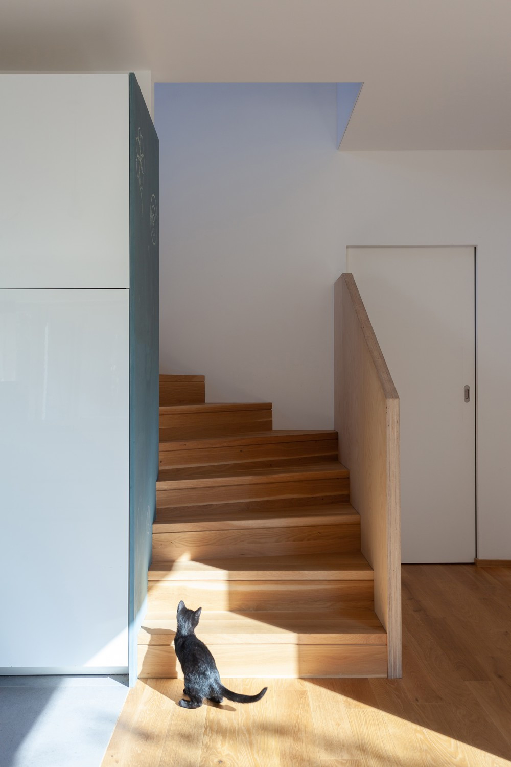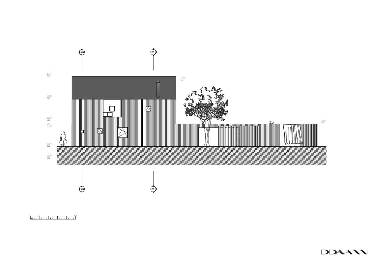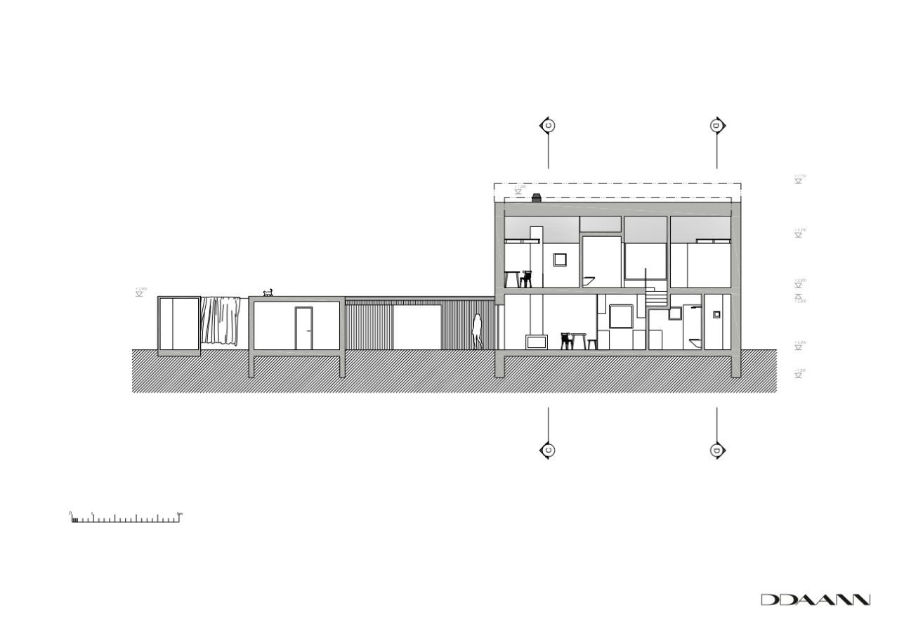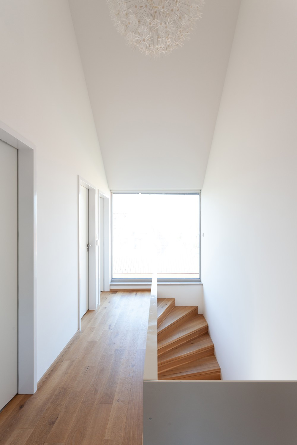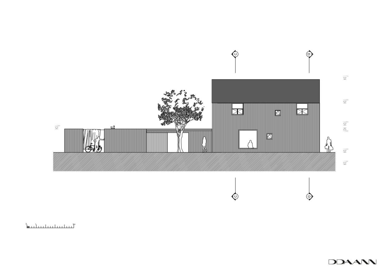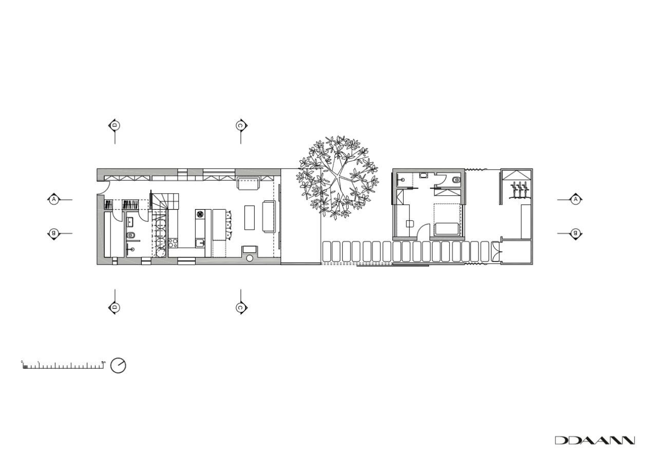 Do okrajové čtvrti Prahy, kde se bytová zástavba panelových domů mísí s rodinnými domky, usadili architekti z místního ateliéru DDAANN rodinný dům, který se uzavírá před hlavní komunikací a naopak otevírá do intimního dvora. Jednoduchá stavba se sedlovou střechou a bilým dřevěným pláštěm ovšem není jedinou stavbou na pozemku. Architekti vytěžili z úzké parcely maximum a rozdělili dům do dvou hmot vzájemně propojených zastřešenou pěšinou. Oba objekty se díky velkým proskleným plochám otevírají klidnému prostoru centrálního dvora a pocitově zároveň zůstávají ve vzájemném kontaktu.