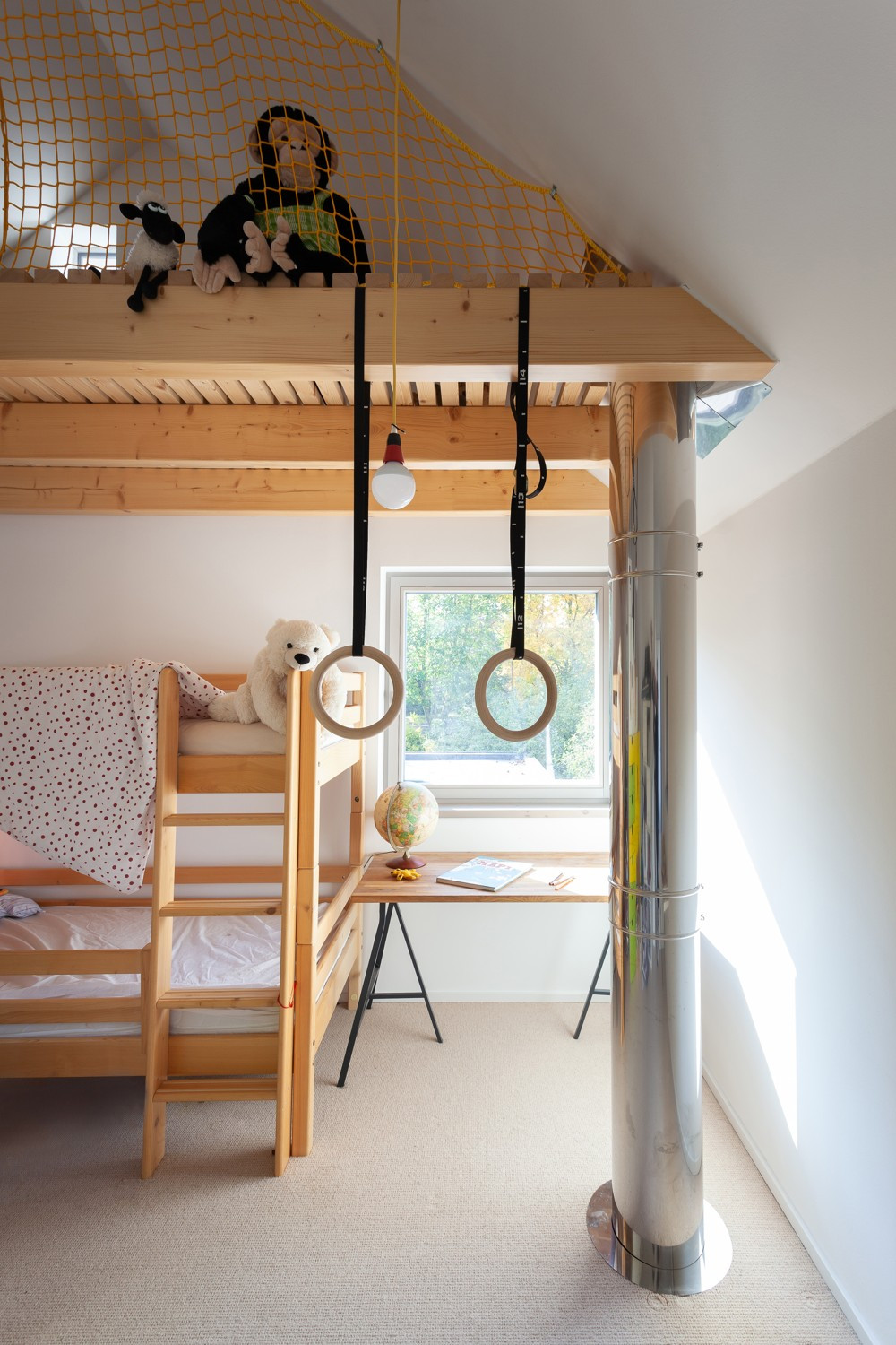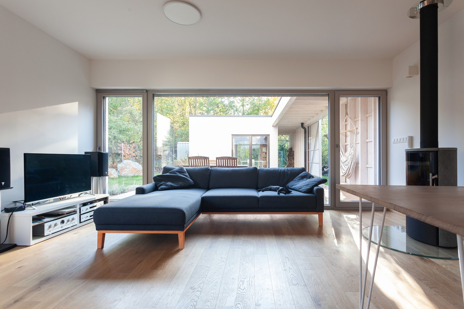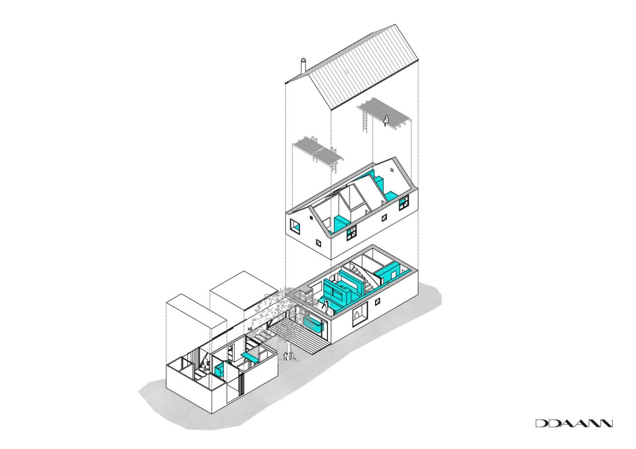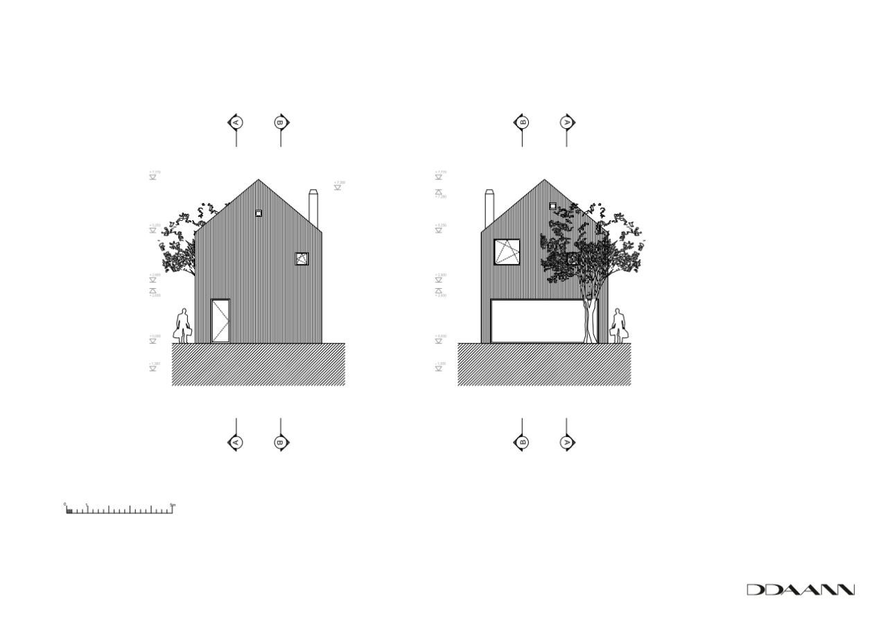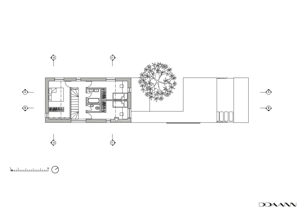 Do okrajové čtvrti Prahy, kde se bytová zástavba panelových domů mísí s rodinnými domky, usadili architekti z místního ateliéru DDAANN rodinný dům, který se uzavírá před hlavní komunikací a naopak otevírá do intimního dvora. Jednoduchá stavba se sedlovou střechou a bilým dřevěným pláštěm ovšem není jedinou stavbou na pozemku. Architekti vytěžili z úzké parcely maximum a rozdělili dům do dvou hmot vzájemně propojených zastřešenou pěšinou. Oba objekty se díky velkým proskleným plochám otevírají klidnému prostoru centrálního dvora a pocitově zároveň zůstávají ve vzájemném kontaktu.