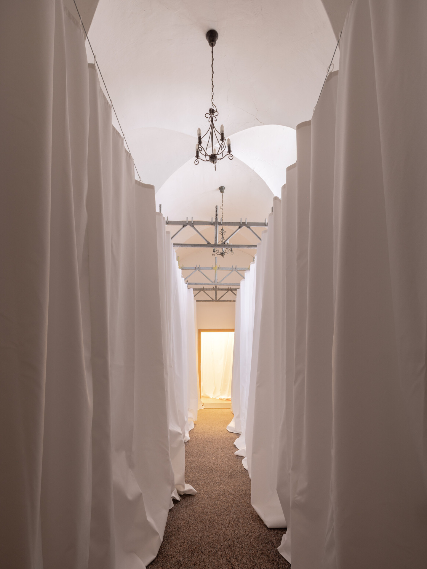 Mezi oponami se projde k centrální „zpovědnici“. Tam člověk může vstoupit do kabiny, zavřít za sebou těžké dveře a užít si moment naprostého ticha. Pokud má na srdci nějaký „hřích“ či zlozvyk, může se svěřit do mikrofonu. Umělá inteligence mu pak poradí, co by měl dělat – a vytiskne ůčtenku s radou, která ovšem dost často prozradí, že její autor AI toho o lidských slabostech moc neví. A je tedy další důvod se zasmát.