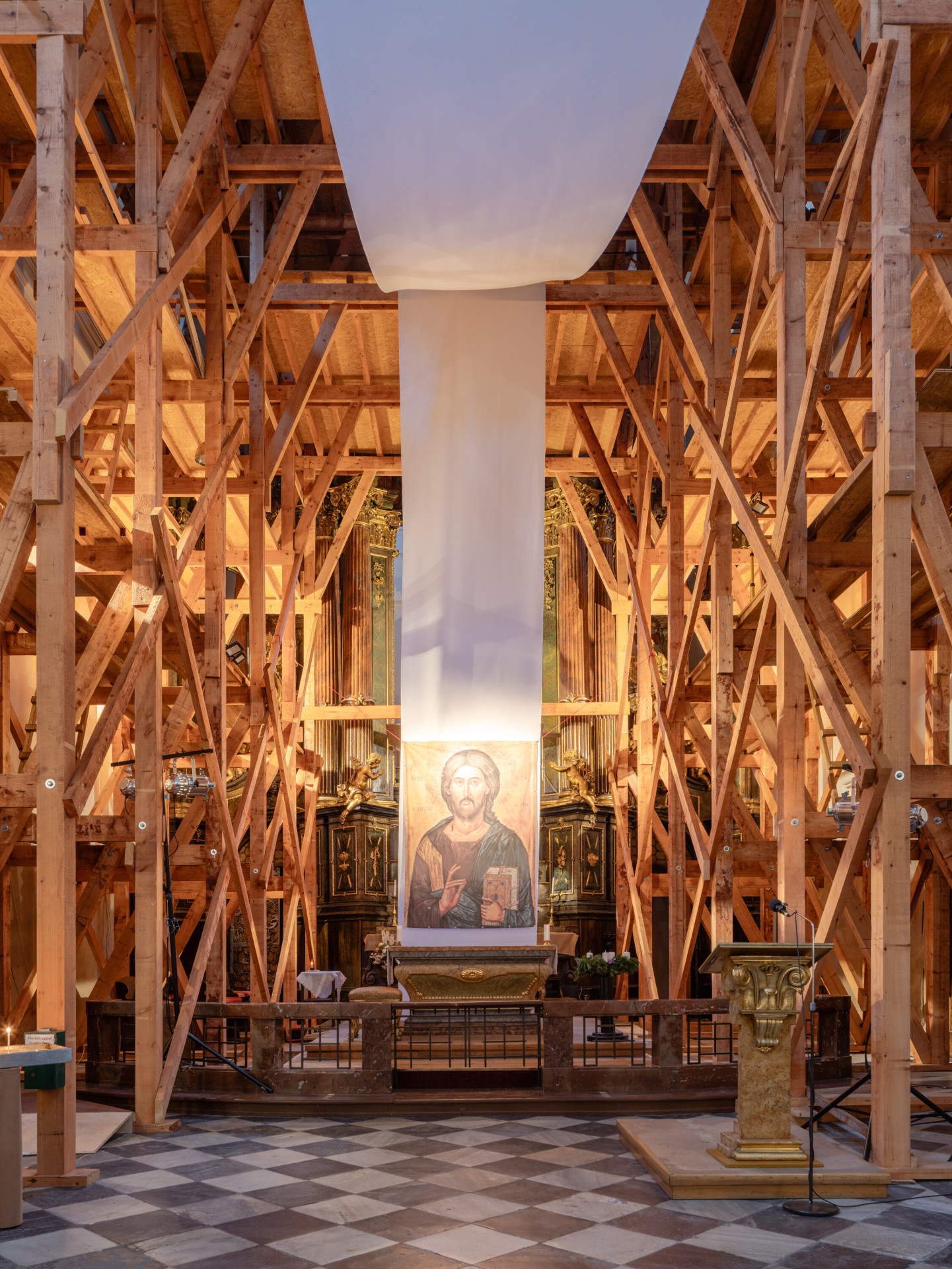 Z venkovního prostoru lze bočním vchodem vstoupit také do kostela Maří Magdaleny, i sem zasahuje instalace a potkává se s barokem a funguje to jako "prostor pro sklidnění", jak to popisují architekti.