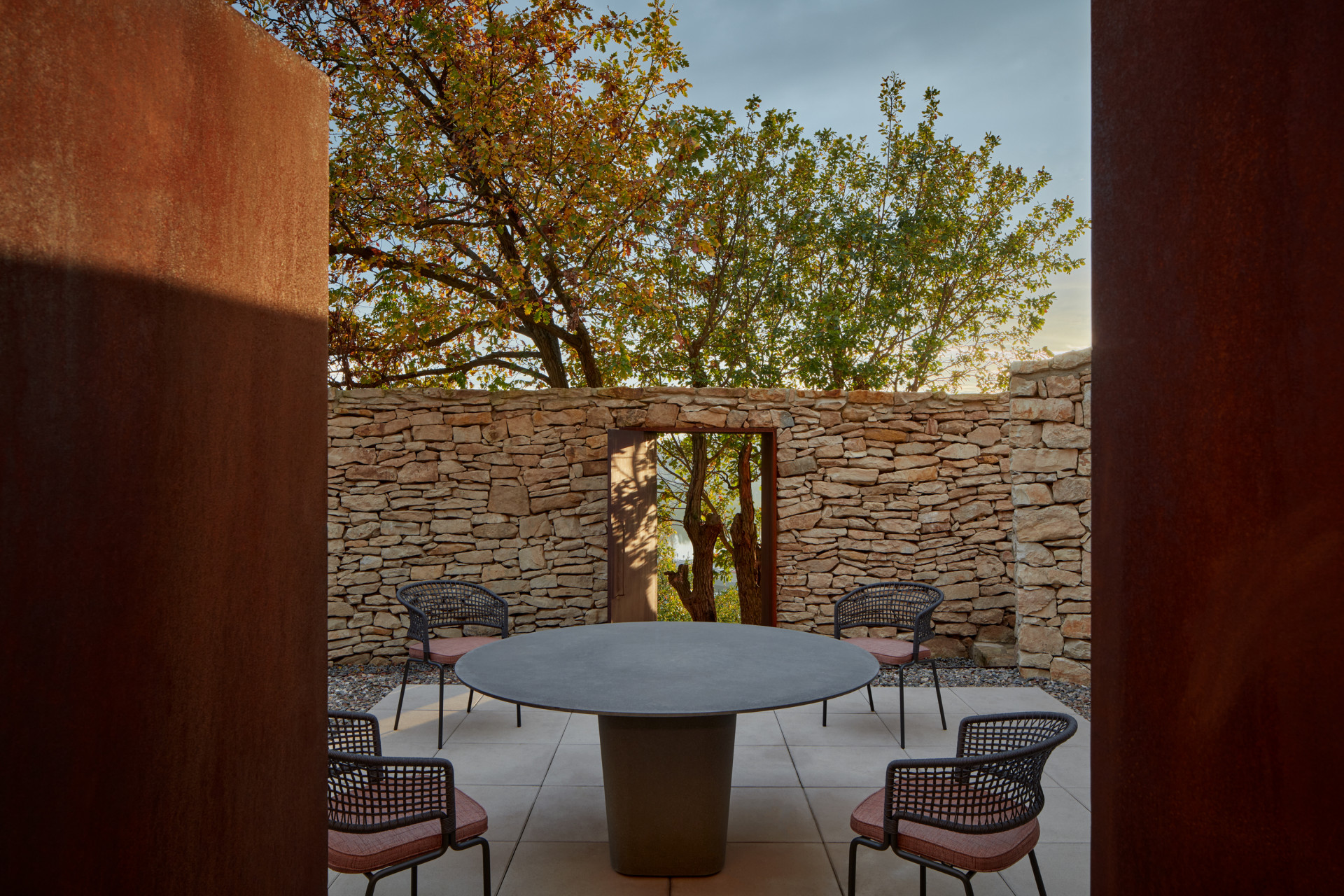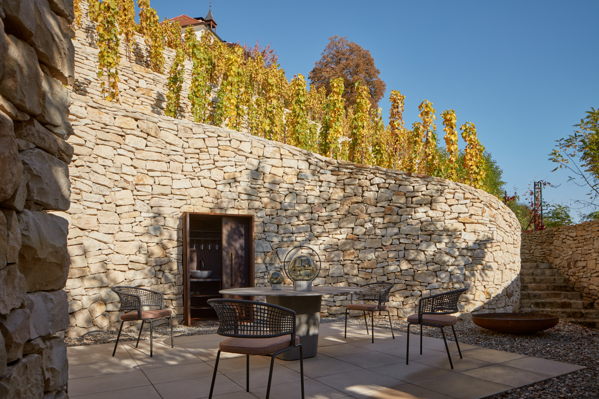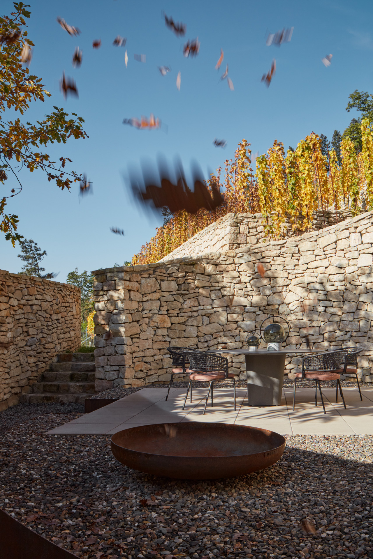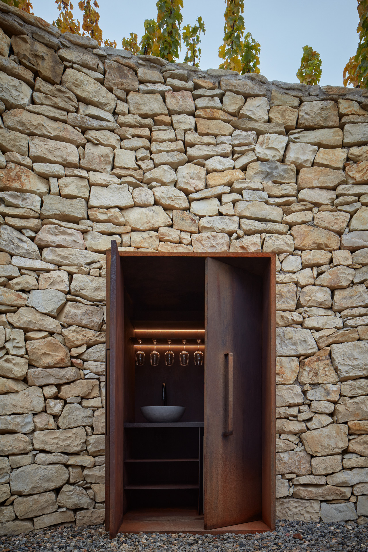 Degustační prostor formuje terasa s posezením zasazená mezi nově vybudované kamenné zdi. Směrem dolů ze svahu jsou do jedné z nich zasazené dveře, který mi se, pokud jsou otevřené, dá prohlédnout k Vltavě. Je tady taky nika, malý vinný sklípek pro servírování vín produkovaných vinařstvím, nebo ohniště. Všechny tyto prvky jsou navrženy z kortenu.