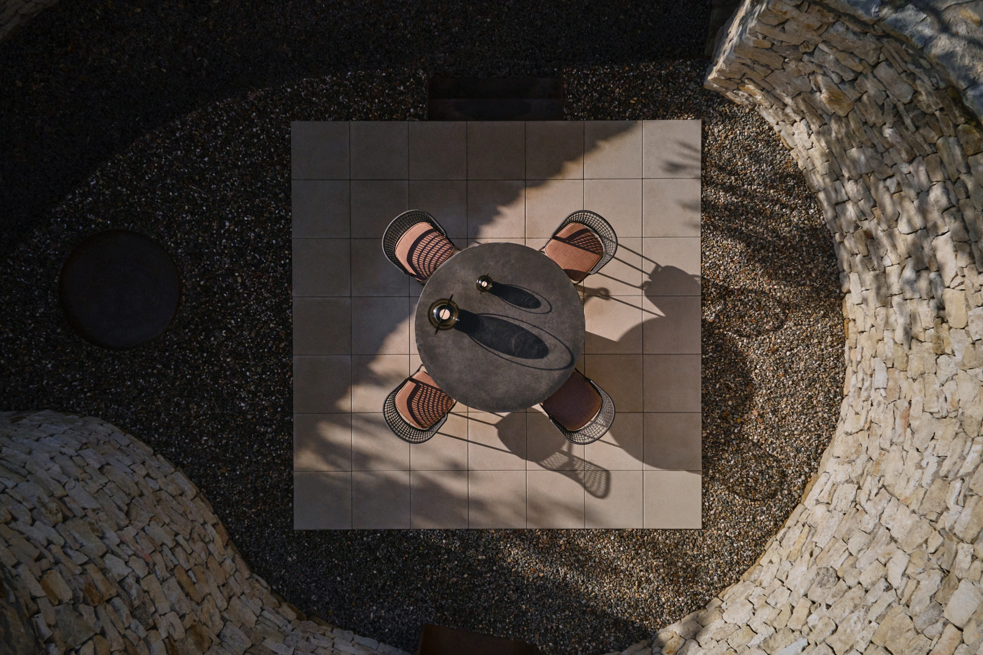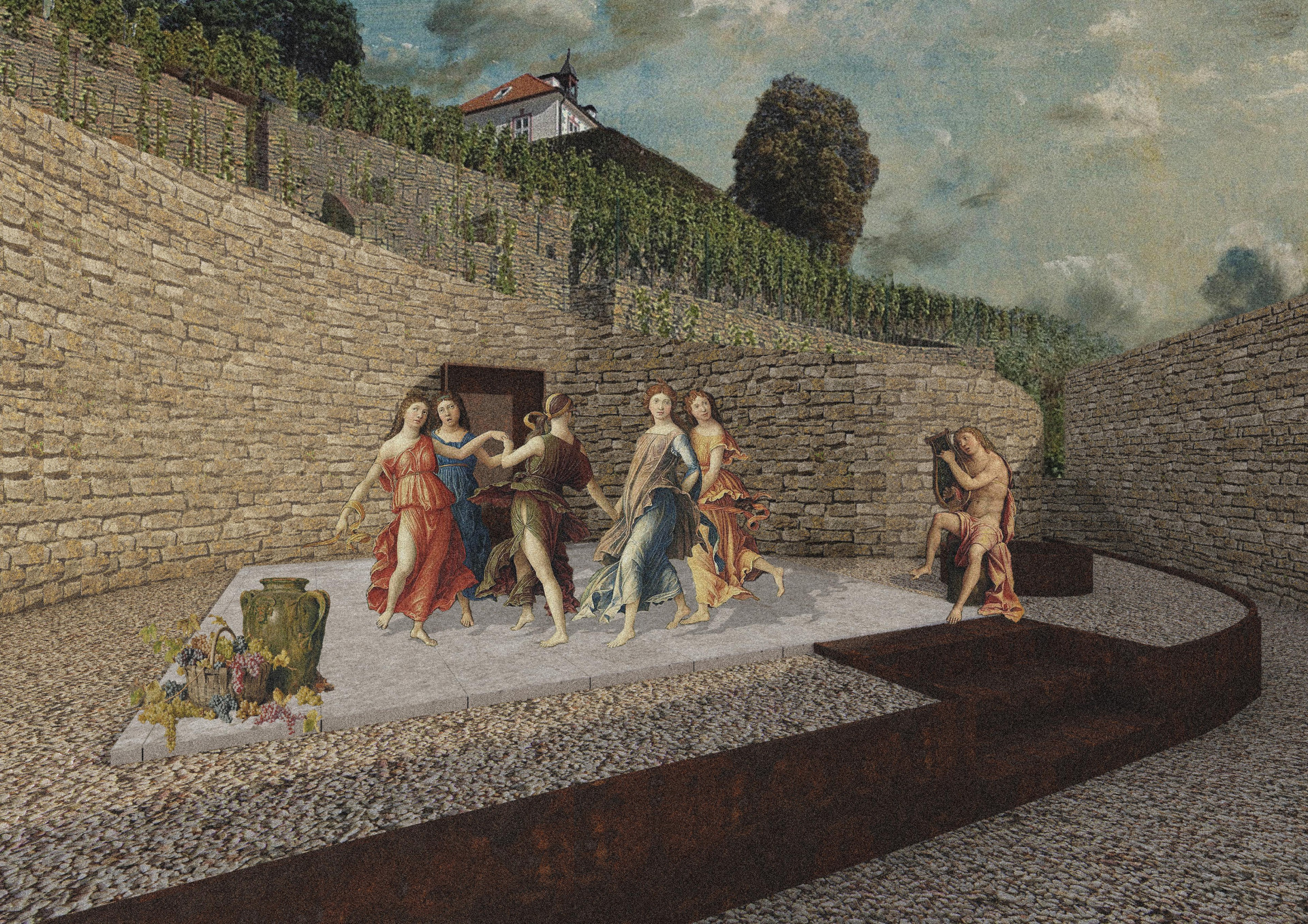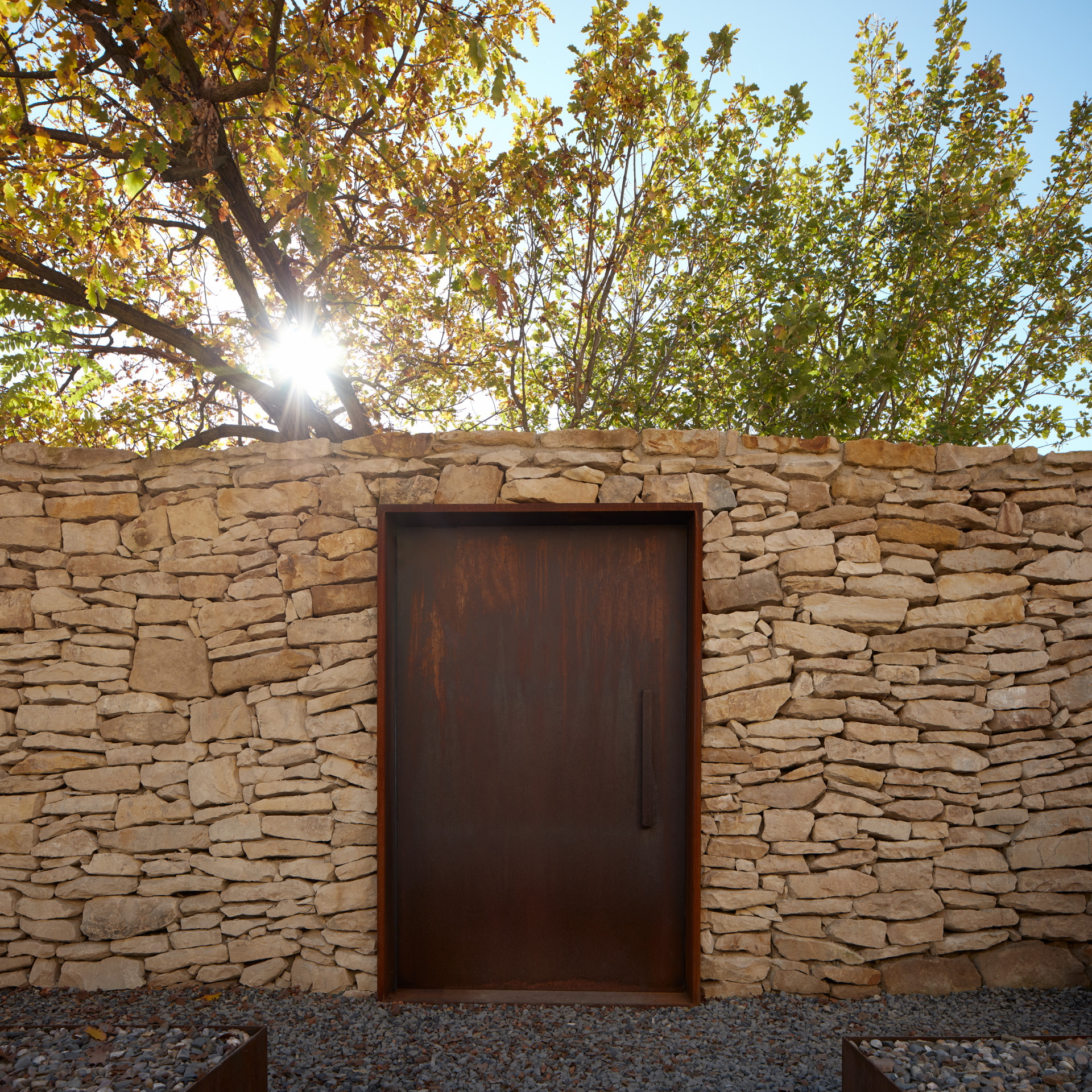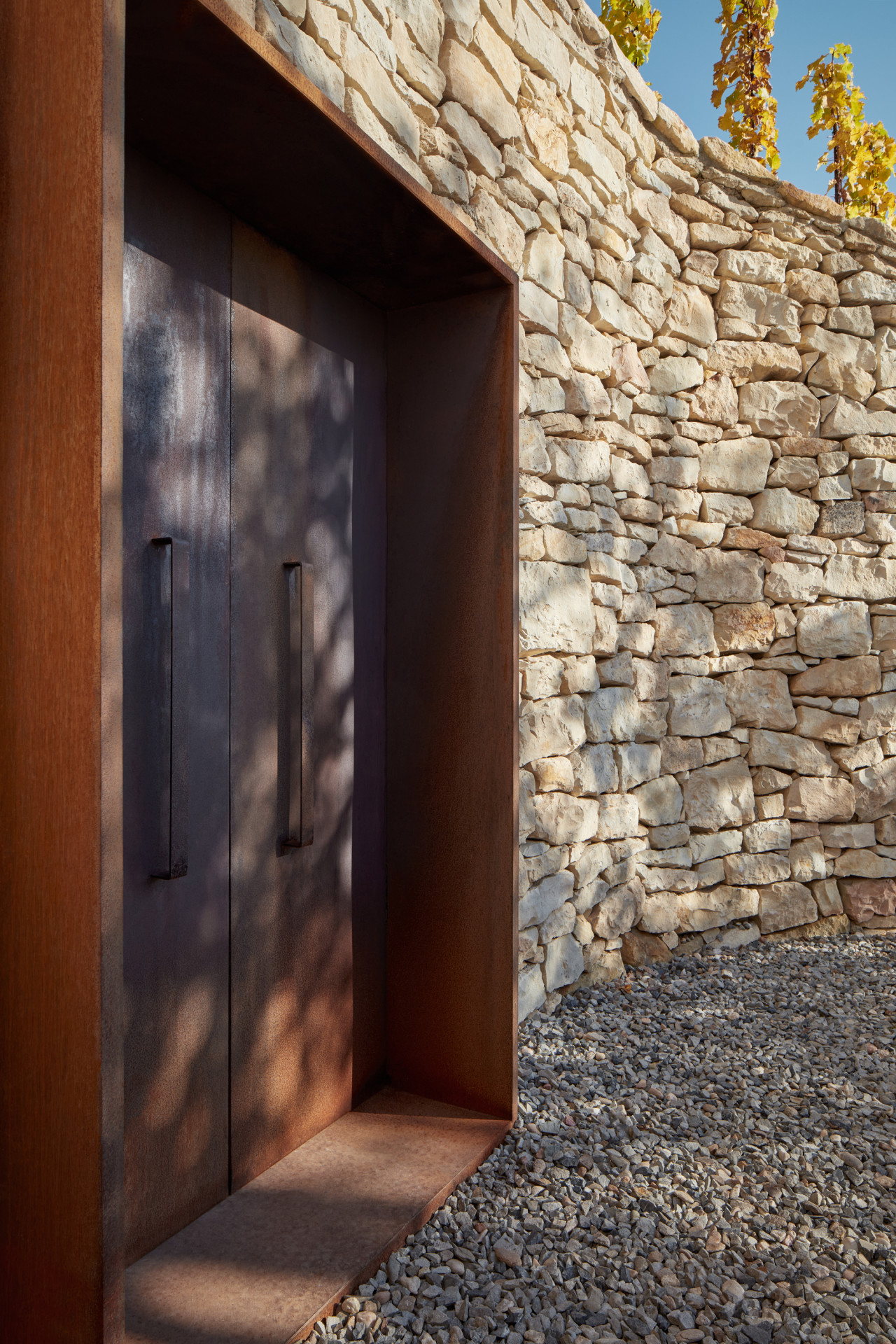 Degustační prostor formuje terasa s posezením zasazená mezi nově vybudované kamenné zdi. Směrem dolů ze svahu jsou do jedné z nich zasazené dveře, který mi se, pokud jsou otevřené, dá prohlédnout k Vltavě. Je tady taky nika, malý vinný sklípek pro servírování vín produkovaných vinařstvím, nebo ohniště. Všechny tyto prvky jsou navrženy z kortenu.