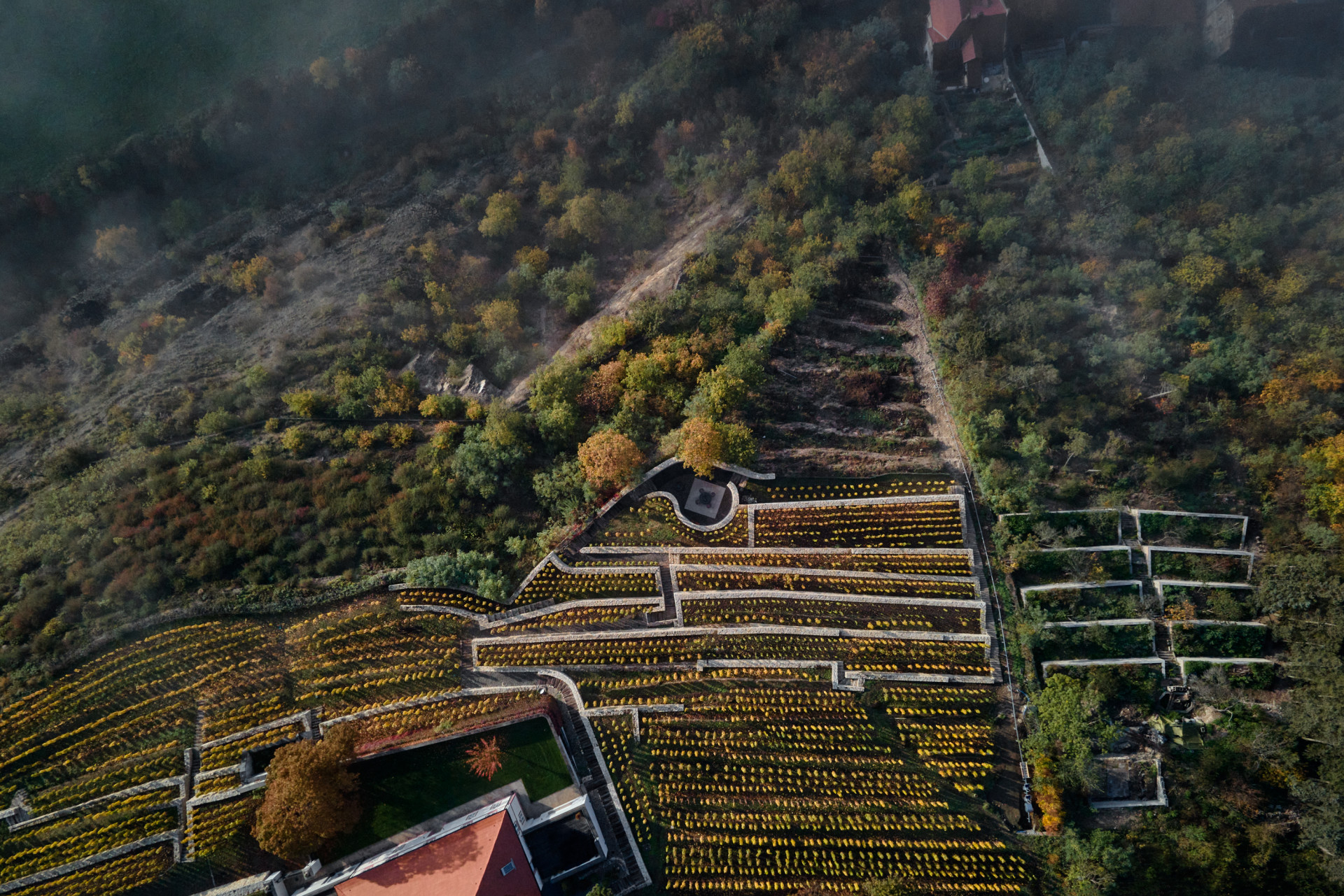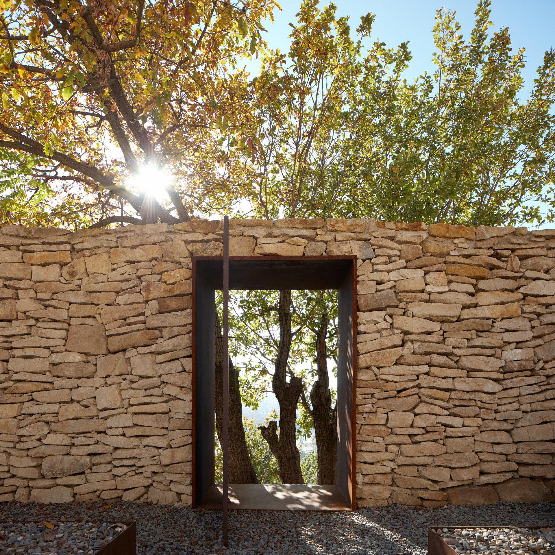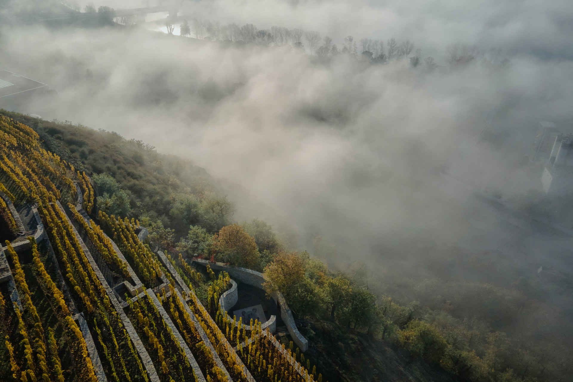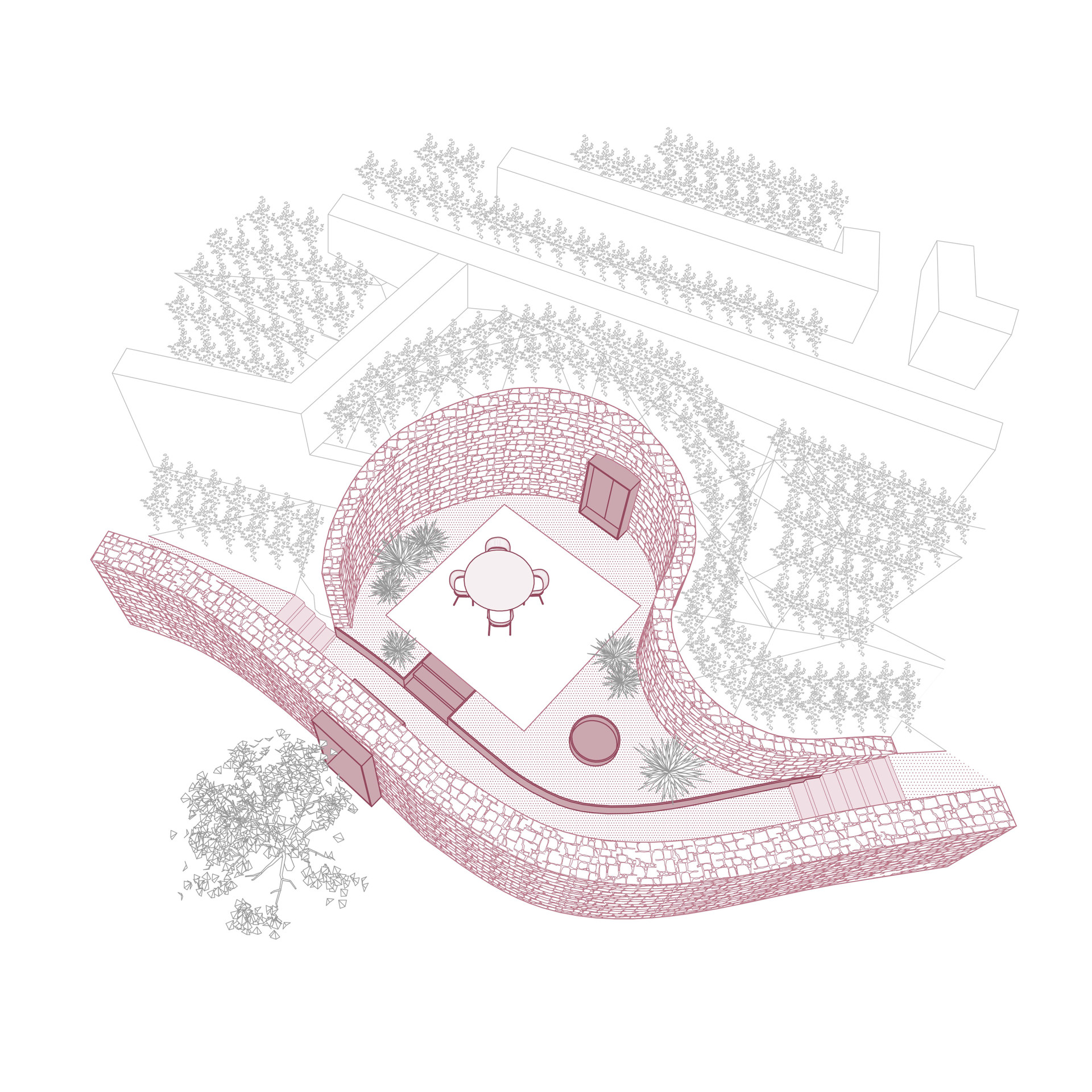„Při budování terasovitého vinohradu byla odkryta kamenná ruina jakéhosi zakřiveného prostoru,“ říká Marco Maio. Lomový kámen, konkrétně opuka, je přítomný v celém vinohradu. Jsou z něj všechny zídky postupně obnovované asi od roku 2013. Fibonacci na tuto skutečnost navazuje, a právě za to byl oceněn v rámci České ceny za architekturu 2023.