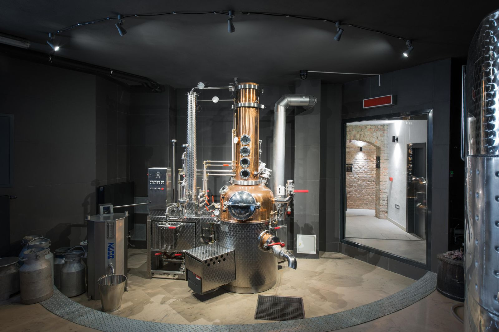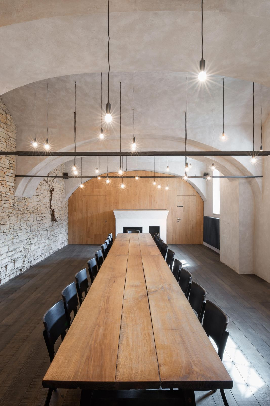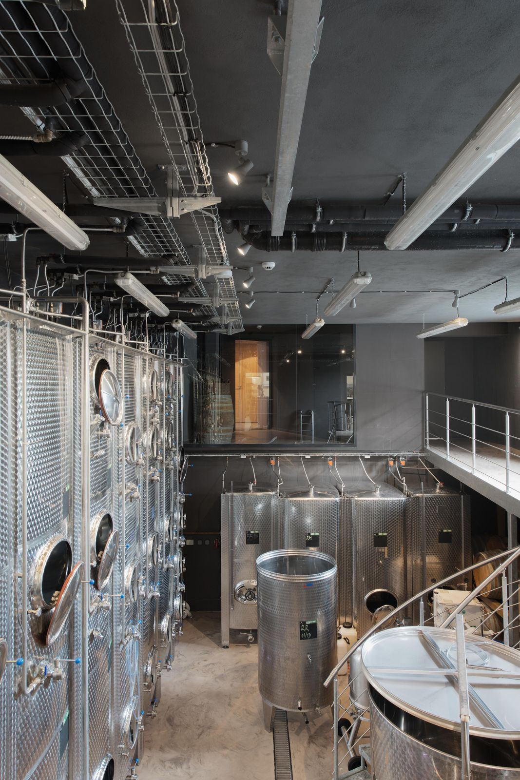 Kombinací štuku a kameninového obkladu se vyznačuje i degustační sál, který zachovává jednotný styl i díky dřevěné podlaze. Celému sklípku potom dominuje dlouhý hodovní stůl. Prostory určené výrobě vína si zachovávají svou utilitárnost, nicméně i jim O.T.A. vtiskli nezaměnitelný charakter. Zdi zůstávají stroze šedé a technická infrastruktura odhalená – dokonce i radiátory se musí černým nátěrem podřídit přísné strojové logice. V útrobách celého vinařství nakonec nalézáme i palírnu: ta je zde prezentována jako děj na jevišti, které je naznačeno půlkruhově ustoupenou podlahou a divadelním nasvětlením.