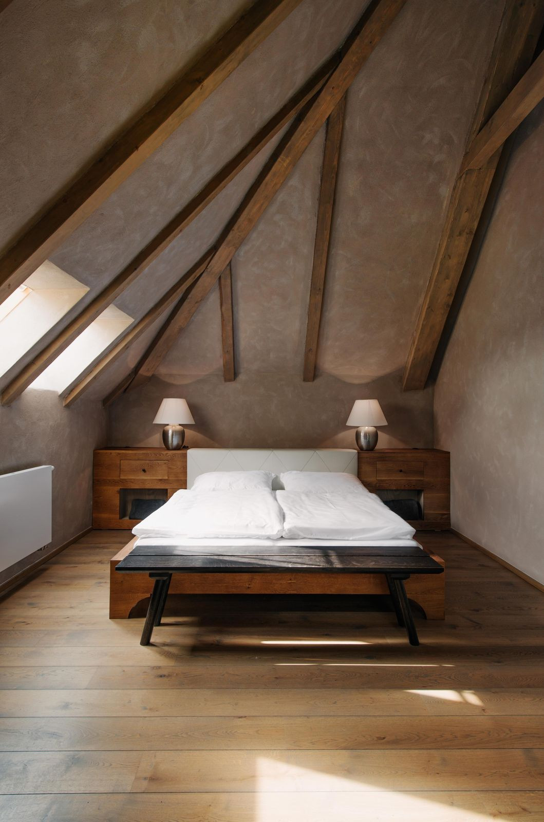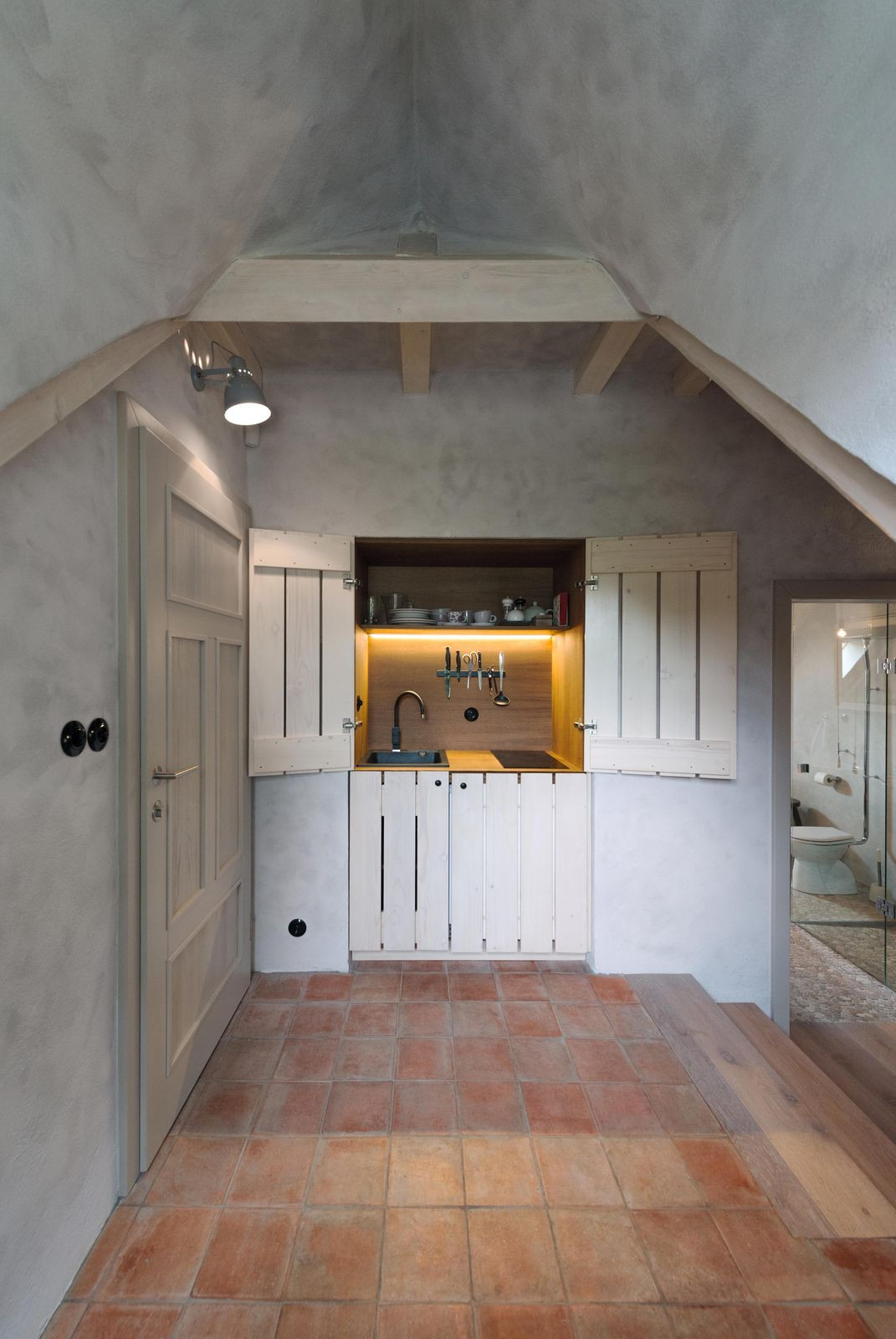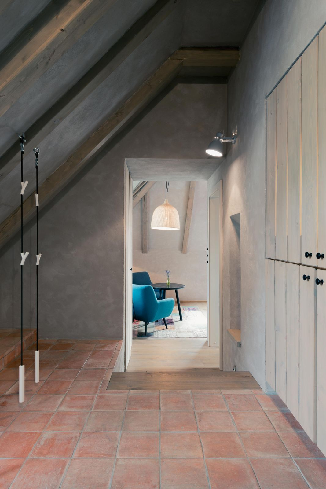 O.T.A. dostali za úkol dát novou tvář interiérům výroby vína, degustačního sklepa a apartmánů. Během realizace bylo třeba upravit stávající dispozice objektu. Společným rysem vnitřních prostor jsou přiznané materiály. Stěny a stropy apartmánů v podkrovním patře nesou patrné rysy benátského štuku, trámy a střešní konstrukce zůstávají odhalené. Interiér si tak nese hrubý (ale ne drsný), téměř rustikální ráz. Pokoje mají minimum nábytku, jehož prosté provedení šikovně podtrhuje charakter a výhody použitého materiálu. Dveře skříní či kuchyňského koutu tak například působí dojmem starých okenic a zároveň dobře slouží svému účelu. Podlahy doplňují celkově jednoduché pojetí: tvoří je buď dřevěná prkna, nebo dlaždice cihlového zabarvení či povrchy imitující kameninu.