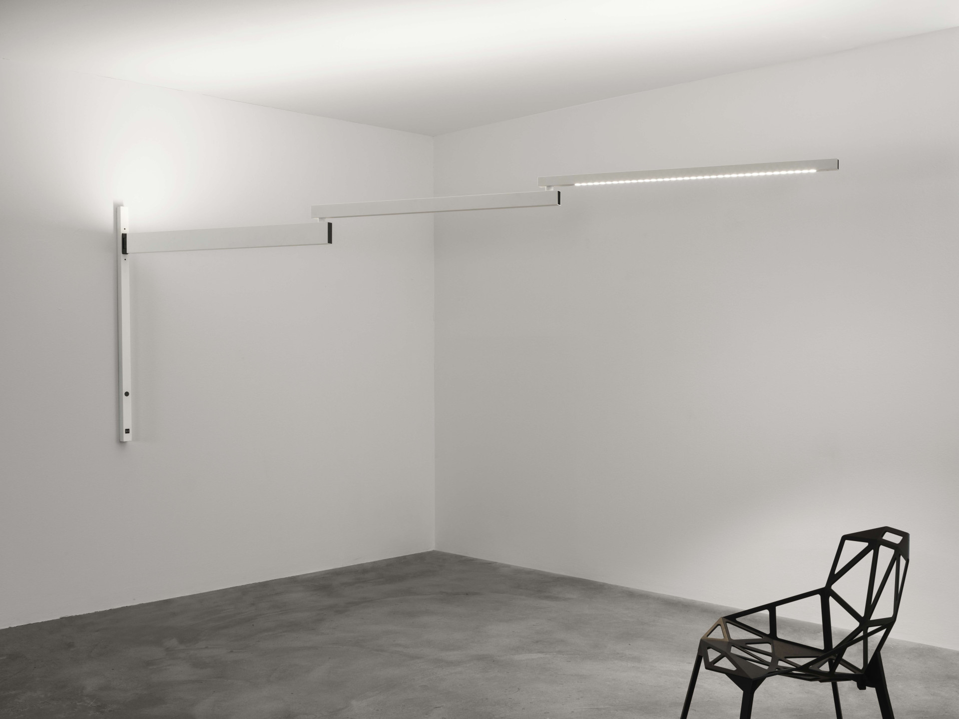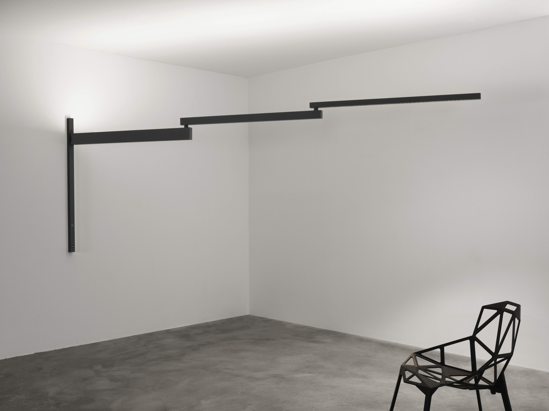Při „správném větru“ vlaje do prostoru, při „bezvětří“ o něm ani nevíte. Německý designér Konstantin Grcic, pro kterého jsou geometrické tvary a nečekané úhly charakteristické, vytvořil nástěnné výsuvné svítidlo Black Flag, které svou plastičností a variabilitou připomíná vlajku. Ačkoliv se jedná o nástěnnou lampu, funkčností směle konkuruje centrálnímu osvětlení. Při „bezvětří“ diskrétně vyčkává na svůj čas a prostor, nenápadně složena na stěně. Po rozložení se však se svým 3,5 metrů dlouhým ramenem promění v plnohodnotný osvětlující zdroj.