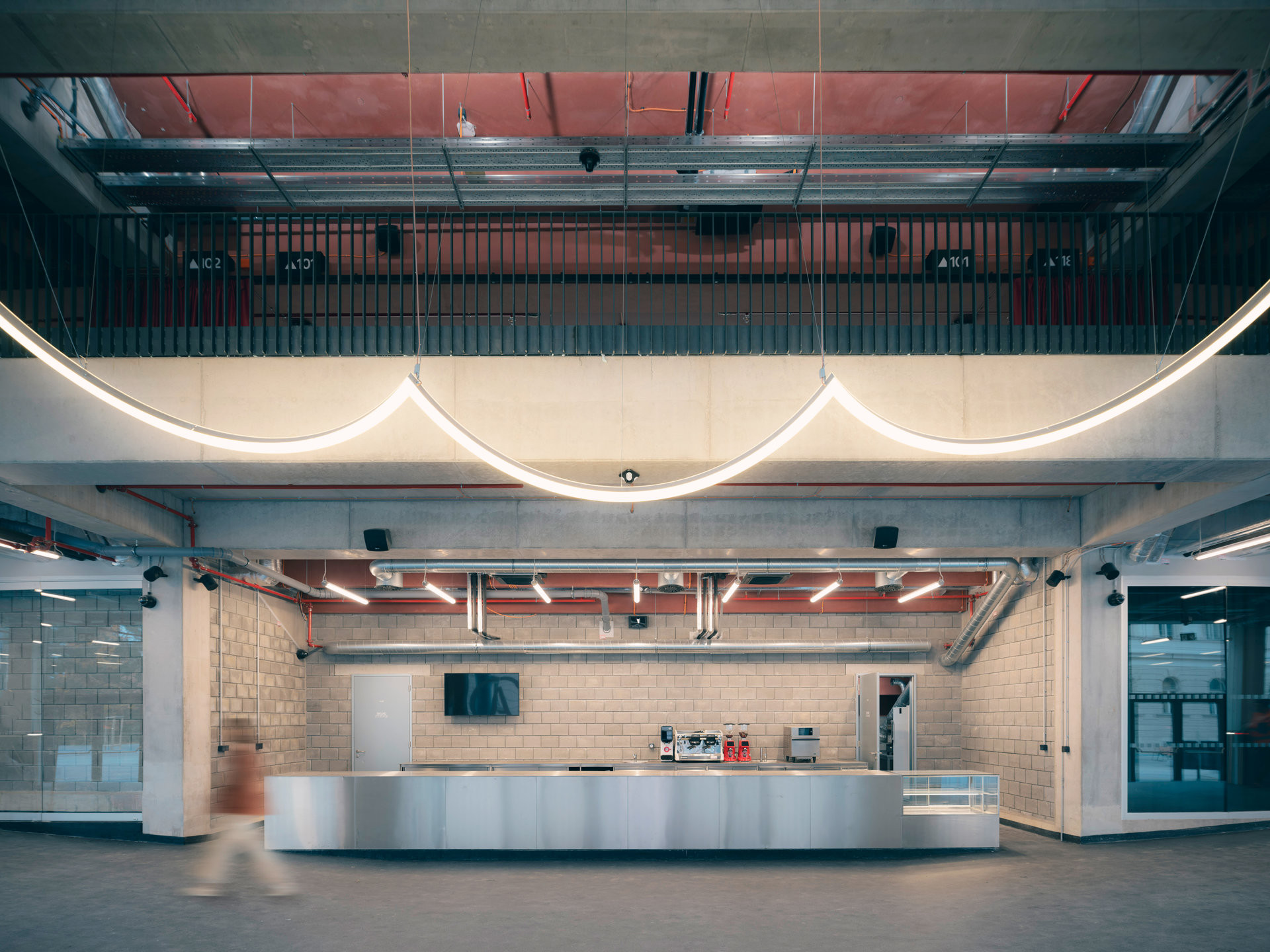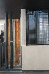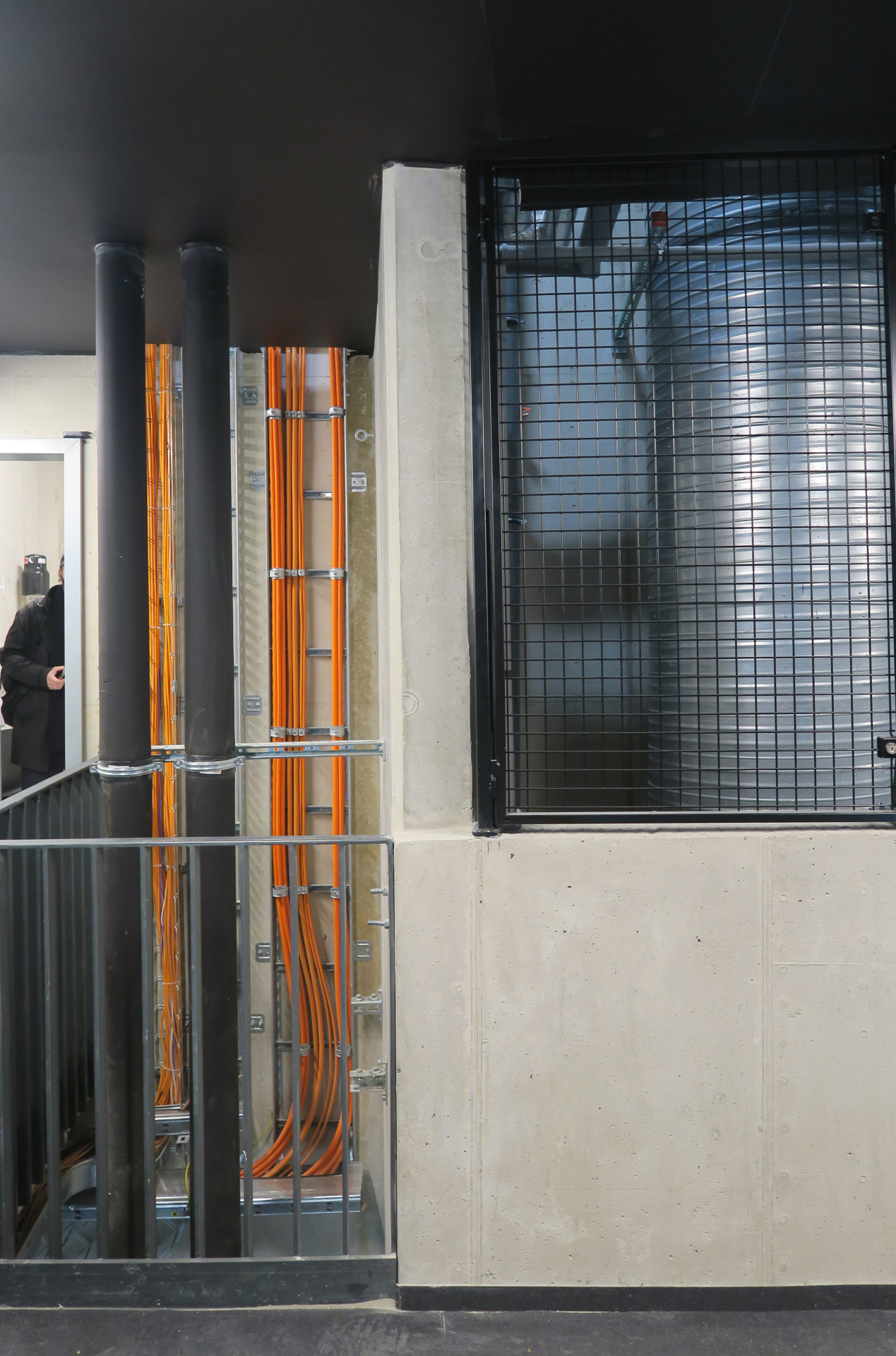 „Máme tady pohledové betony, na které by byli ve Švýcarsku pyšní,“ říká Ondřej Chybík a ukazuje přitom na přiznané rozvody technologií a dodává, že jde vlastně o „brutální“ stavbu. Materiály se zde skutečně za nic neskrývají, všechno je přiznané a čitelné.