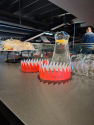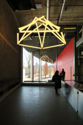 Designové prvky se objevují i na dalších místech grandiózního prostoru amfiteátru. Mezi betonovými tvárnicemi září skleněné trojúhelníky od sklárny Bomma, v gastro provozech visí výrazné lustry ze skleněných trubic. Každý z nich je originál a vyrobila je česká firma Tech-fabrika, která se jinak věnuje především neonům pro komerční firmy.