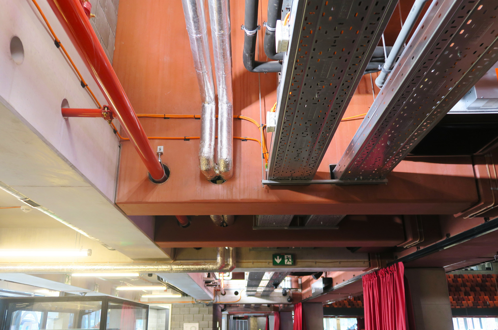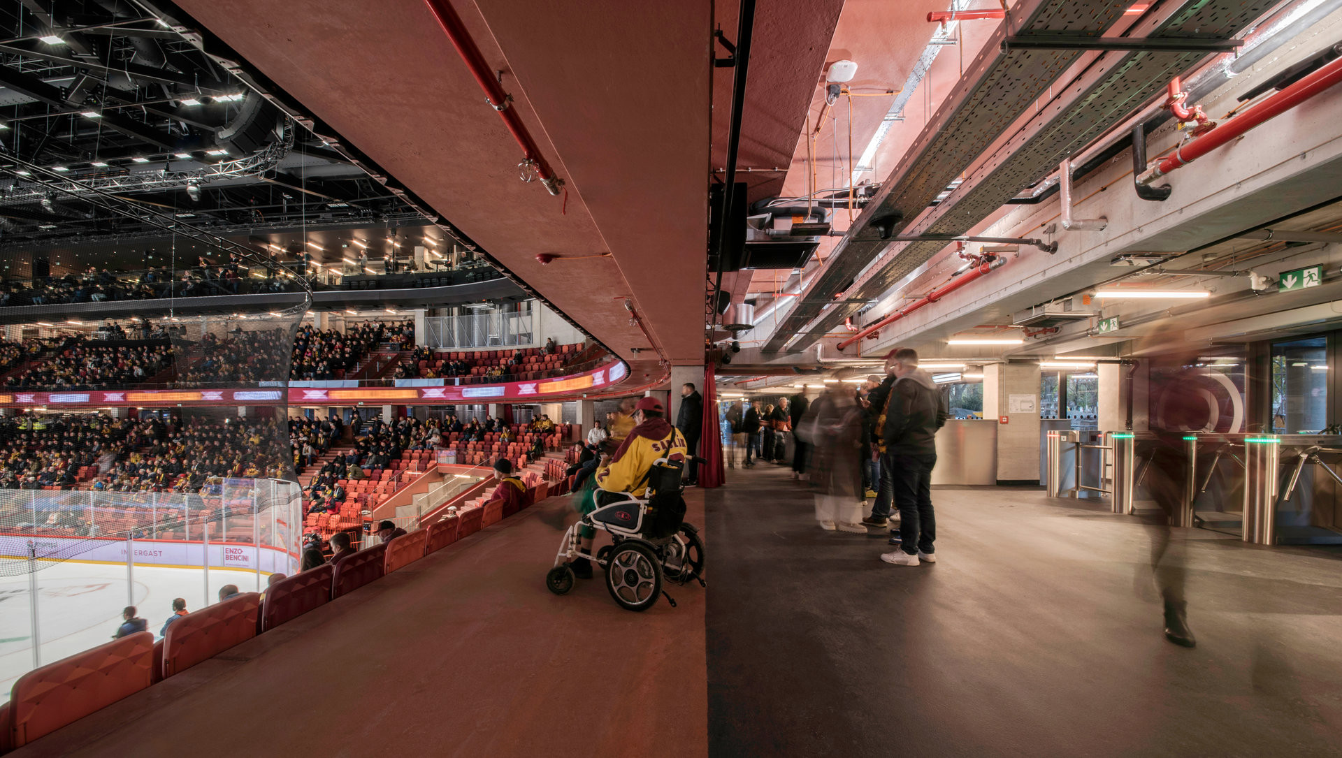 Svým způsobem dekorací jsou i ony dokonale provedené pohledové rozvody technologií, vedené po stěnách a stropech. Při prohlížení precizně navržené a zrealizované stavby se nám v hlavách proto vynořuje otázka: jsou to vhodná řešení pro prostor, který zažije nejeden bujarý hokejový zápas?